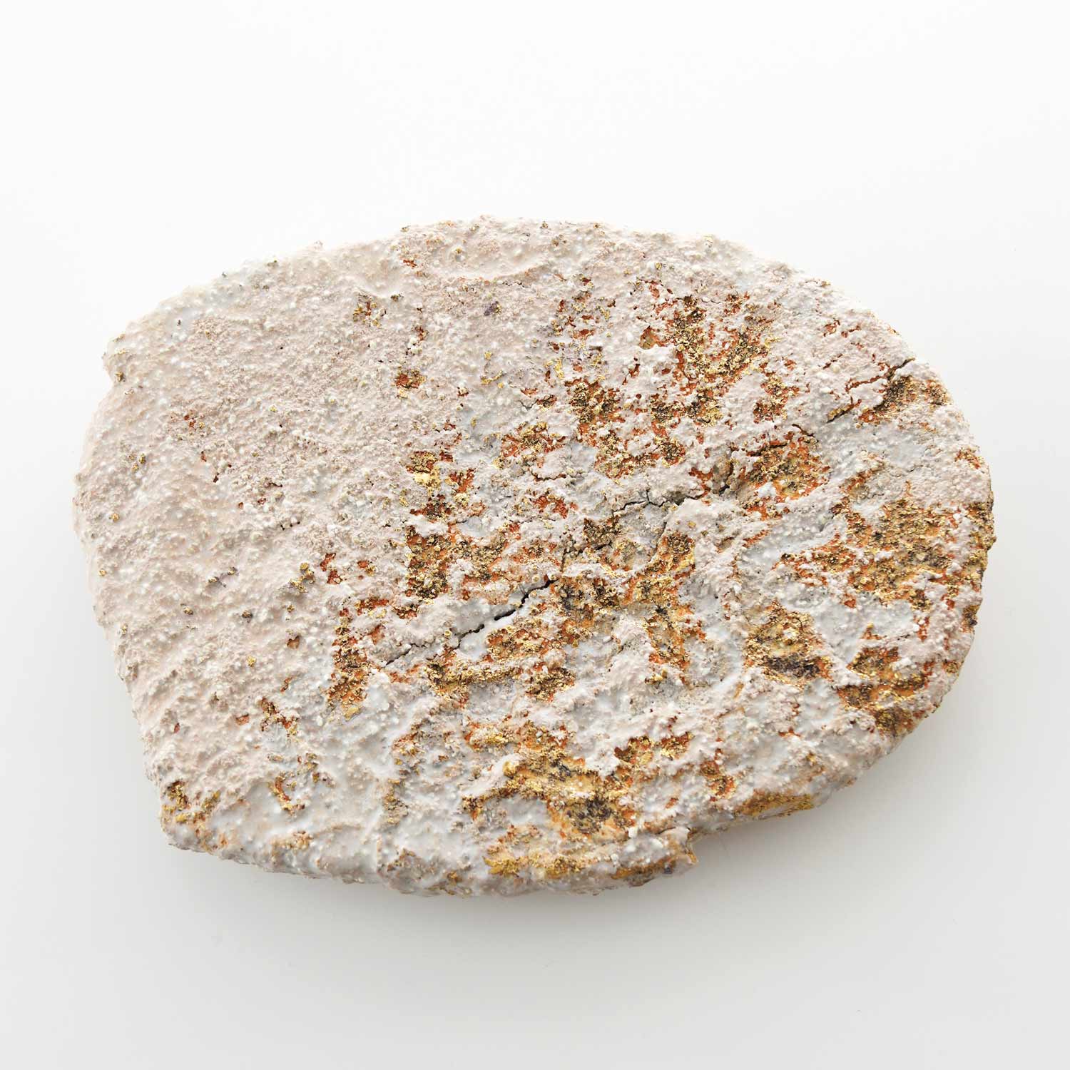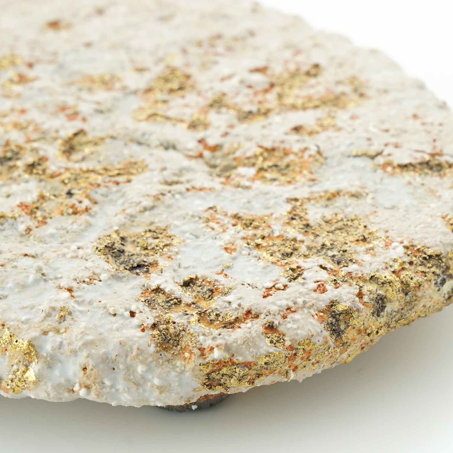 壁飾り。作った形を乾燥させ、水で溶かしました。水の侵食が起こす表面のヒビや凹凸には遥かな時間の堆石を感じます。そのまま形を焼いて時間を写しとりたいと思いました。部分的な金彩によってわずかにきらきらします。