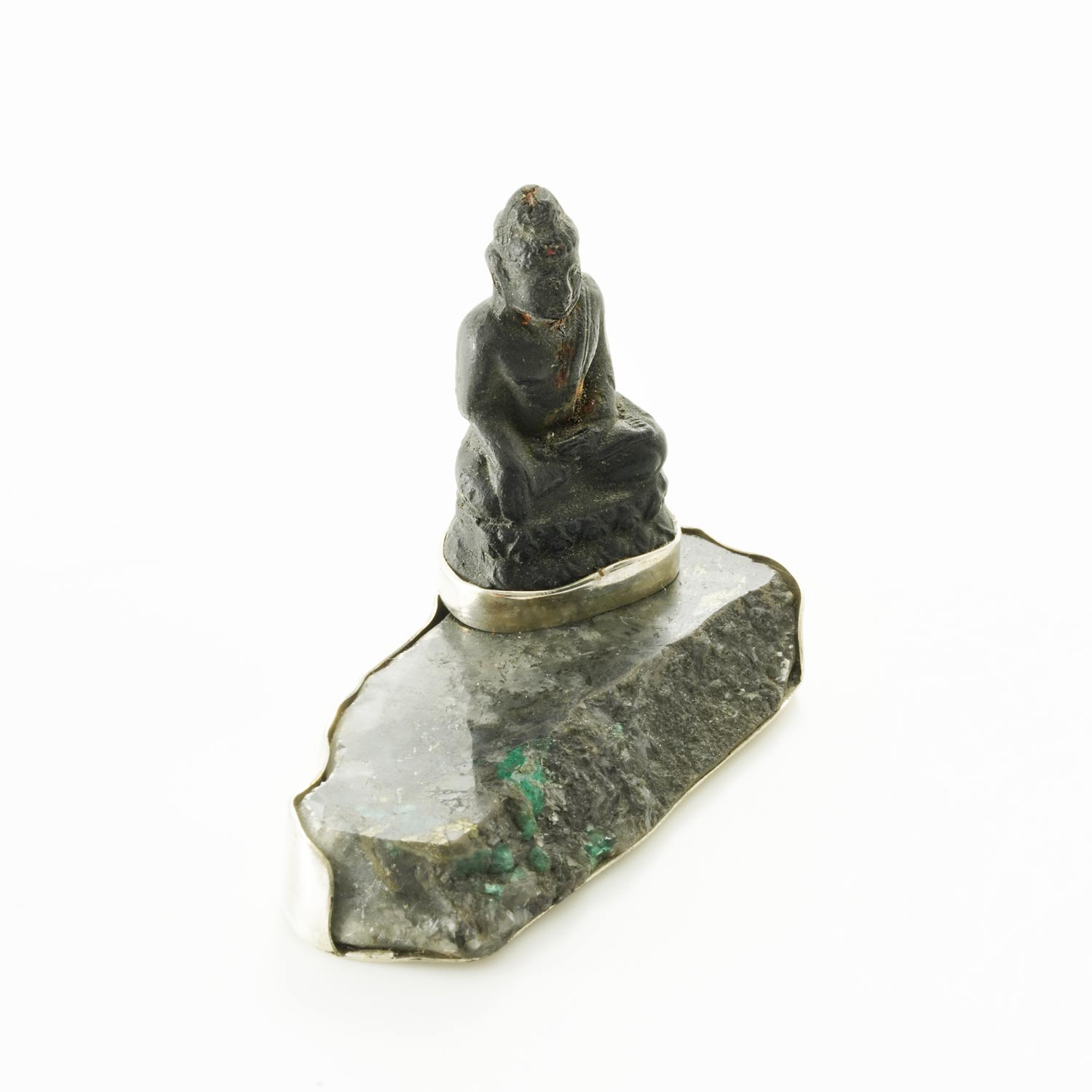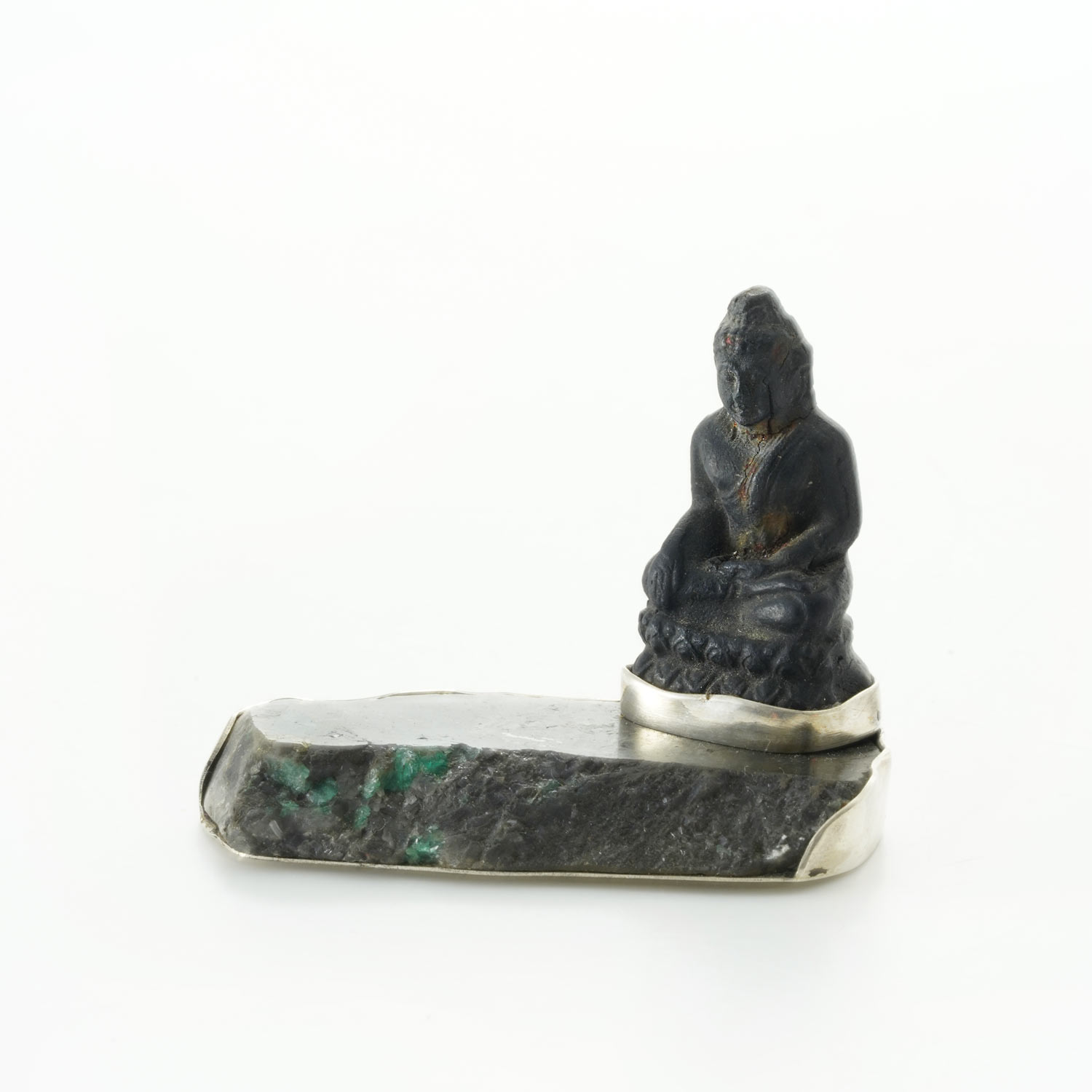 黒い母石の中にエメラルドが入った石板と黒檀の仏像の組み合わせ。しっくり来る世界観が魅力的なオブジェです。