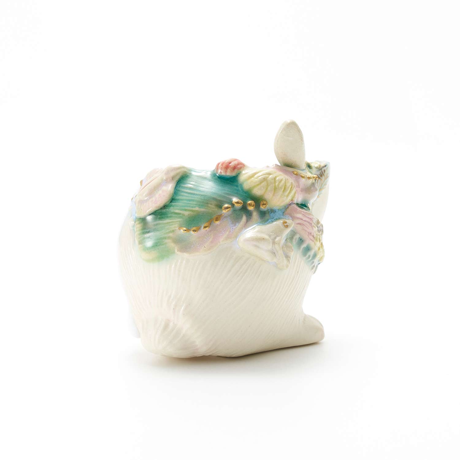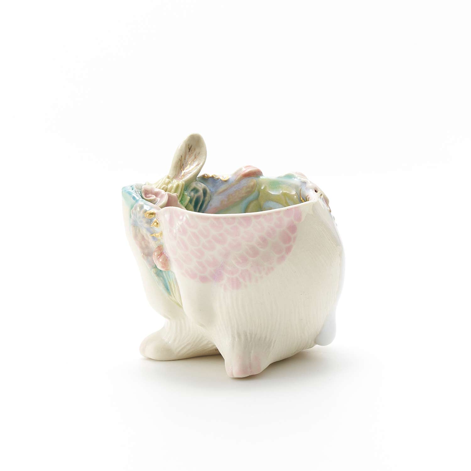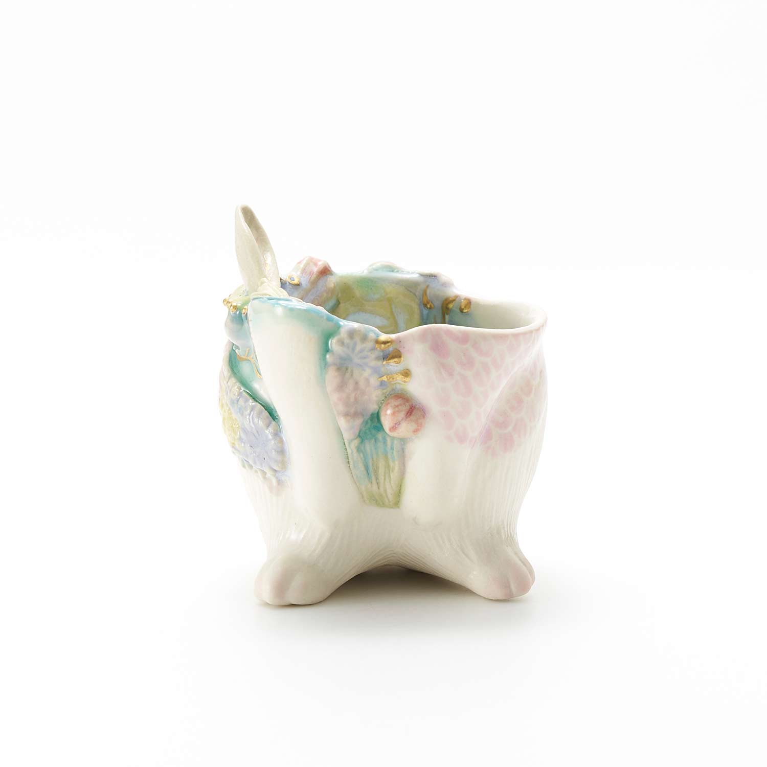 白兎の胴体の形をしたぐい呑です。見込みや側面に豊かな装飾が施されています。