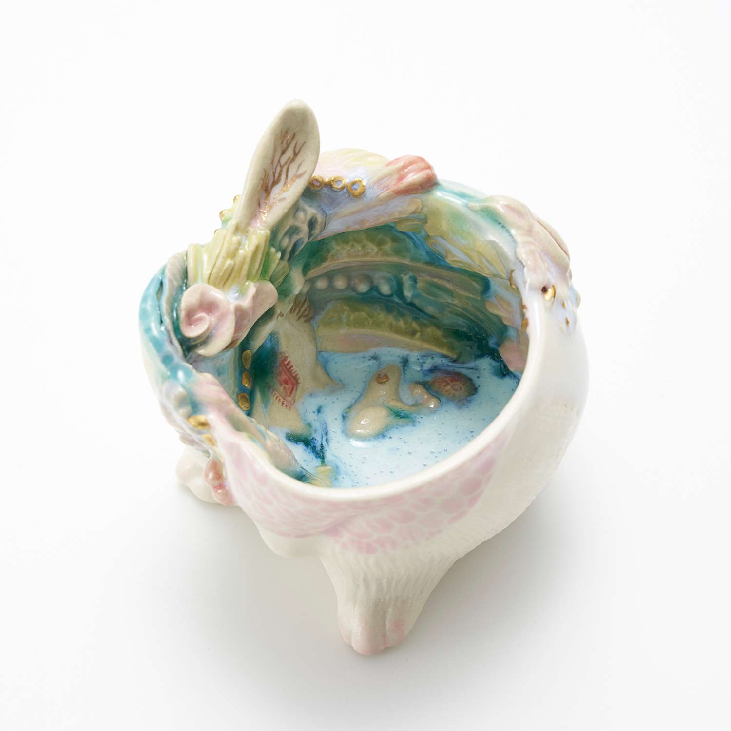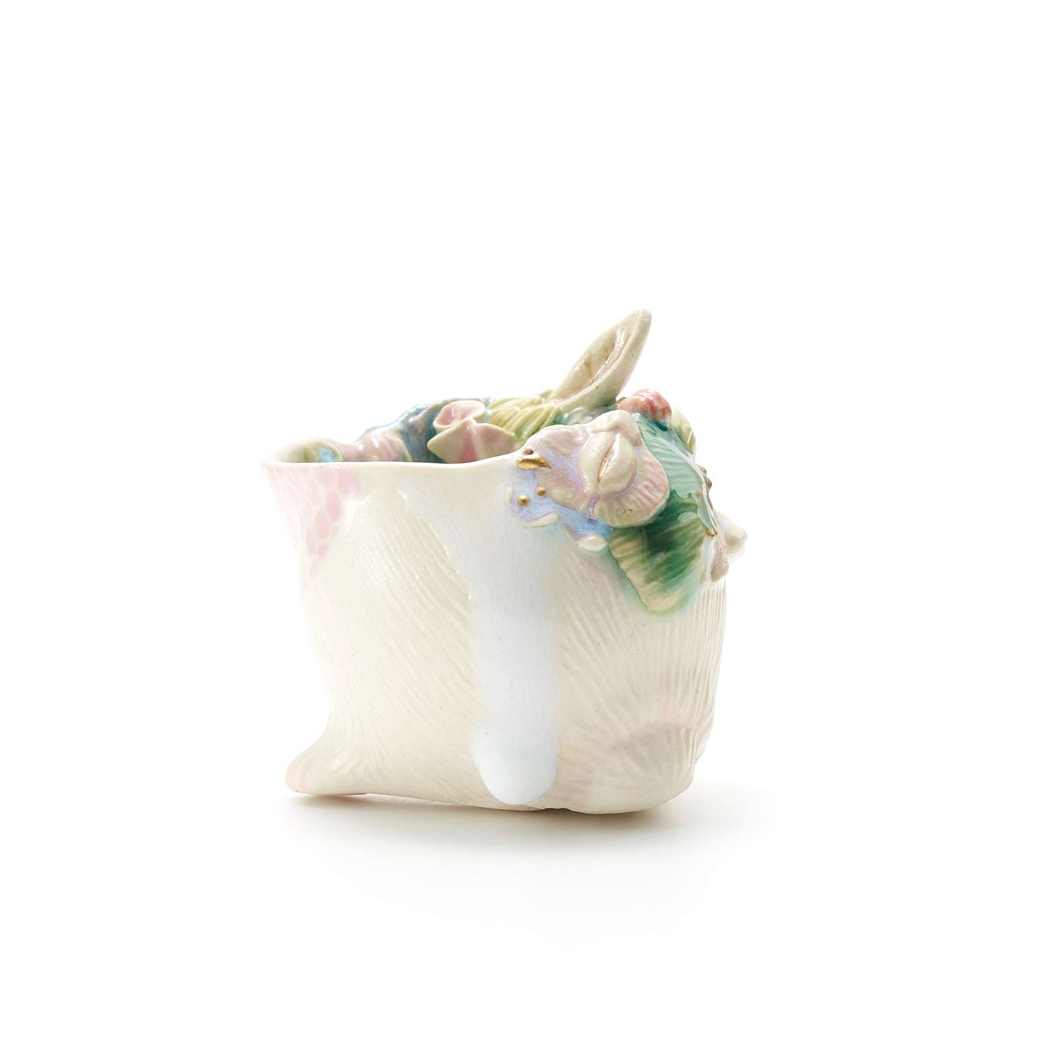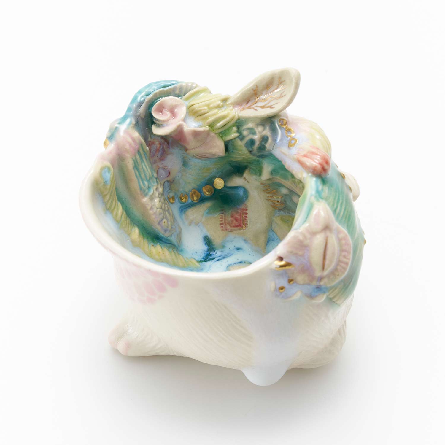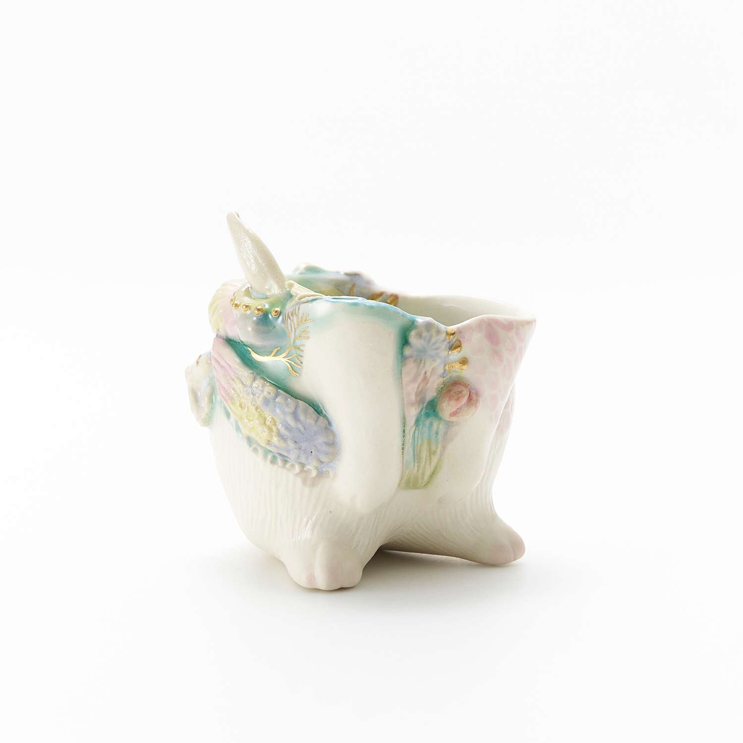 白兎の胴体の形をしたぐい呑です。見込みや側面に豊かな装飾が施されています。