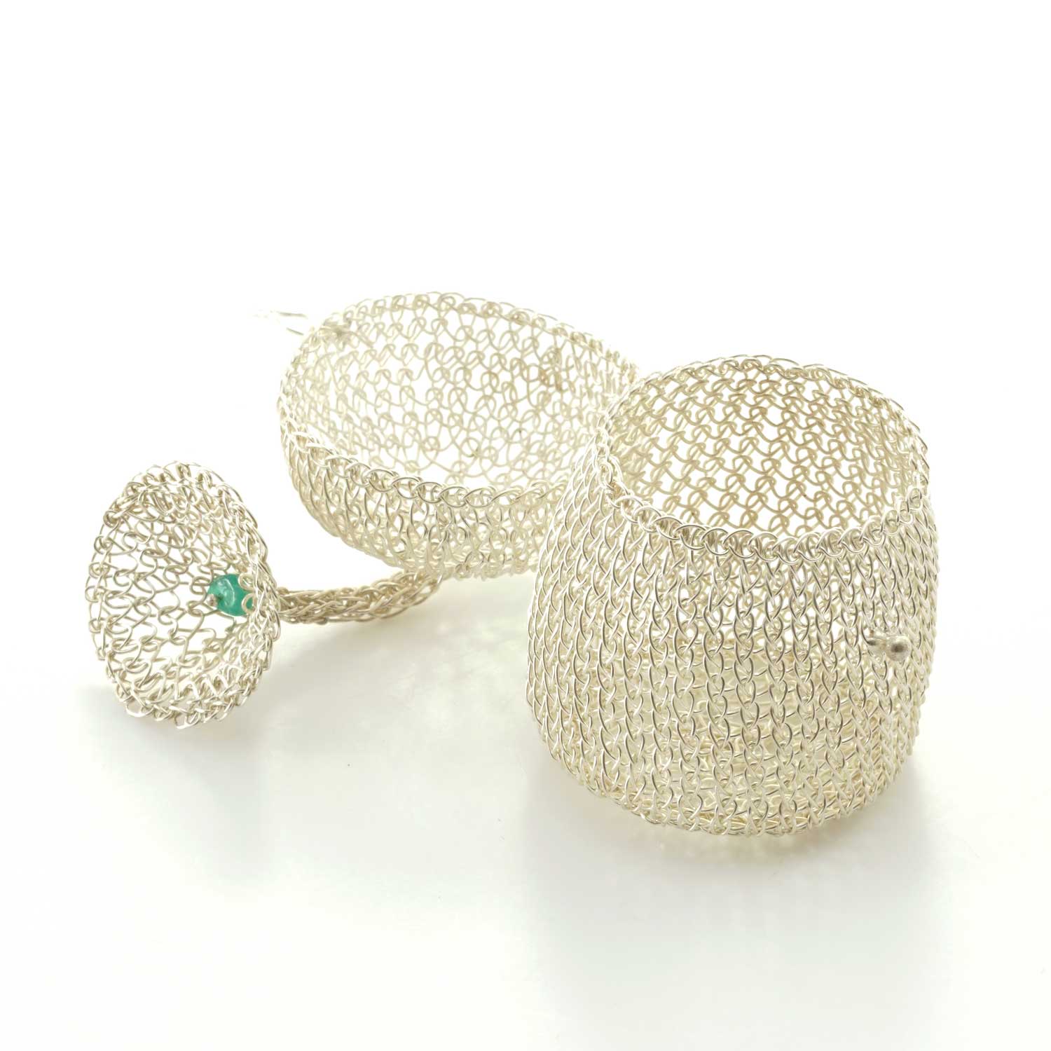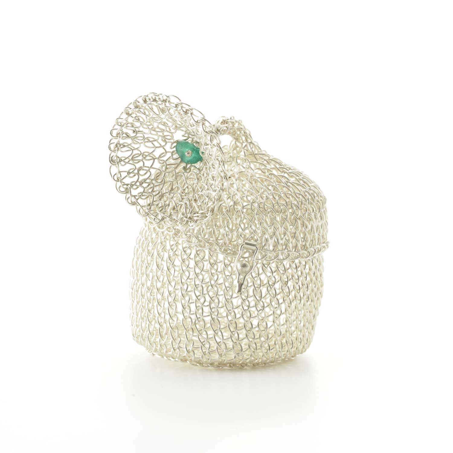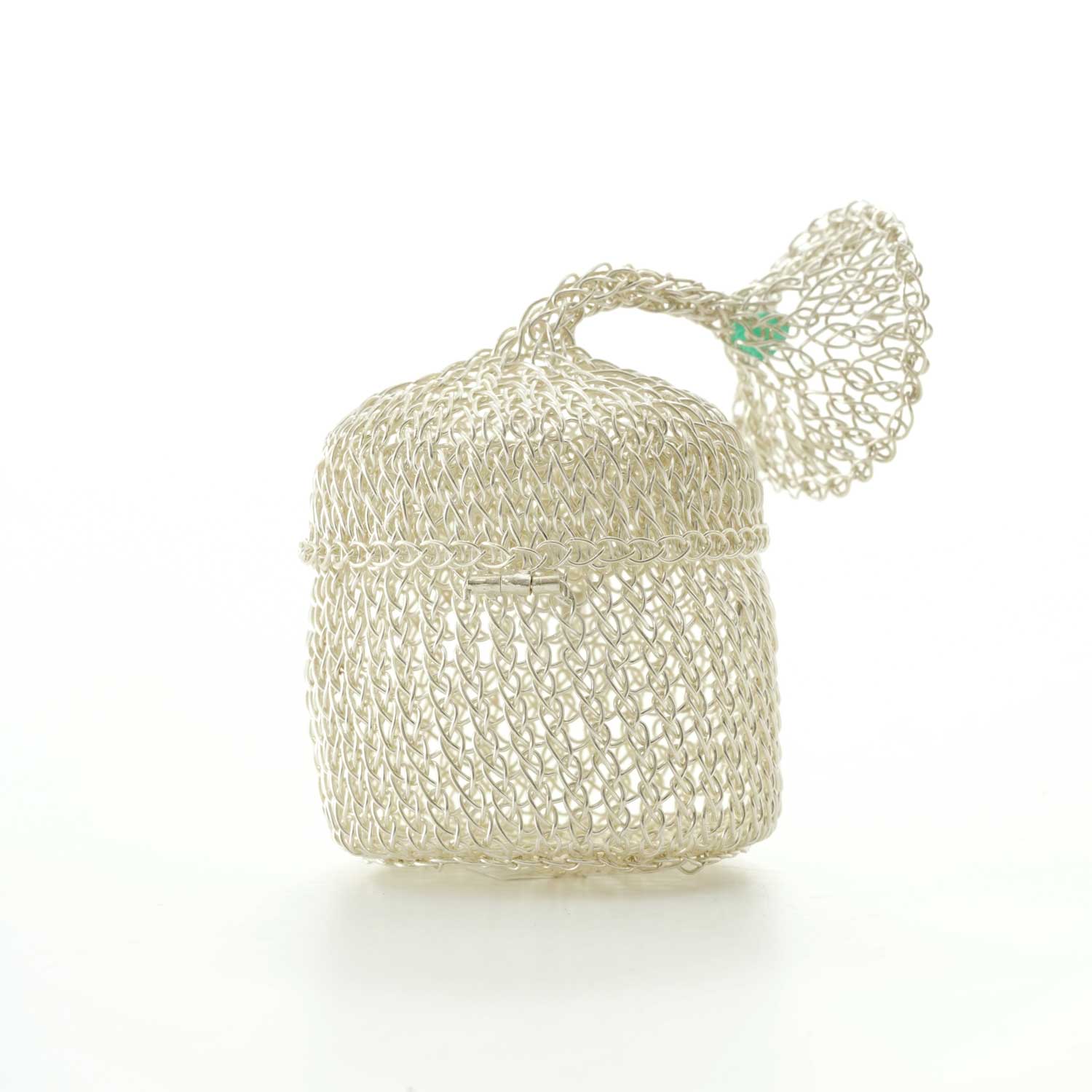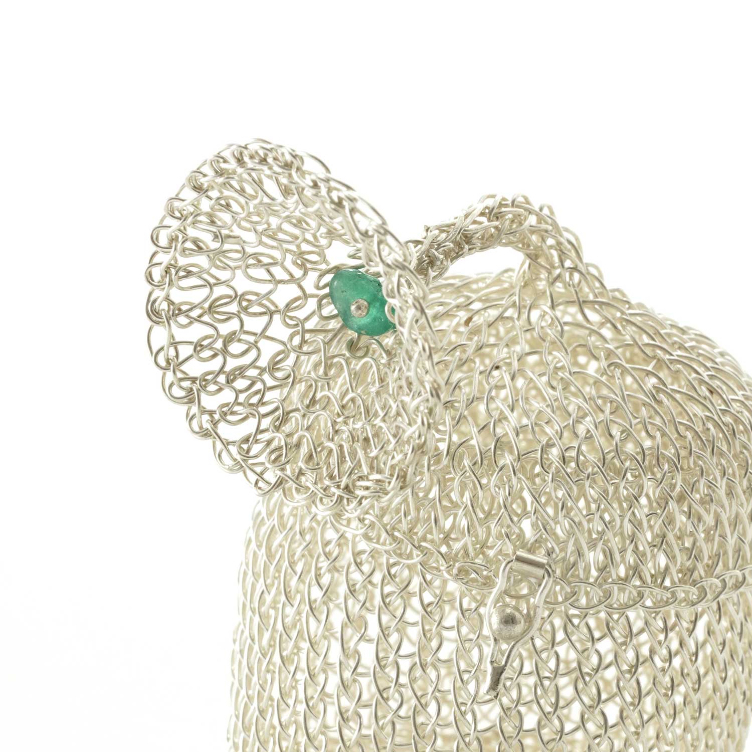 シルバーで編まれた小さな小物入れ。モチーフはバリ島のお祭りに使われる帽子だそうです。帽子の先の飾りに小さなエメラルドがはめ込まれています。