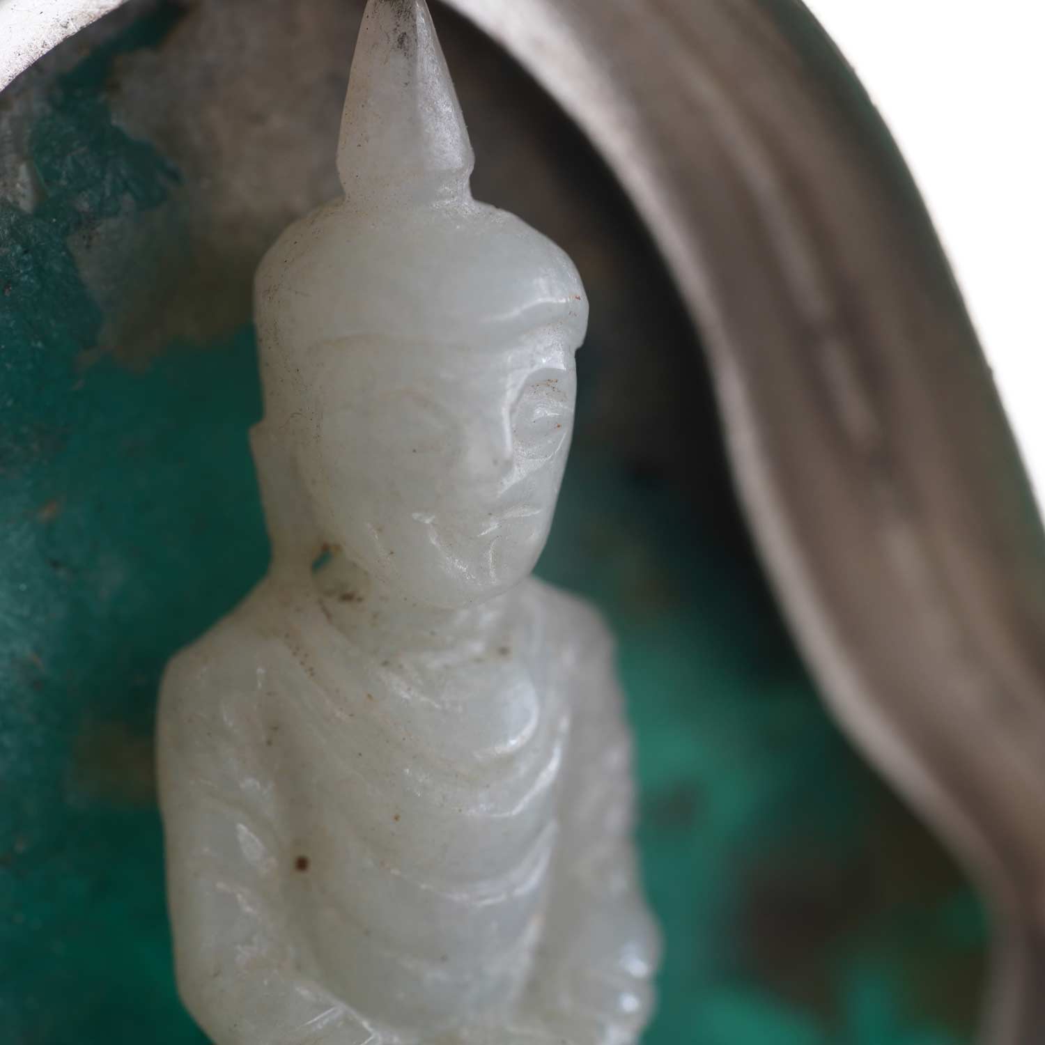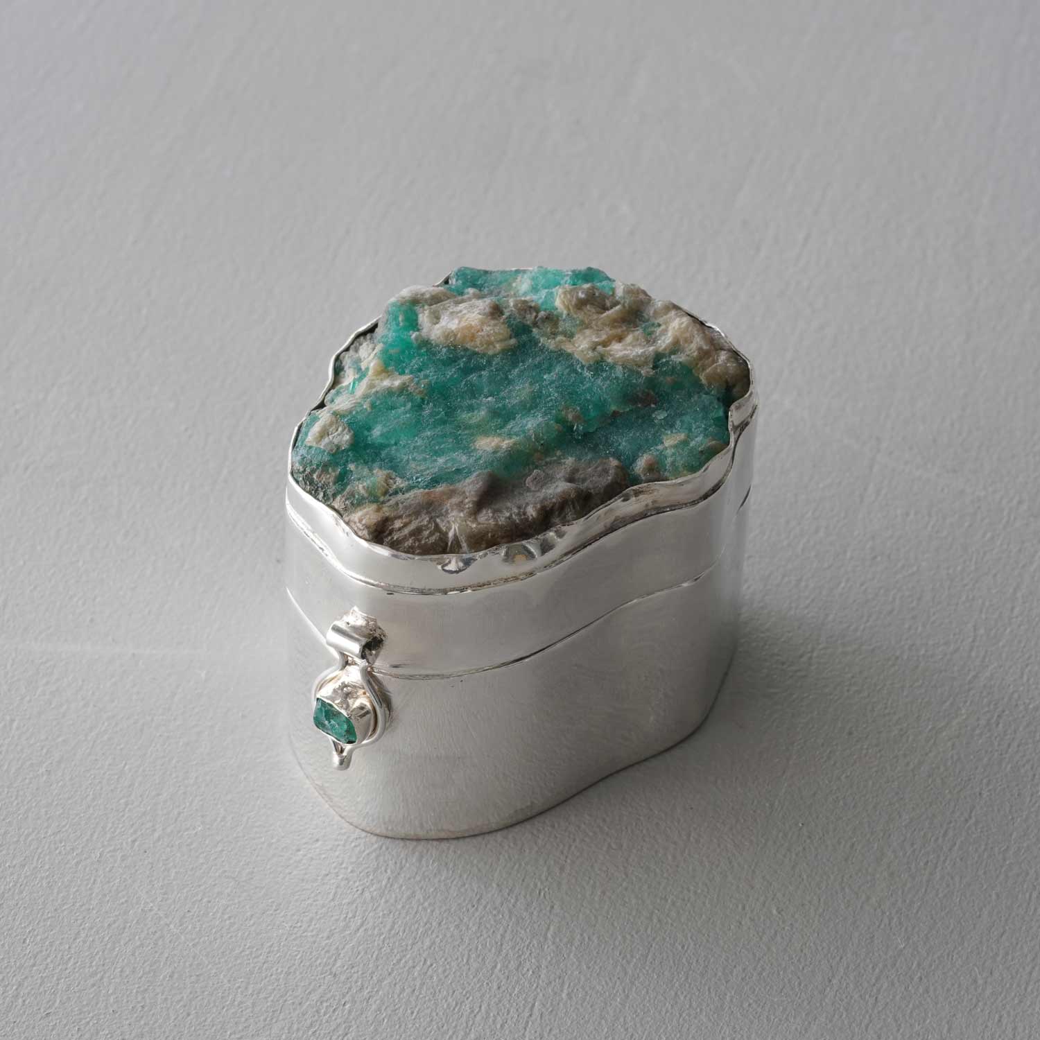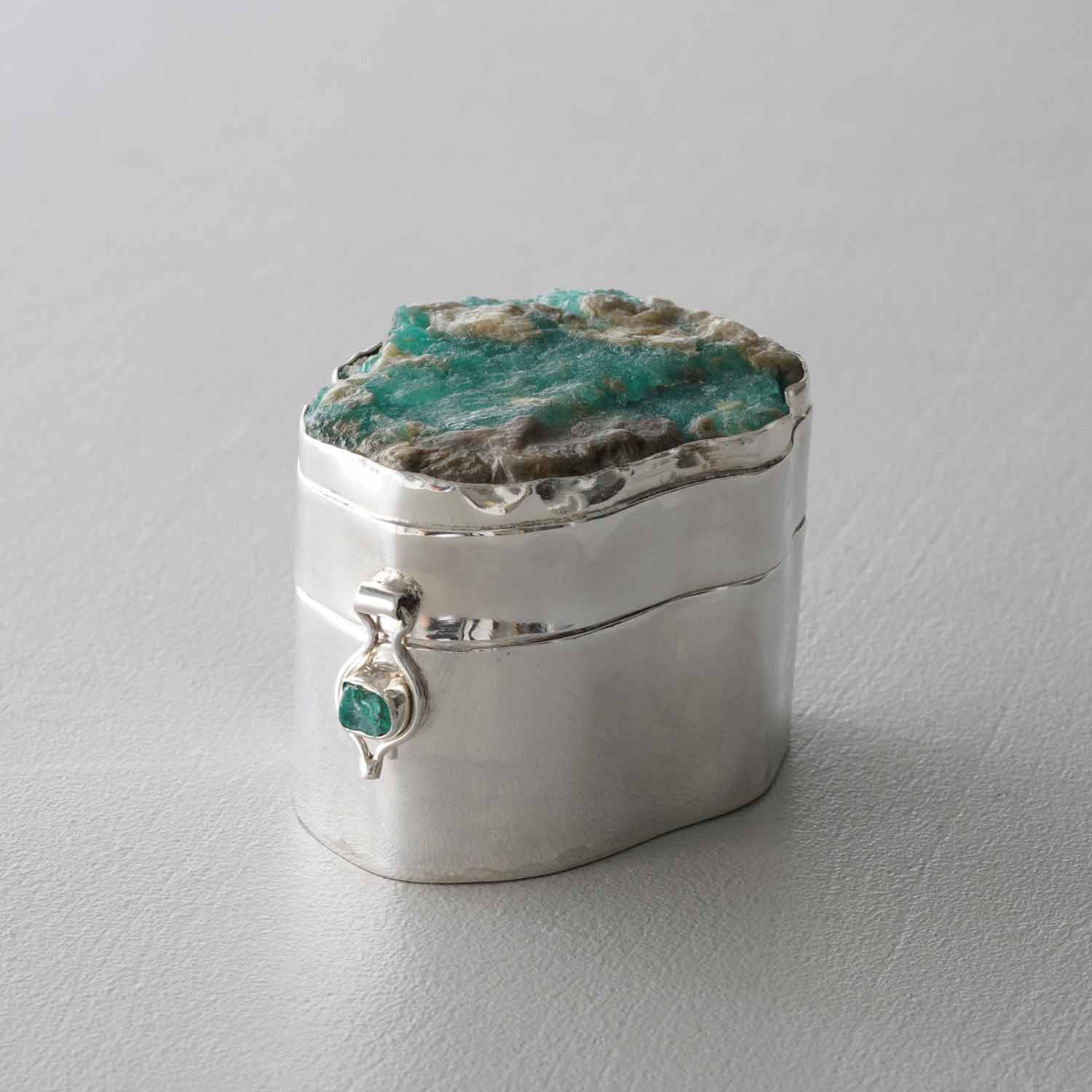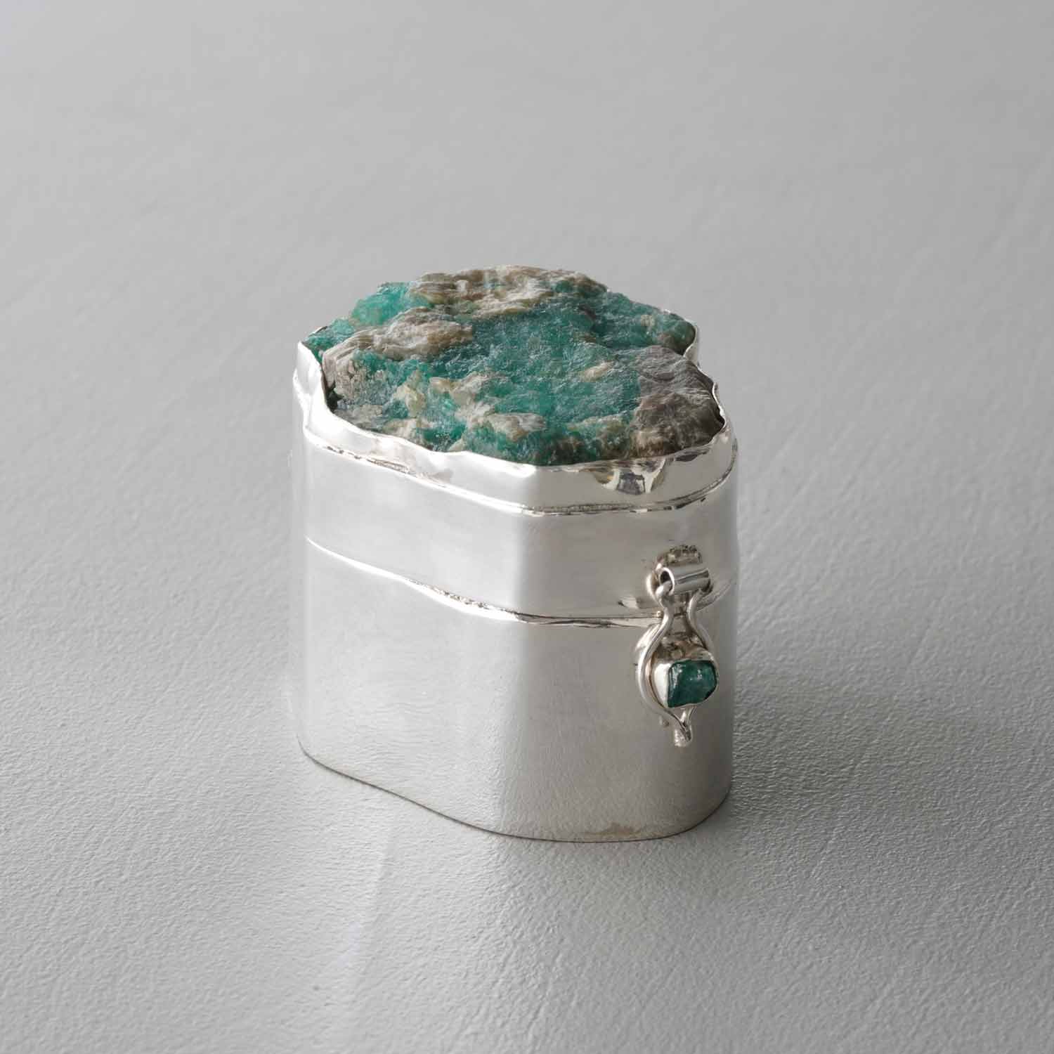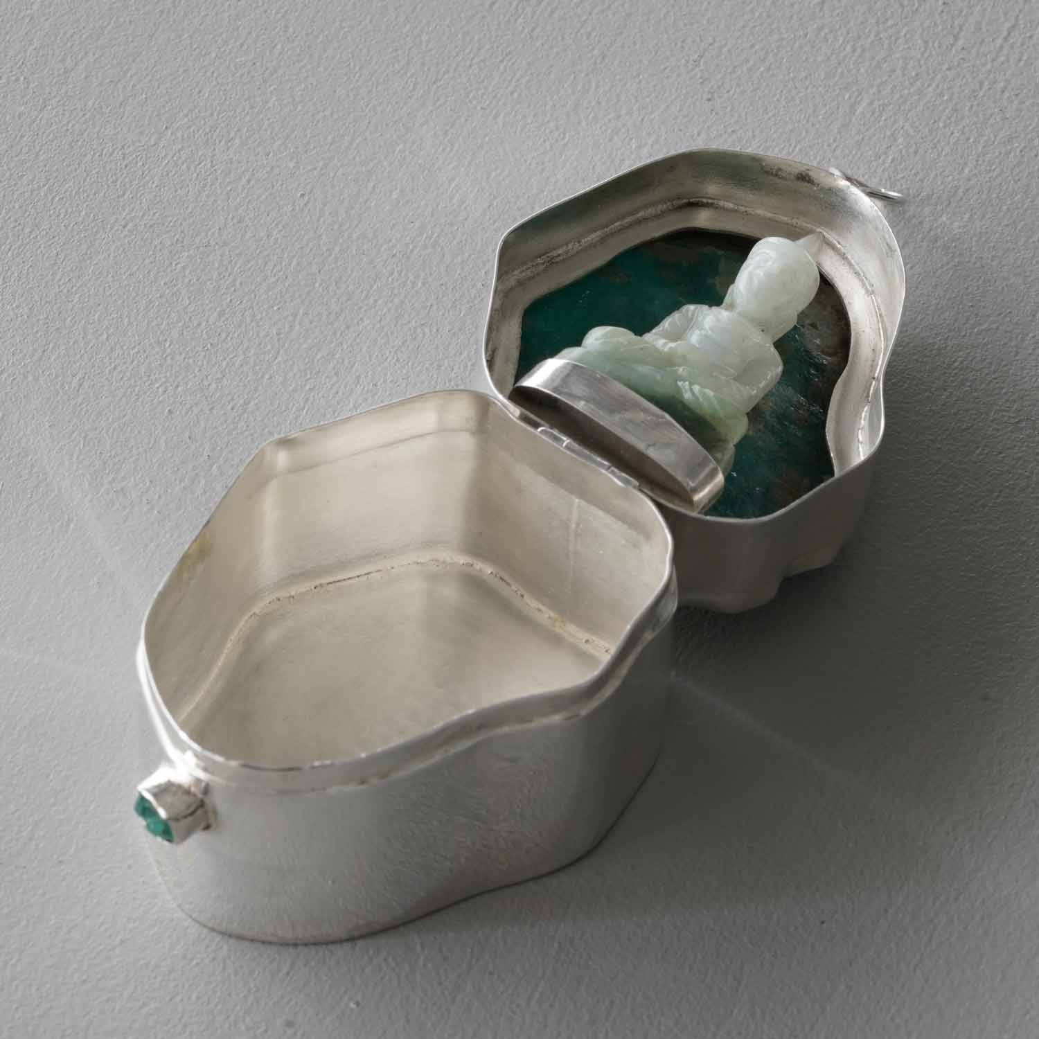 蓋部分に板状のエメラルドが埋め込まれたシルバーの小物入れ。蓋を開くとネフライトで彫られた仏像がエメラルドと背中合わせで配されています。日に当てるとエメラルドから光が漏れまるで後光のように輝きます。