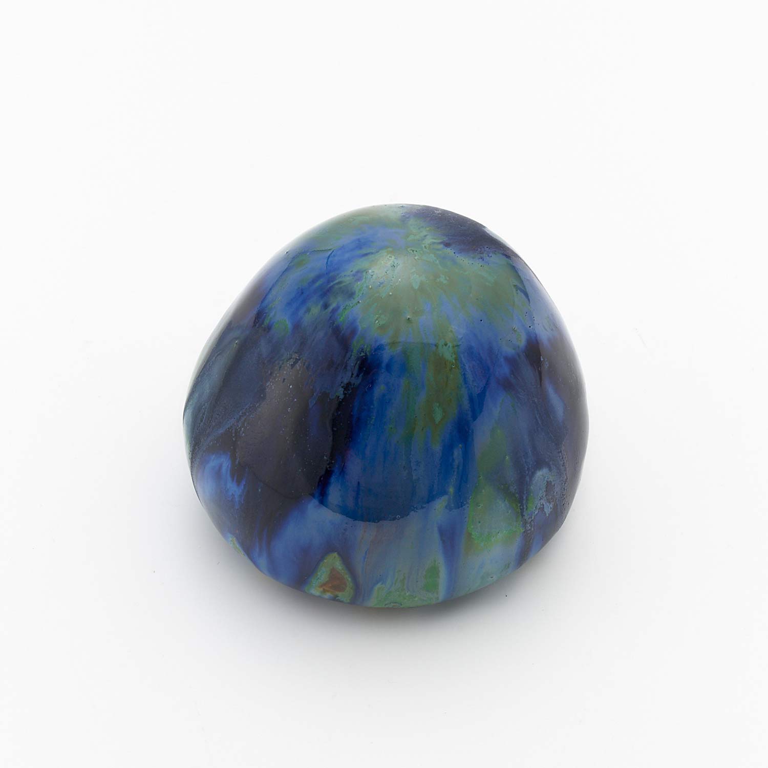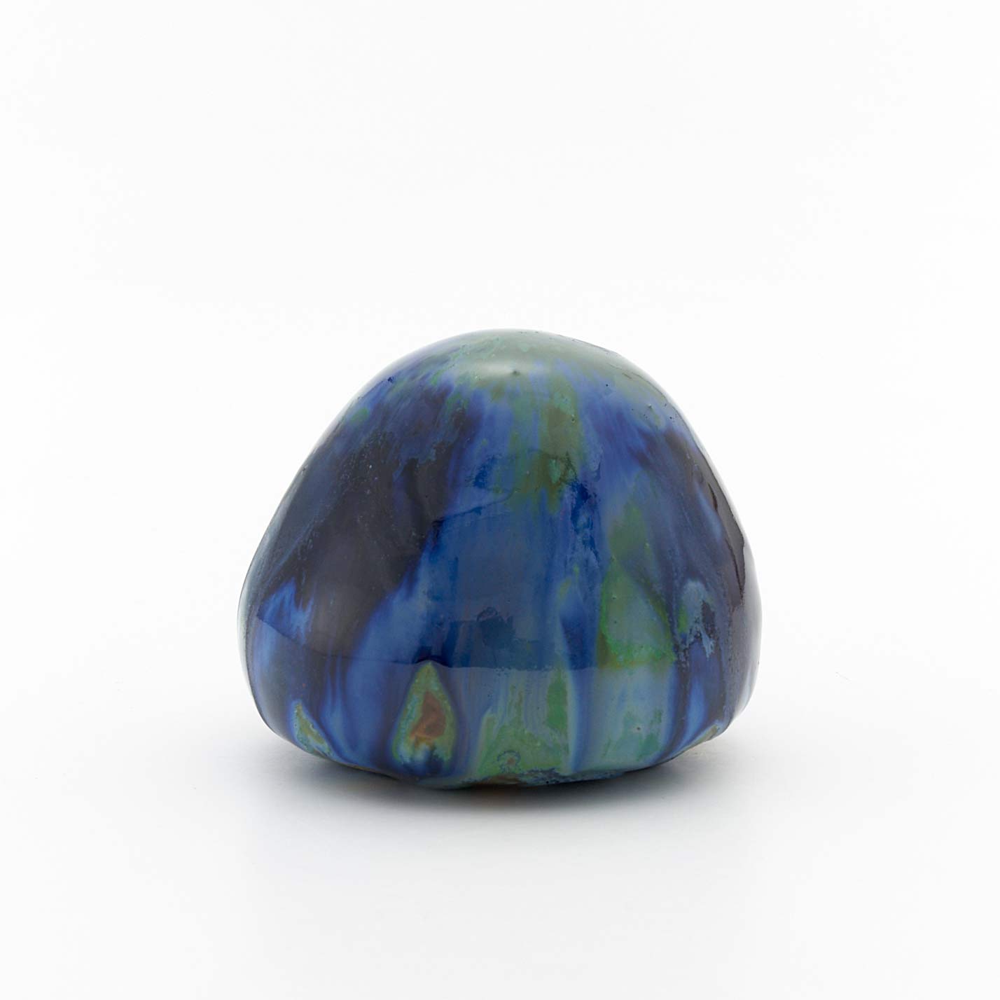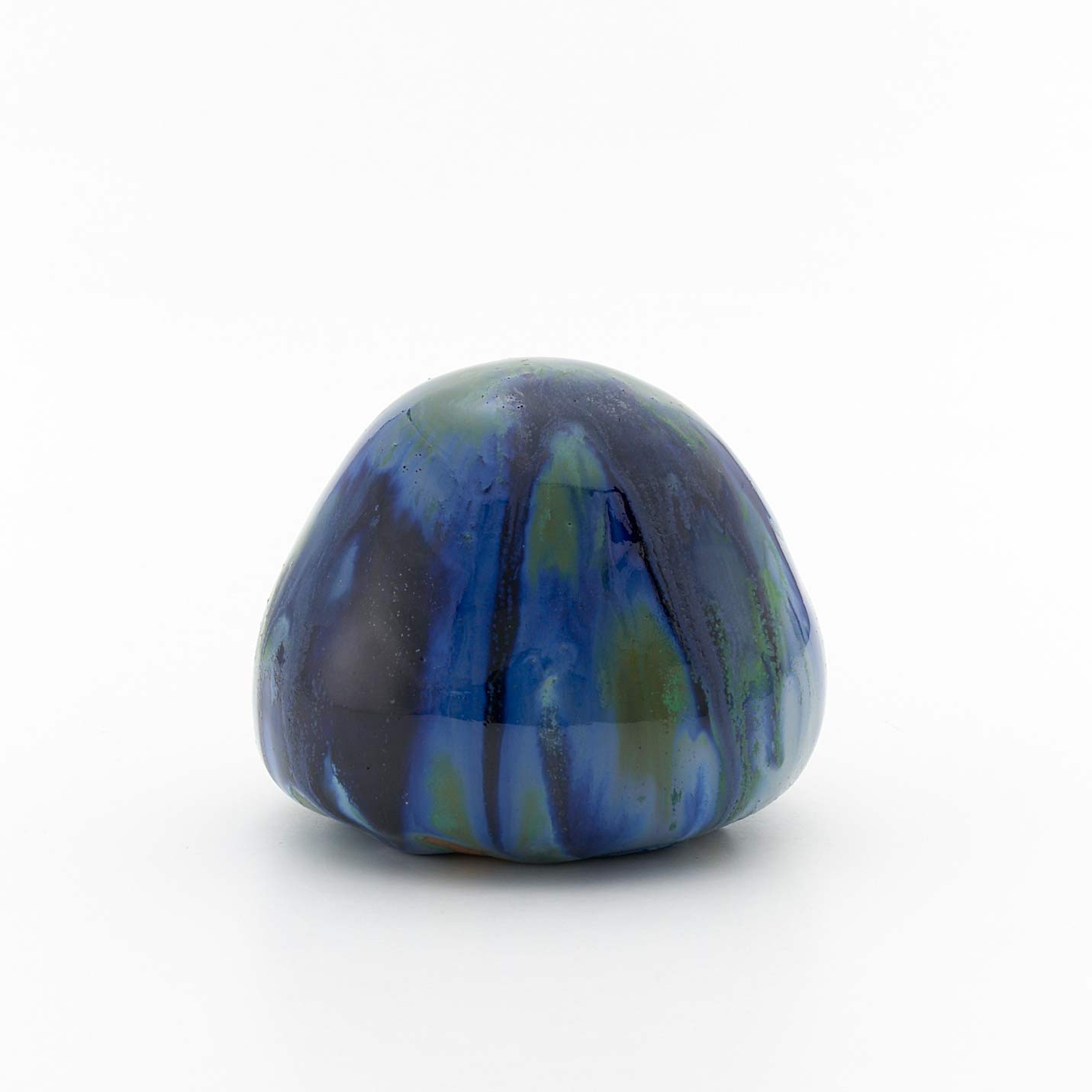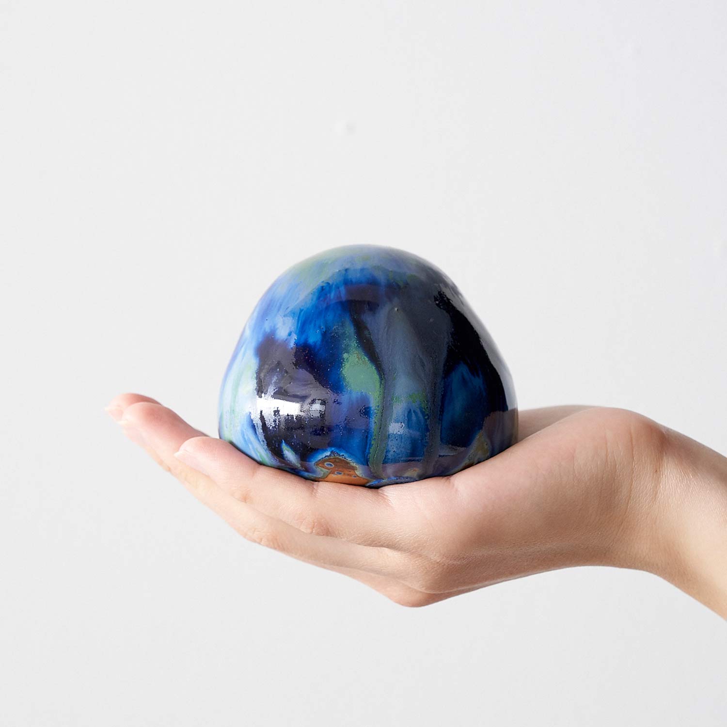 全体が釉薬で覆われた、てのりサイズの作品。数種類の釉薬の混ざり合いと流れがとても美しい作品です。いつまでも眺めていたくなります。