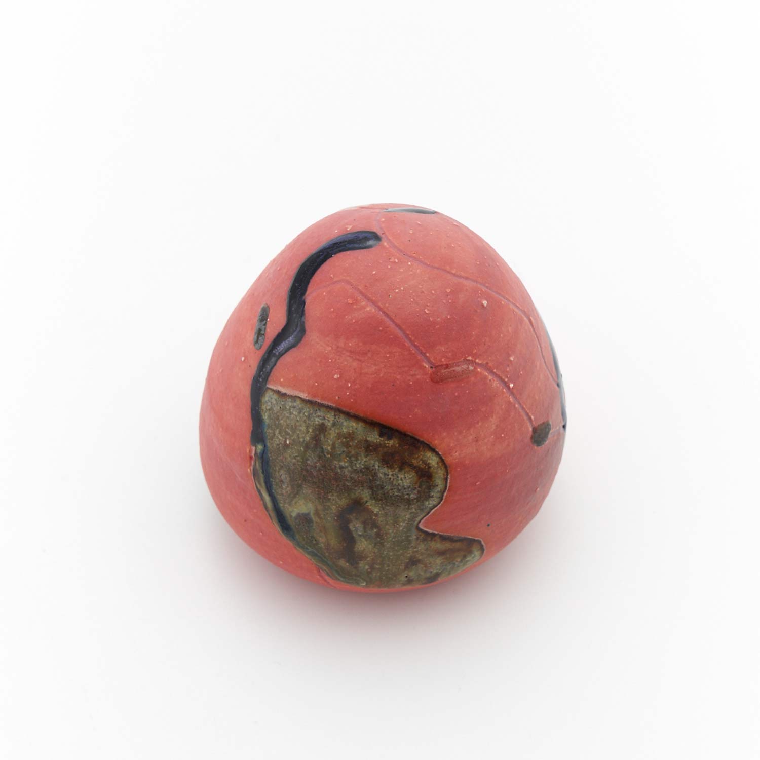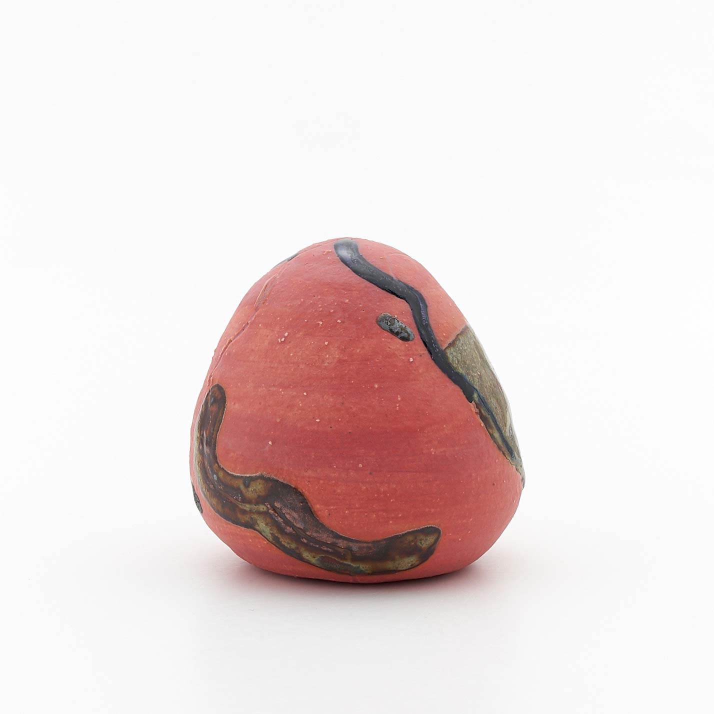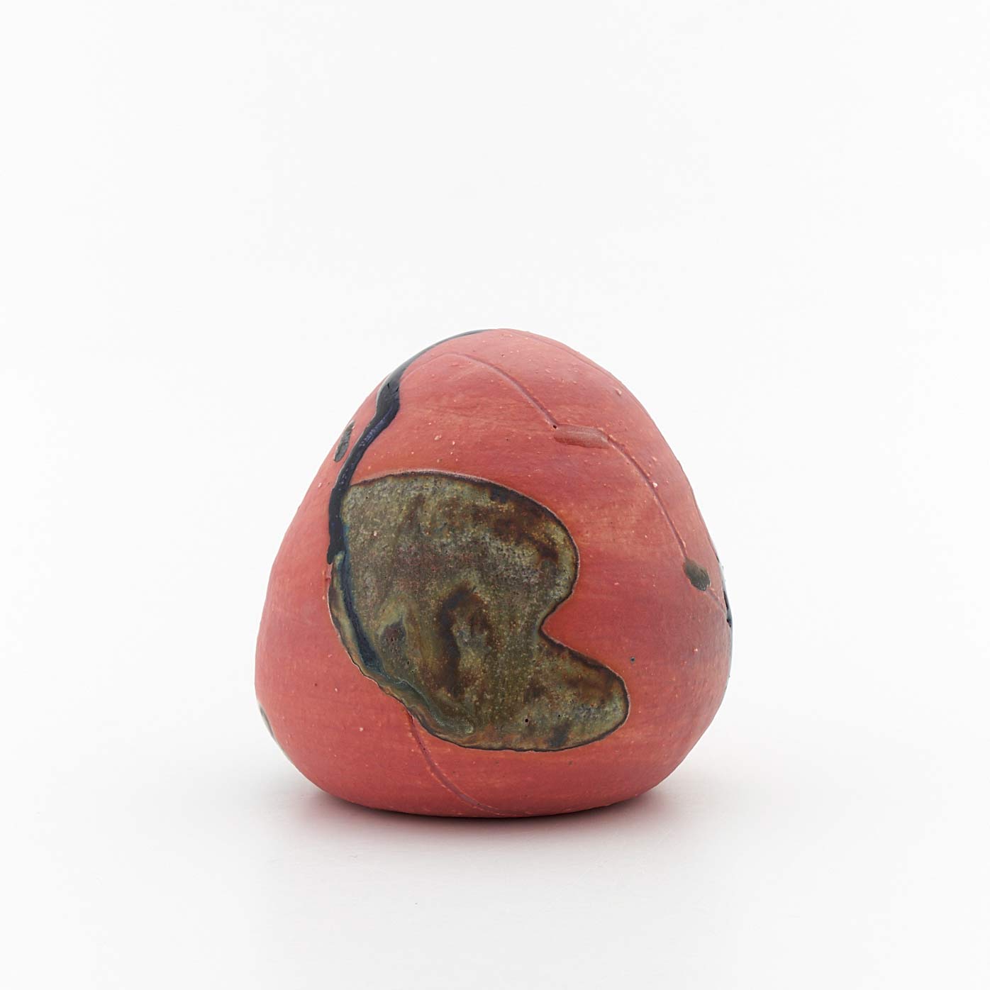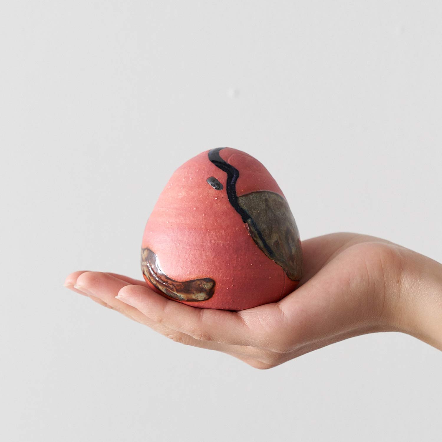 A hand-held size piece with a red body drawn with lines and glaze. This work will cheer you up when you look at it.