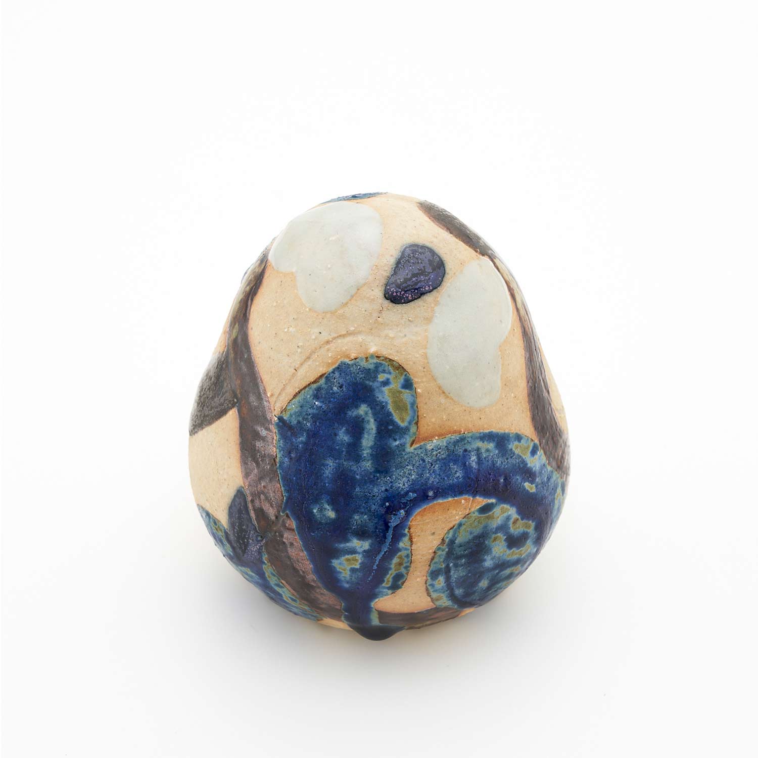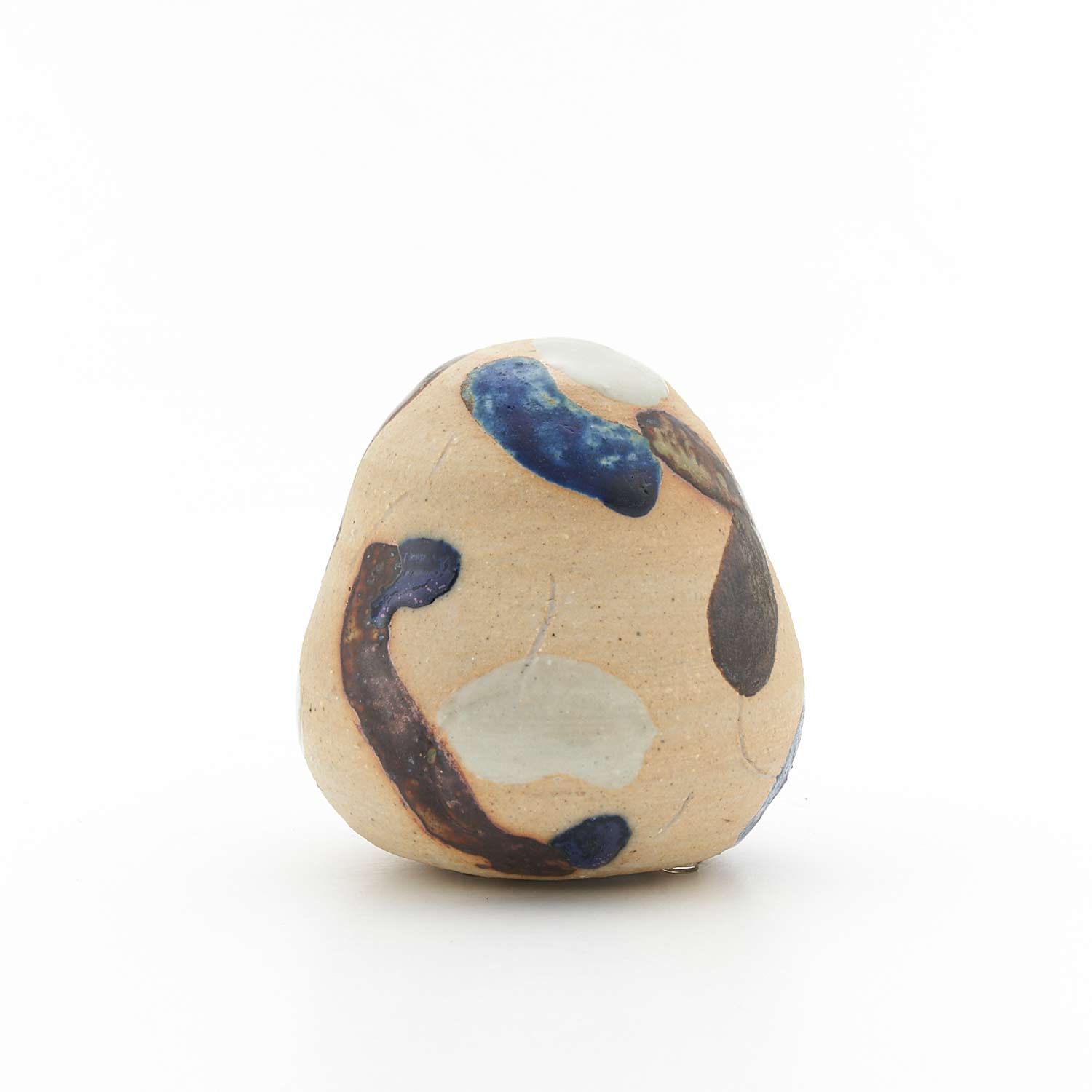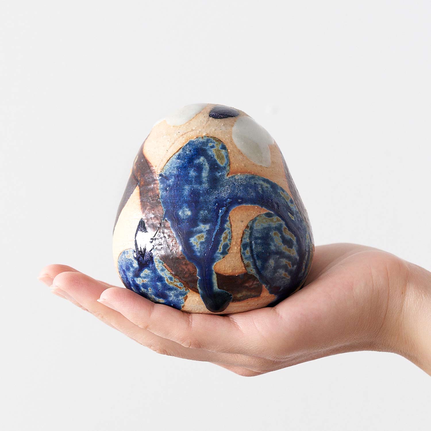 てのりサイズの愛らしい作品。釉薬で描かれた模様がユニークです。土と釉薬の表情が魅力的です。