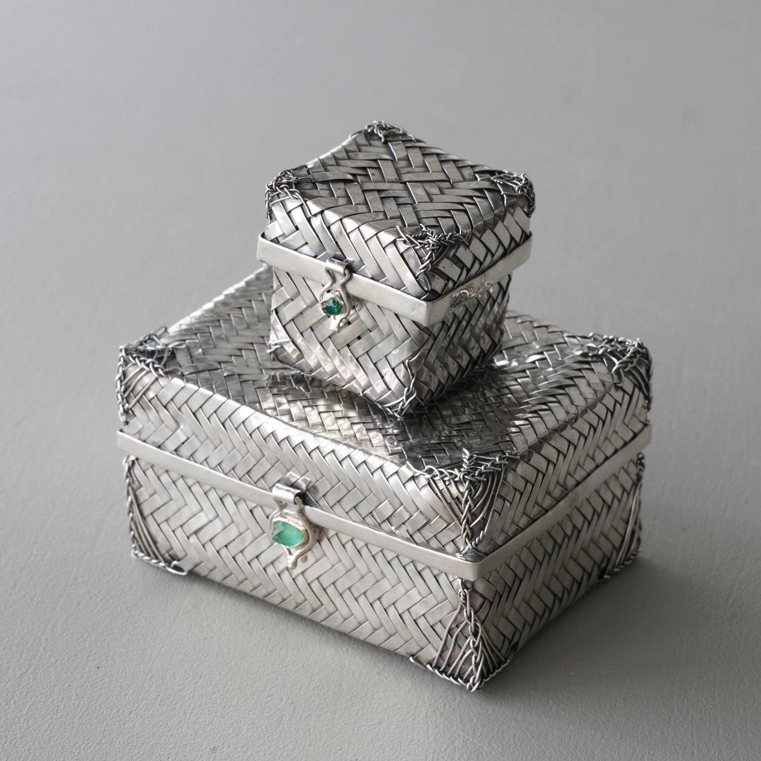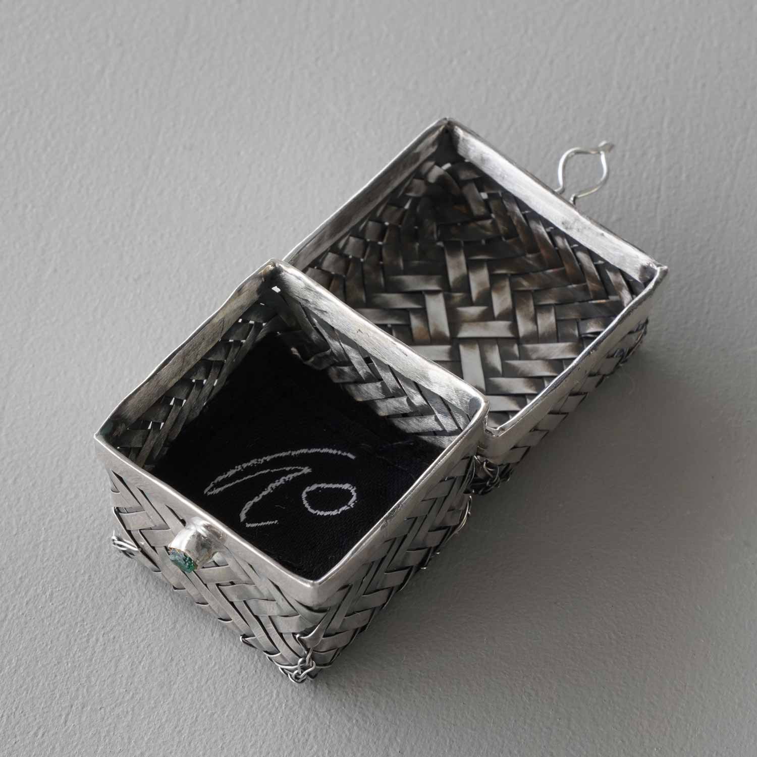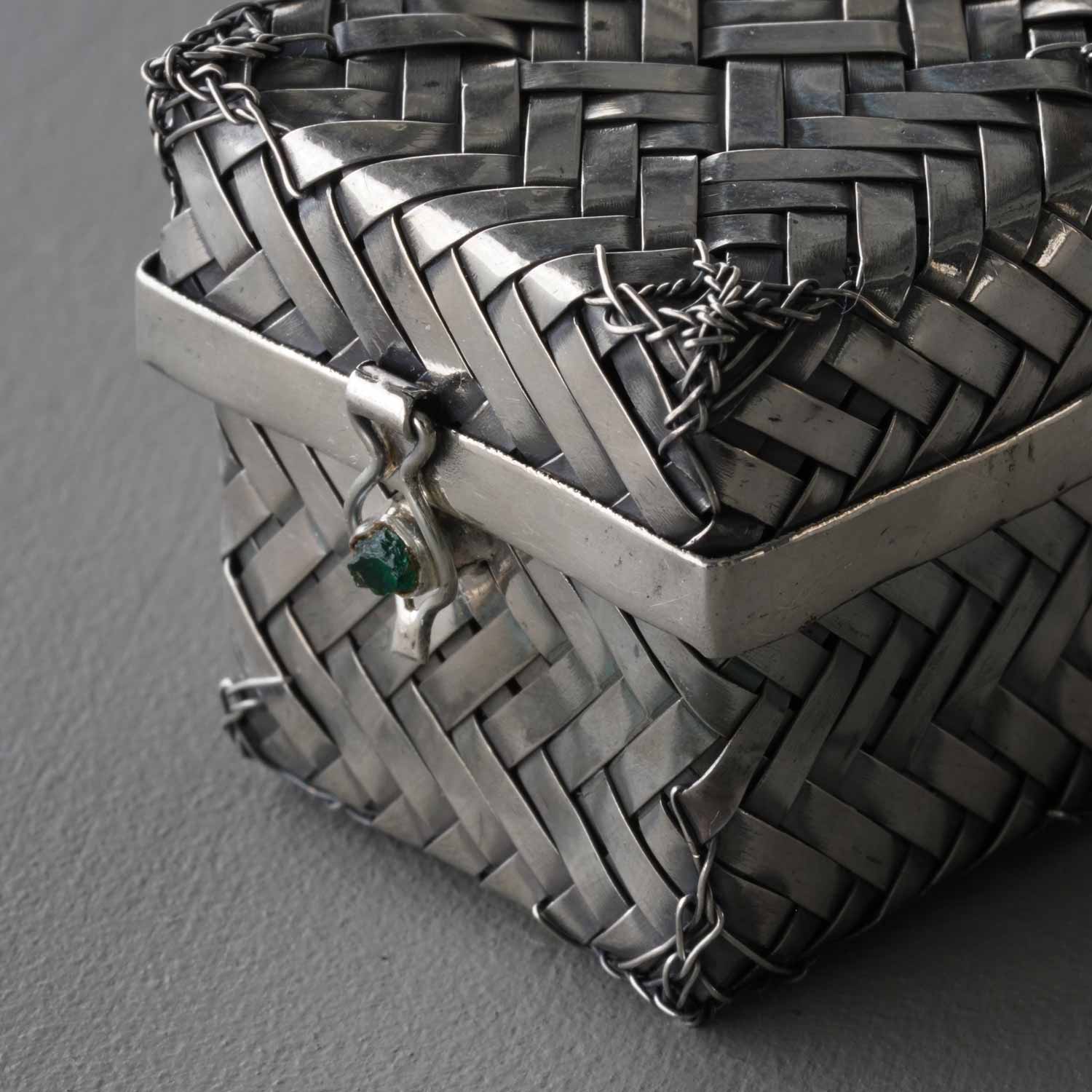 This is a small accessory case woven in silver with a Balinese basket motif. A small emerald is embedded in the hook.