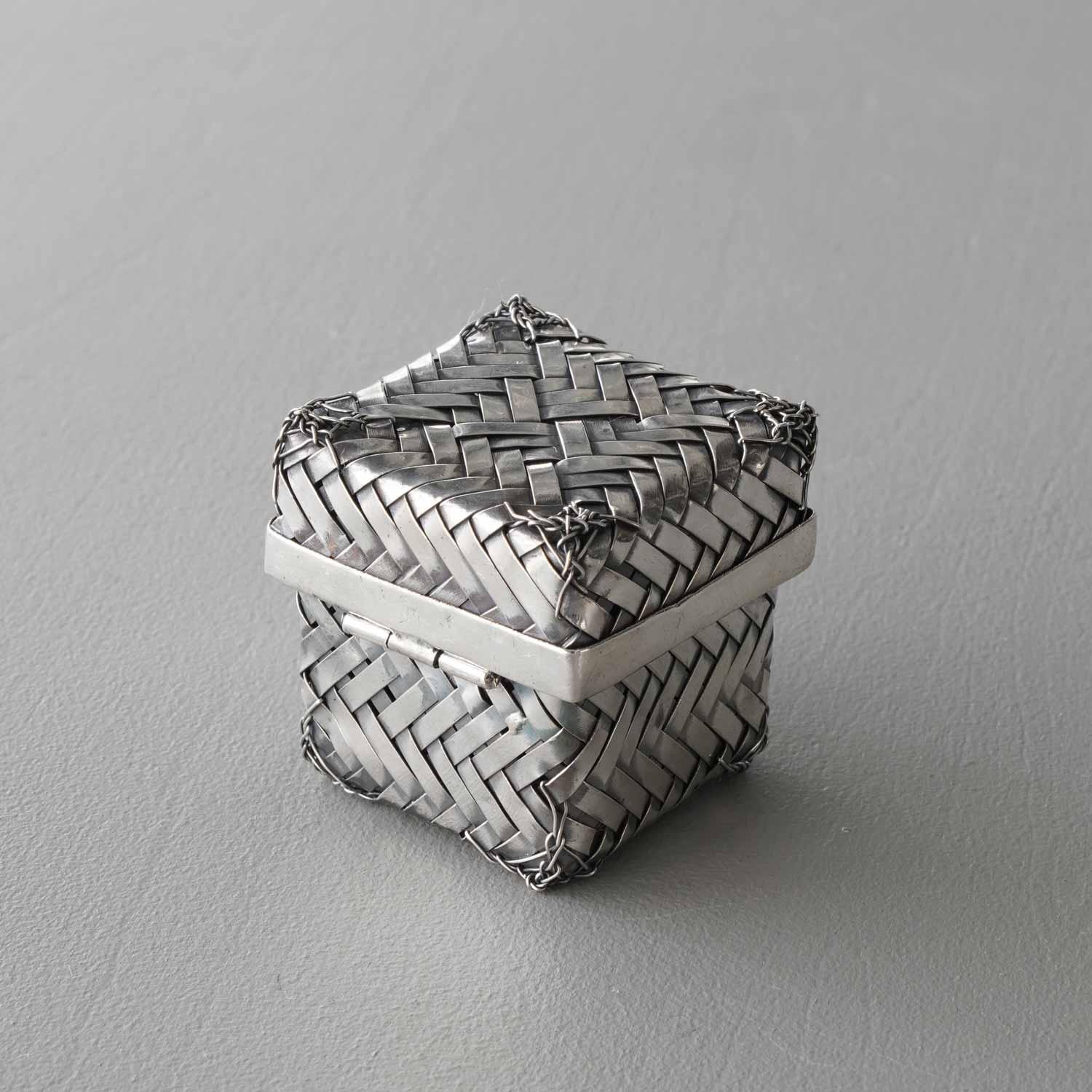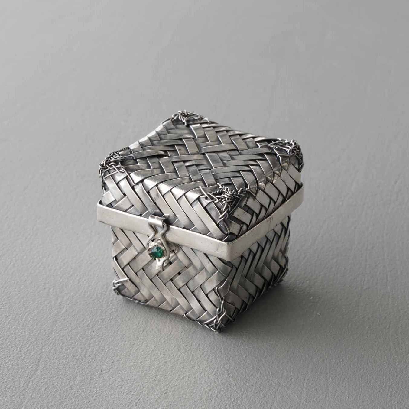 バリ島のかごをモチーフにし、シルバーで編まれた小さな小物入れ。フック部分に小さなエメラルドが埋め込まれています。