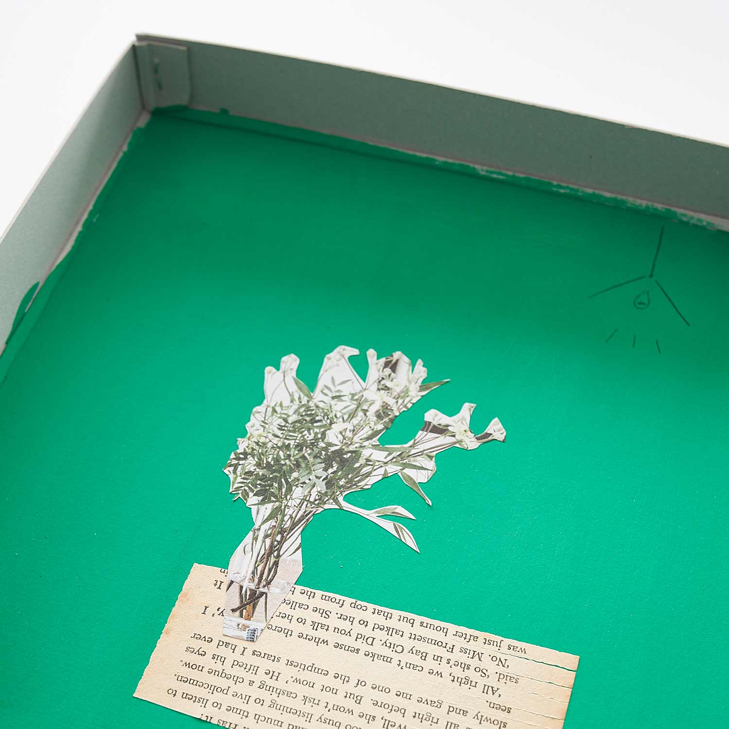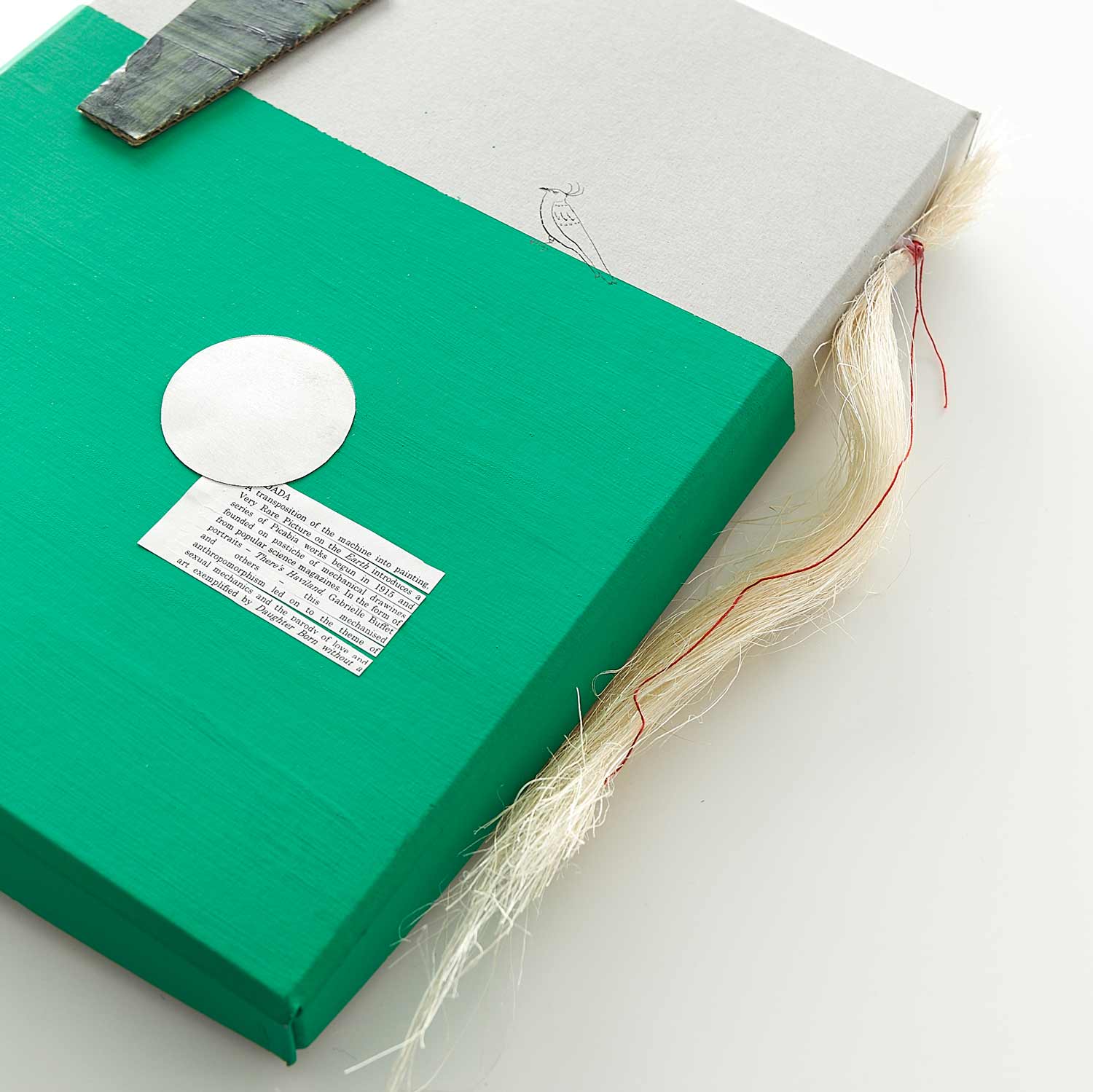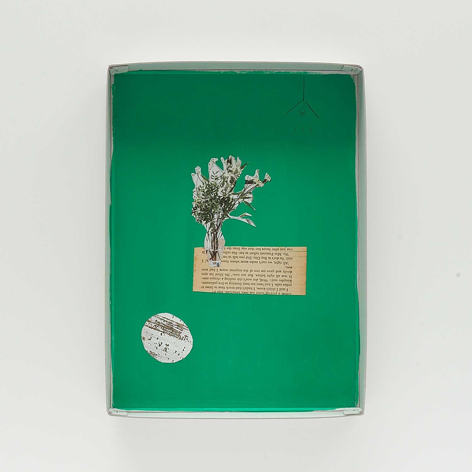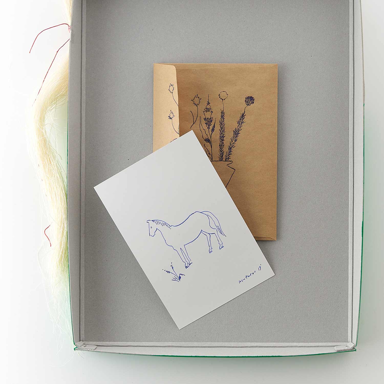 2019年3月、水犀のオープニングにあわせて制作された、田中健太郎さんのスペシャルボックスです。鮮やかなグリーンに愛らしい小鳥が描かれています。蓋の裏には、2019年に描かれたカードが添えられています。ドローイングを高精細出力プリントし彩色した3枚と銅製の馬のオブジェがセットになっています。