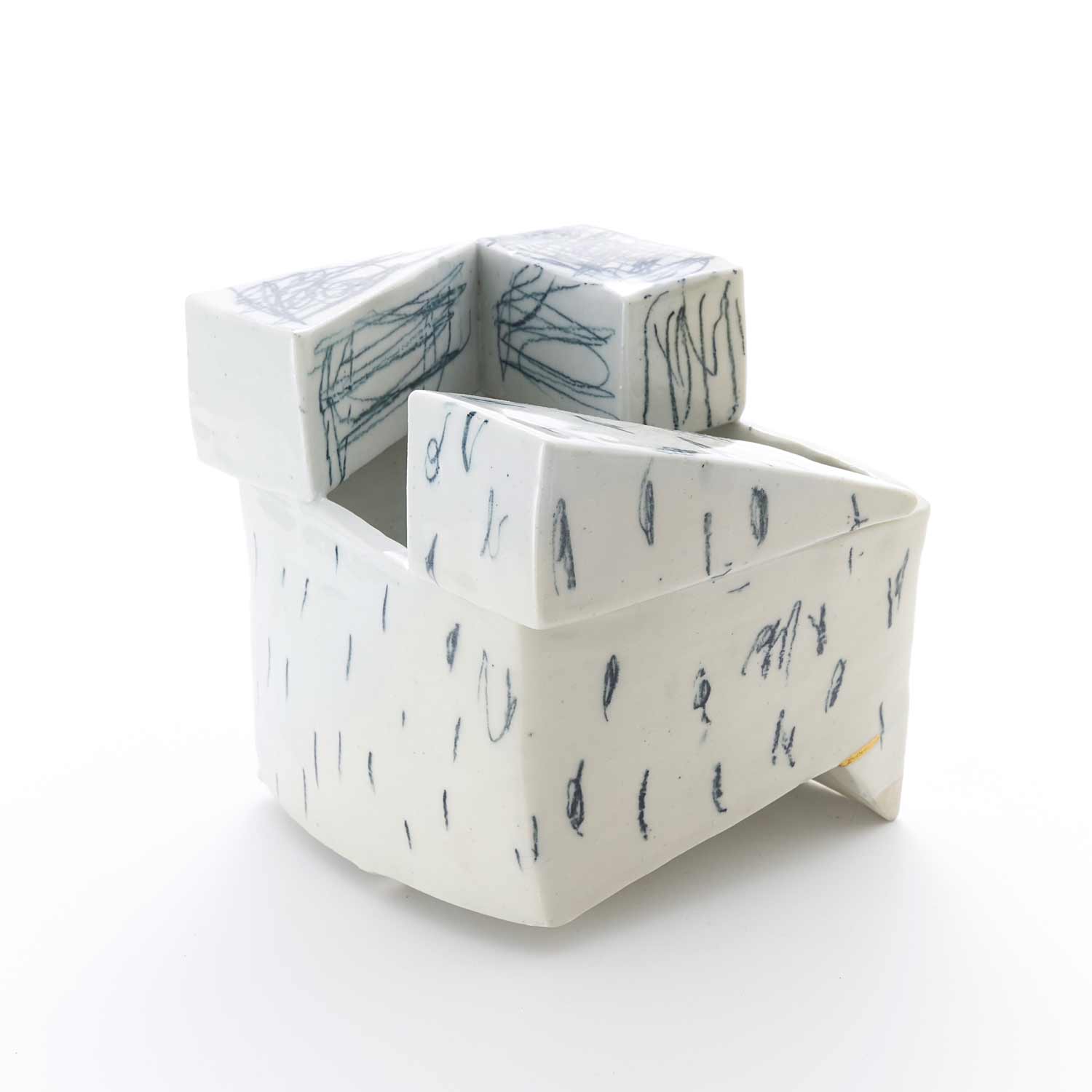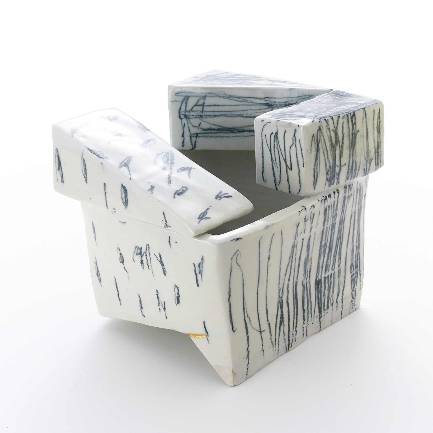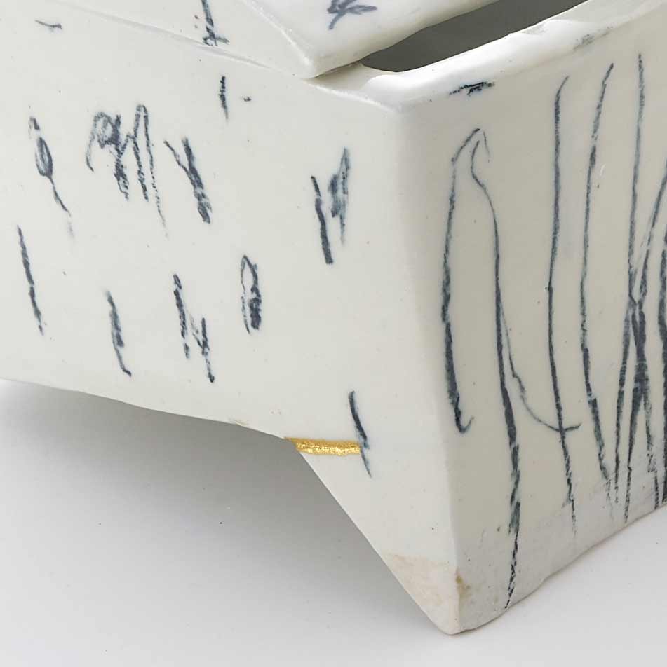 パステルで描かれたクロッキーと、タタラ成形の組み合わせが面白い『ウツワ』。器とオブジェクトの間を行ったり来たり。使い方に想像が膨らみます。製作時のヒビを直した金継ぎがポイント。