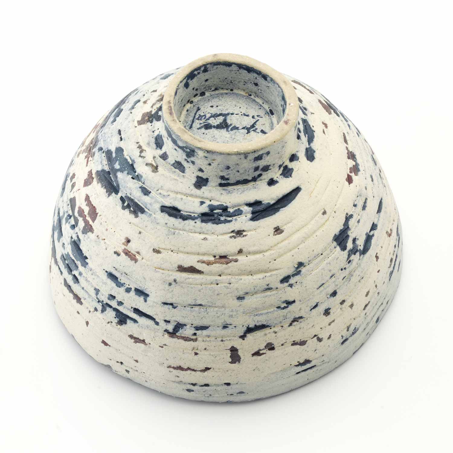沖縄の素材にこだわり器作りをする紺野さん。白土をベースに紺と鉄赤、白化粧の3色で加飾したボウル。横線のディテールが入っています。少し大きめのボウルとなっています。