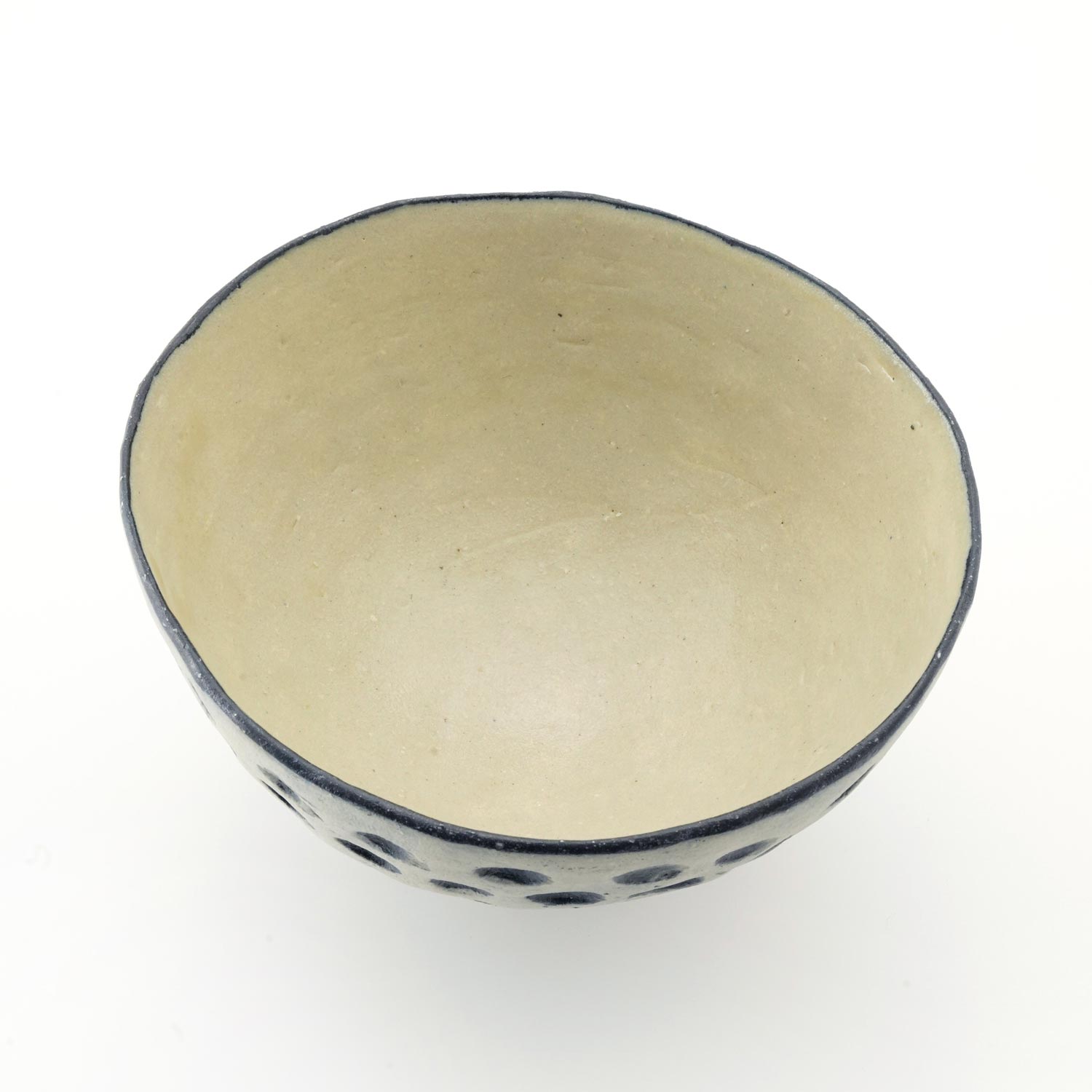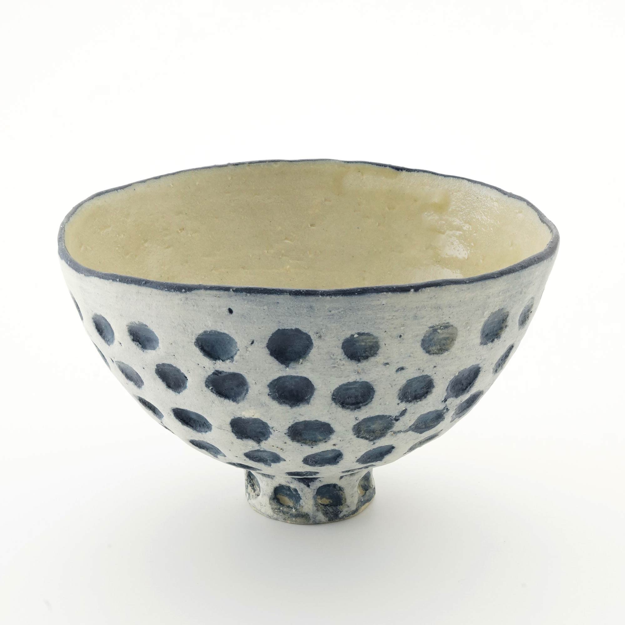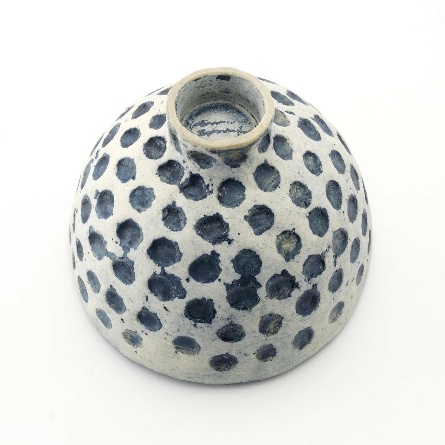沖縄の素材にこだわり器作りをする紺野さん。白土をベースに紺と白化粧ので加飾したボウル。ドットのディテール。少し大きめのボウルとなっています。