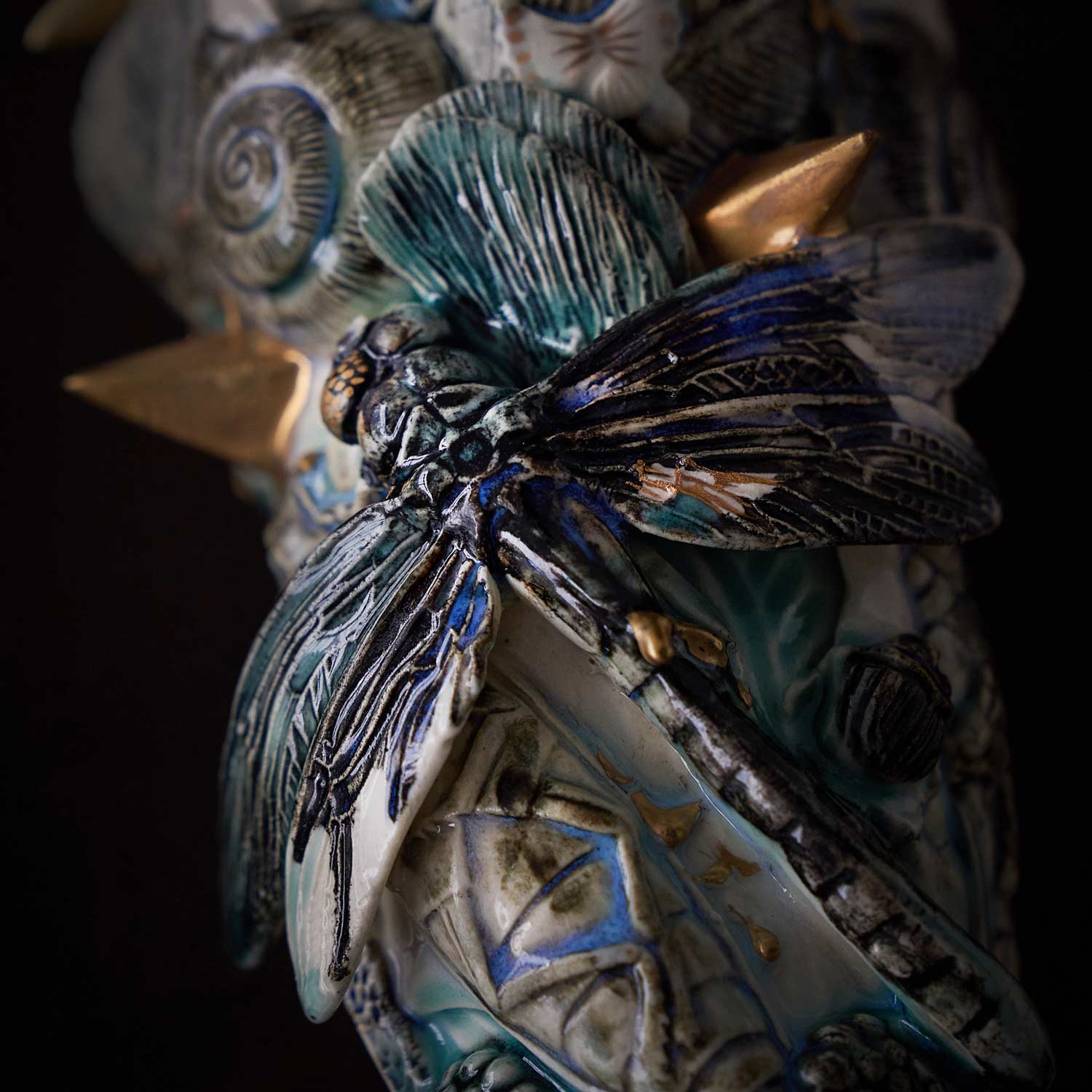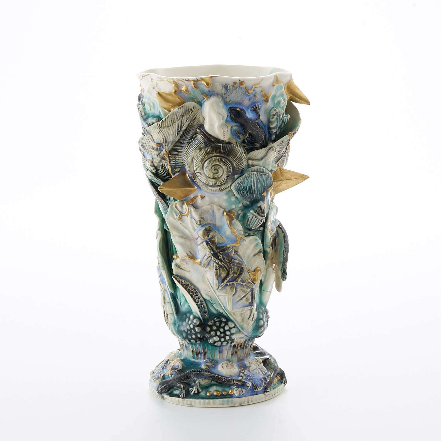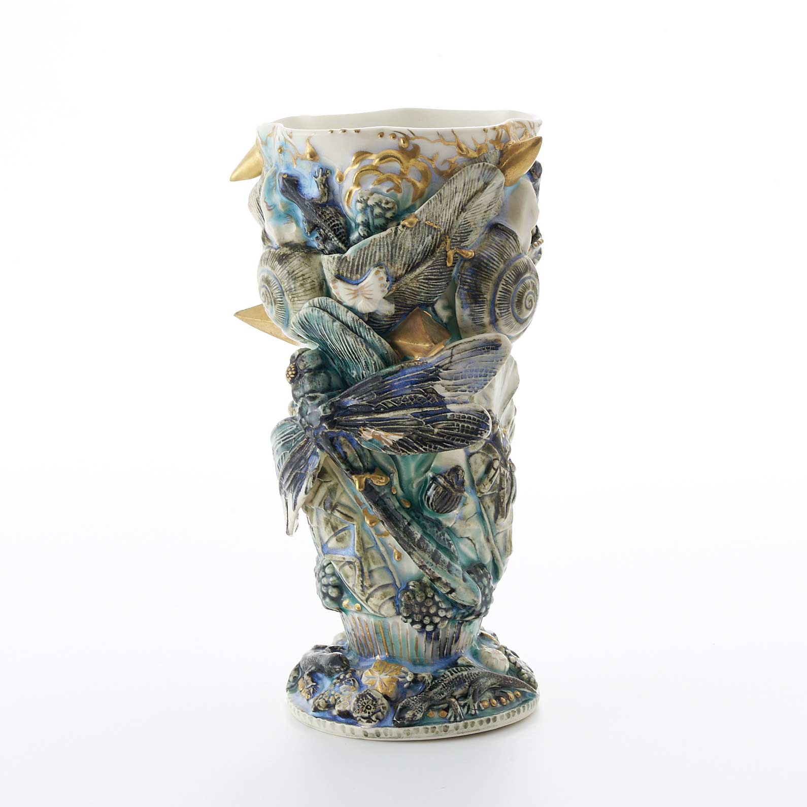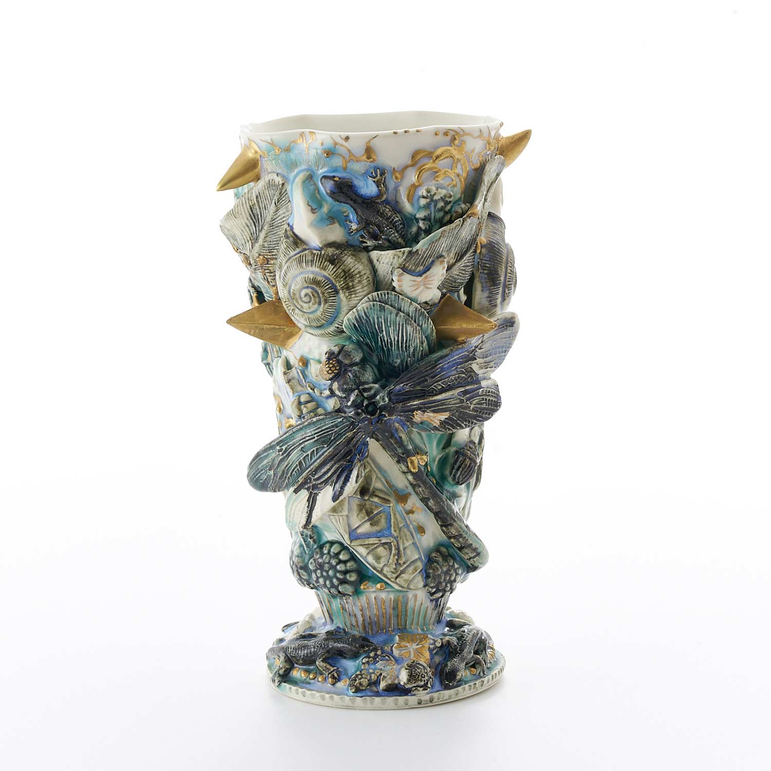 The vase is decorated in an Art Nouveau style with familiar creatures found in the grass, such as dragonflies and snails.