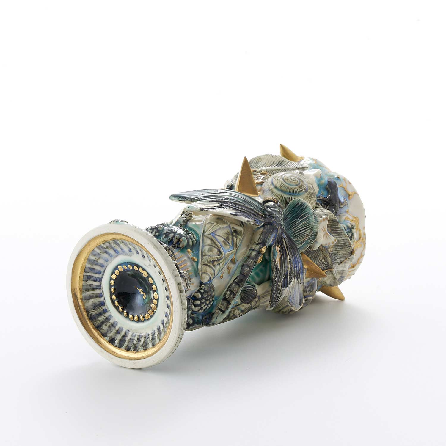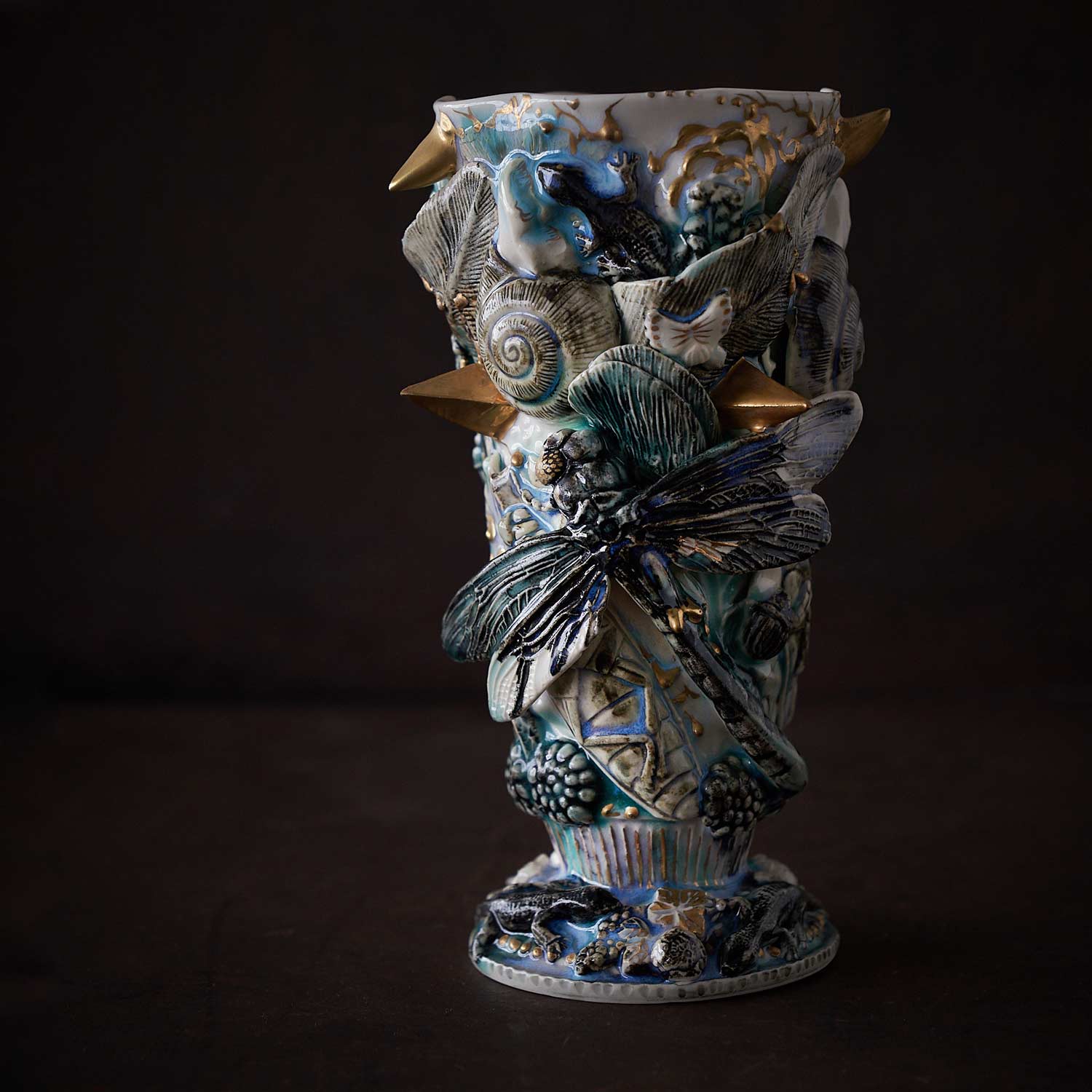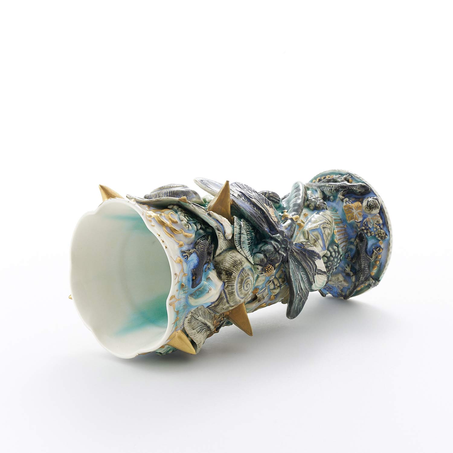 トンボやカタツムリなど、草むらで見つかる身近な生き物がアール・ヌーヴォー調に施された花器です。