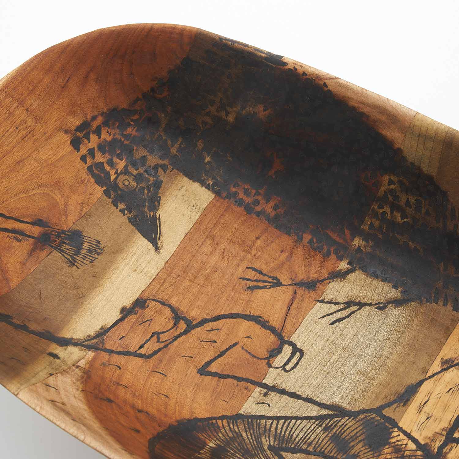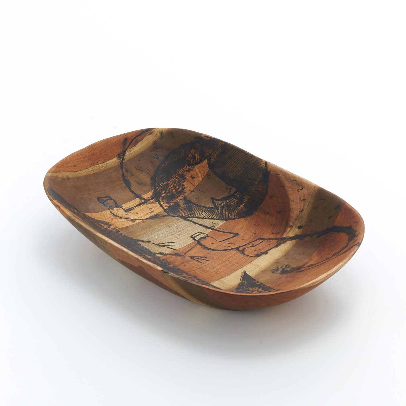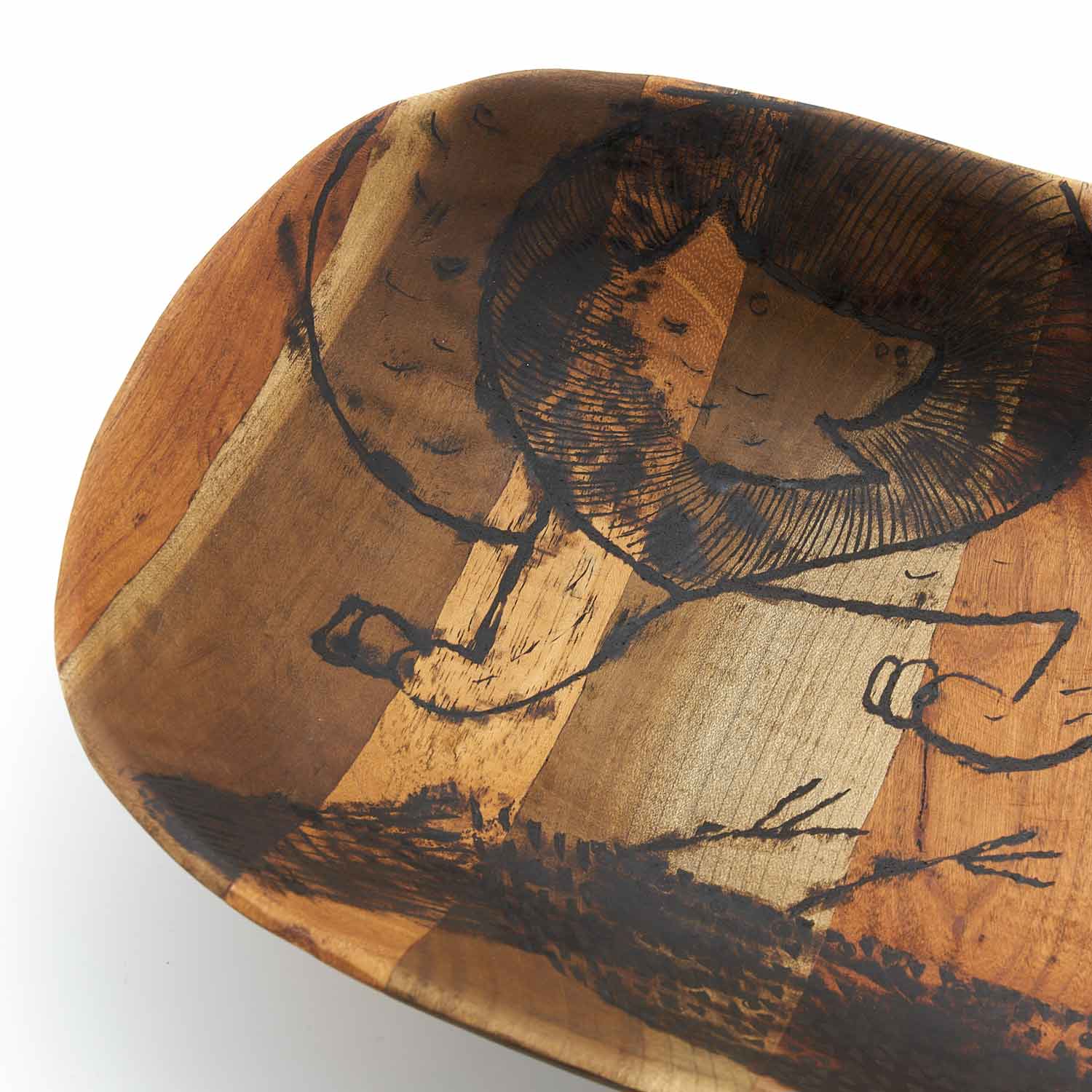 ライオンと鳥が描かれた使いやすい大きさと深さの皿です。様々な種類の木を接ぎ合せ、ノミ、カンナで成形し、生漆+地の粉で描いています。ウレタンを浸みこませて、蜜蝋、荏胡麻油を塗布して仕上げています。食器としてお使いいただけます。