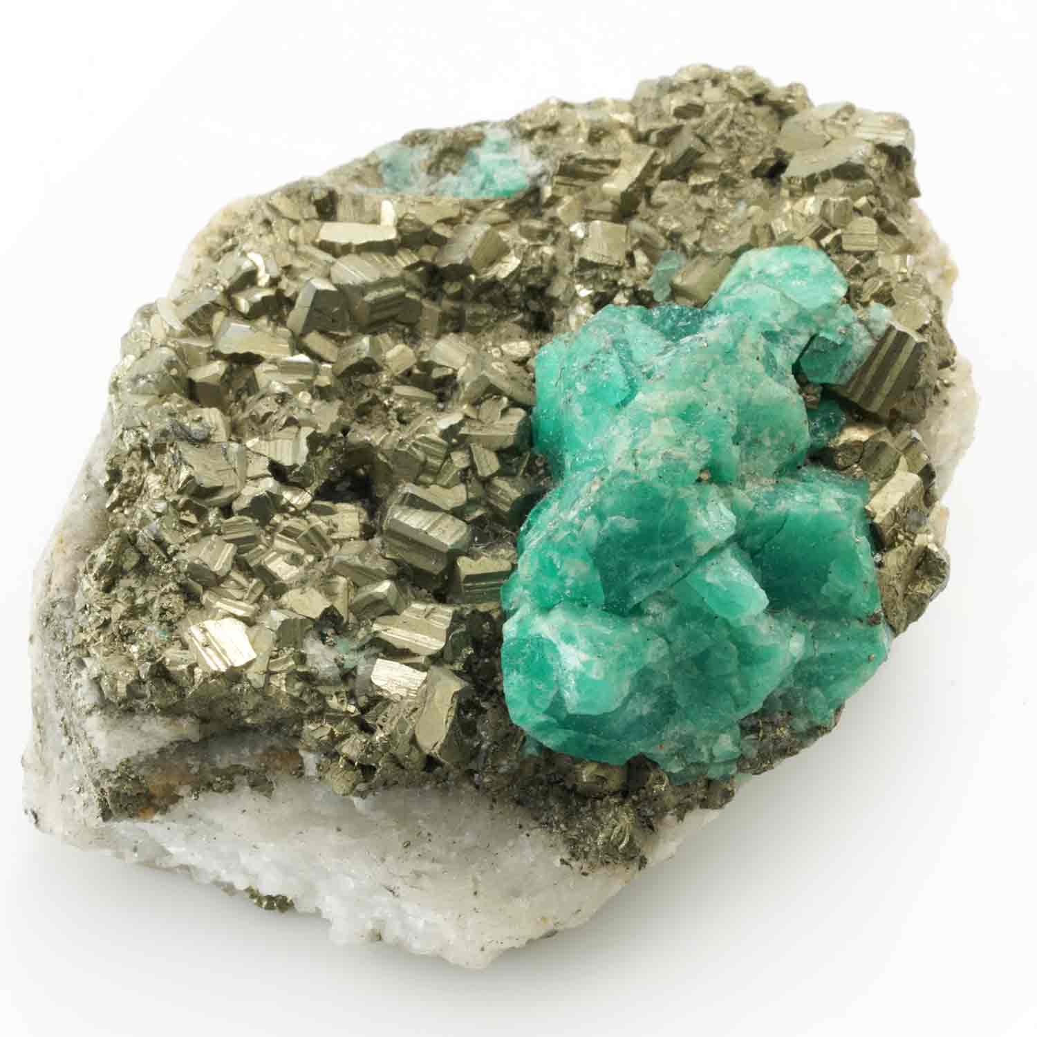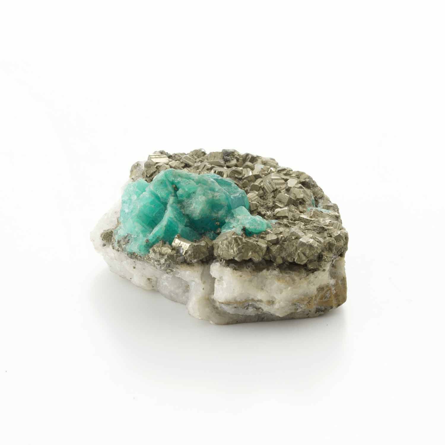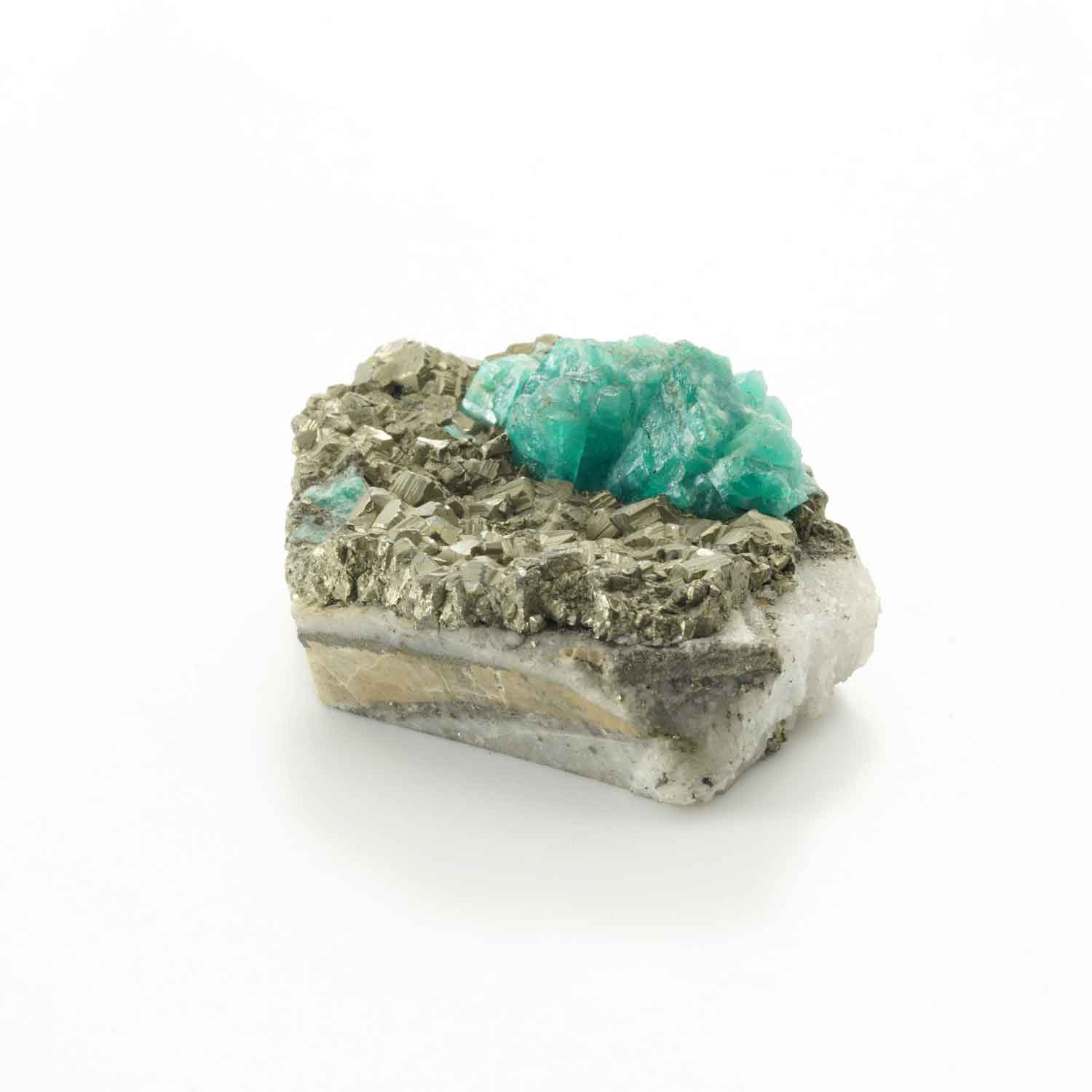 キラキラ光る黄鉄鉱の母石に山のような形のエメラルド。断面の地層のような模様も楽しい鉱石です。