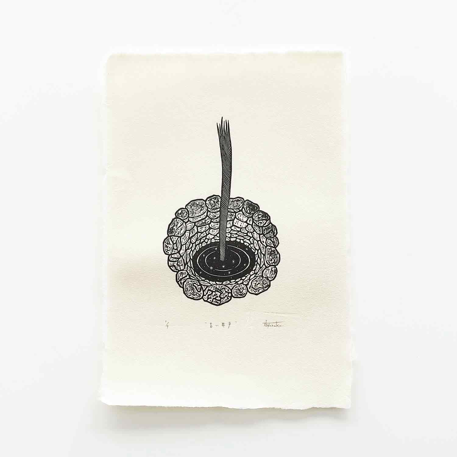"[キムホノコラボ作品] 田中さんがキムさんのアトリエをフィールドワークし制作した木版画作品です。この作品のタイトルは「古い井戸」。キムさんの窯場にある古い井戸です。生命感のある井戸に描がかれています。