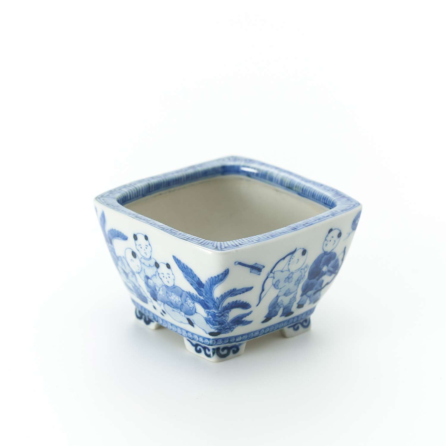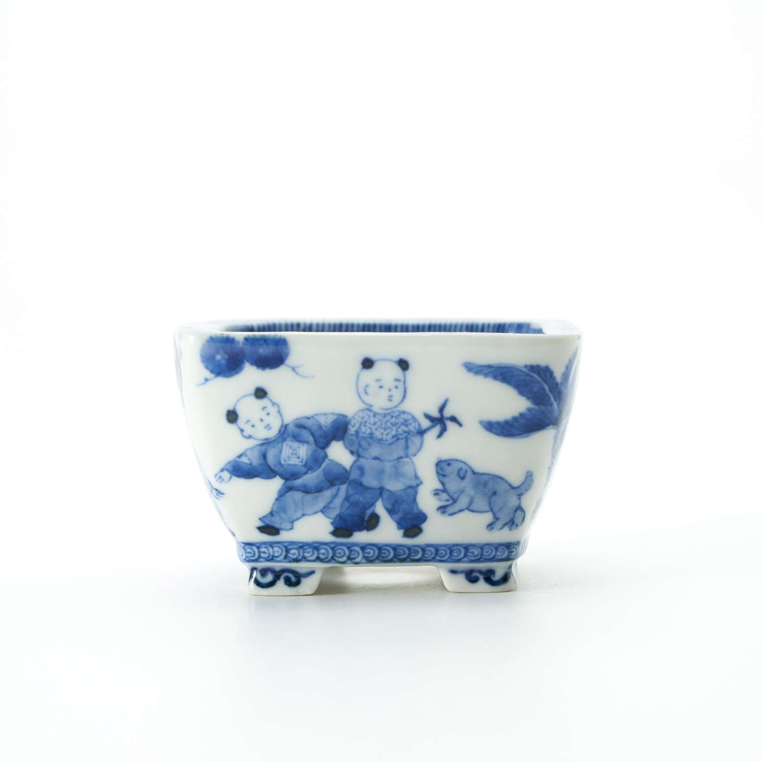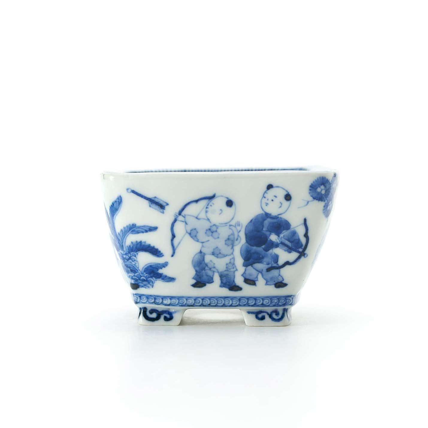 It is made from unglazed pottery and is painted with a thin brush using Sometsuke-gosu (a type of pigment). It can be used as a moss bonsai or as a single flower vase with a cup inside.