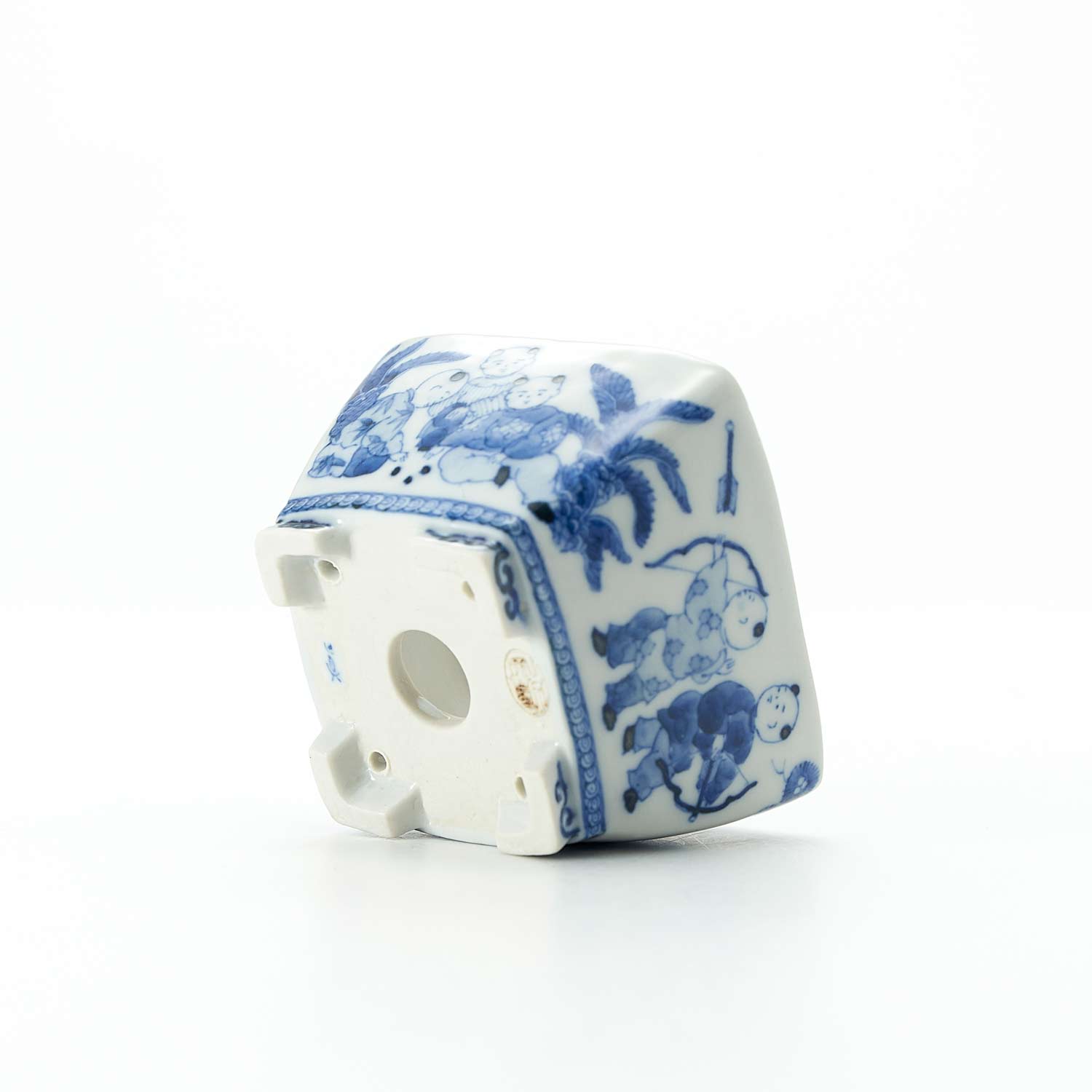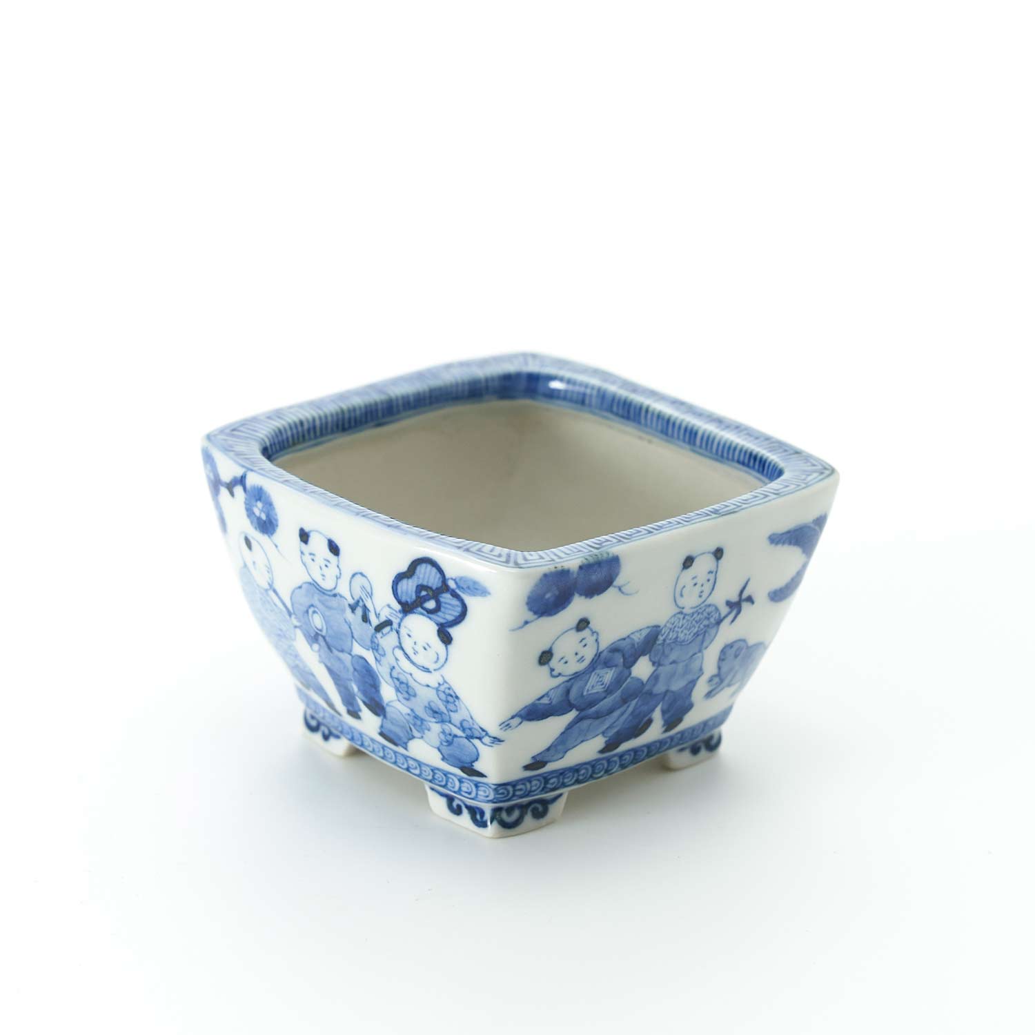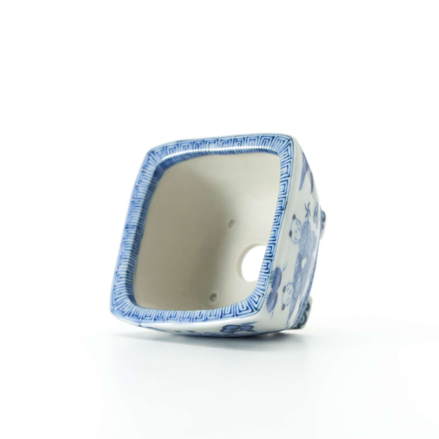 素焼きの状態に染付呉須(絵具)で細い筆を使い線描きした後、だみ、といって濃淡を付けます。苔盆栽にしたり、中にカップを仕込んで一輪挿しとしもご使用いただけます。
