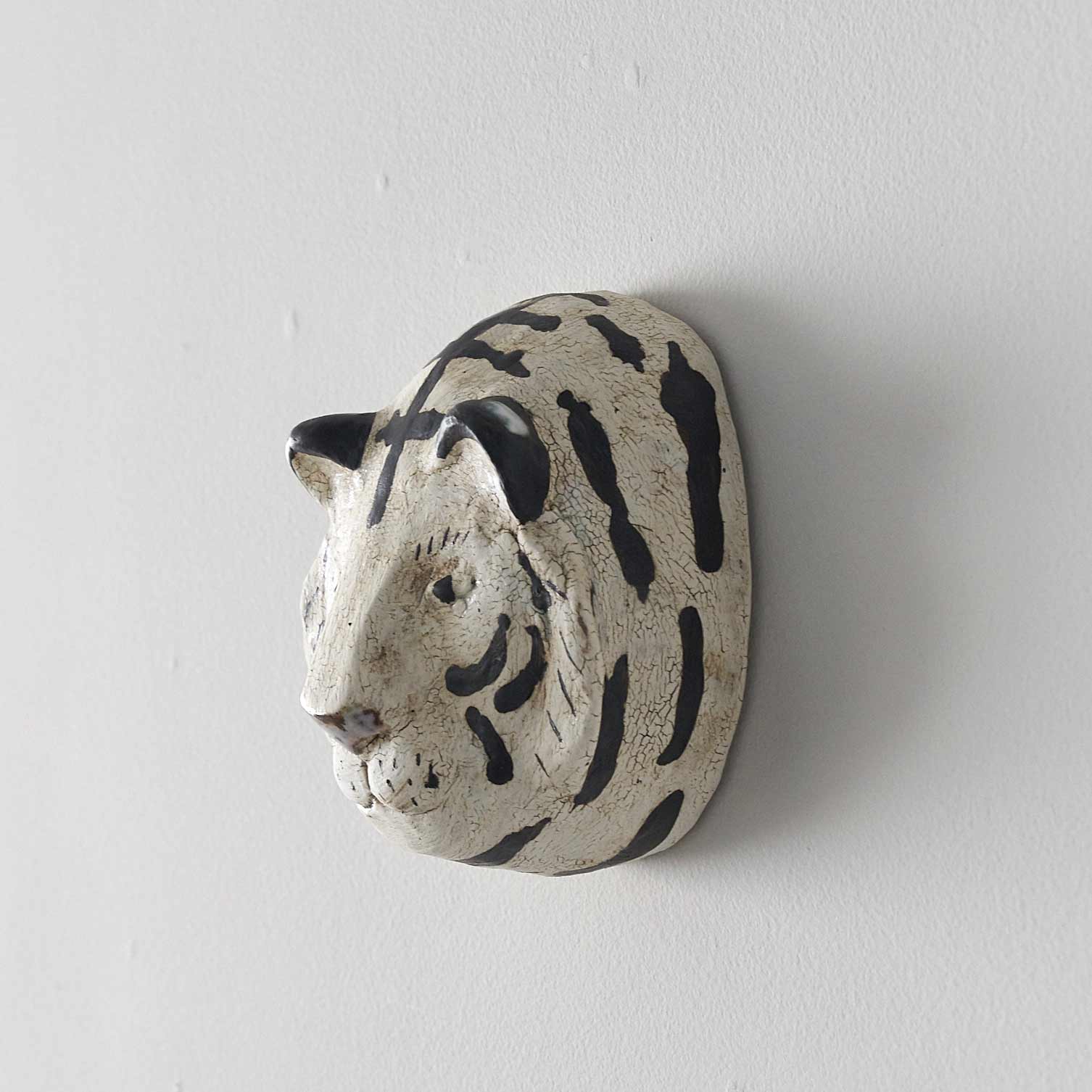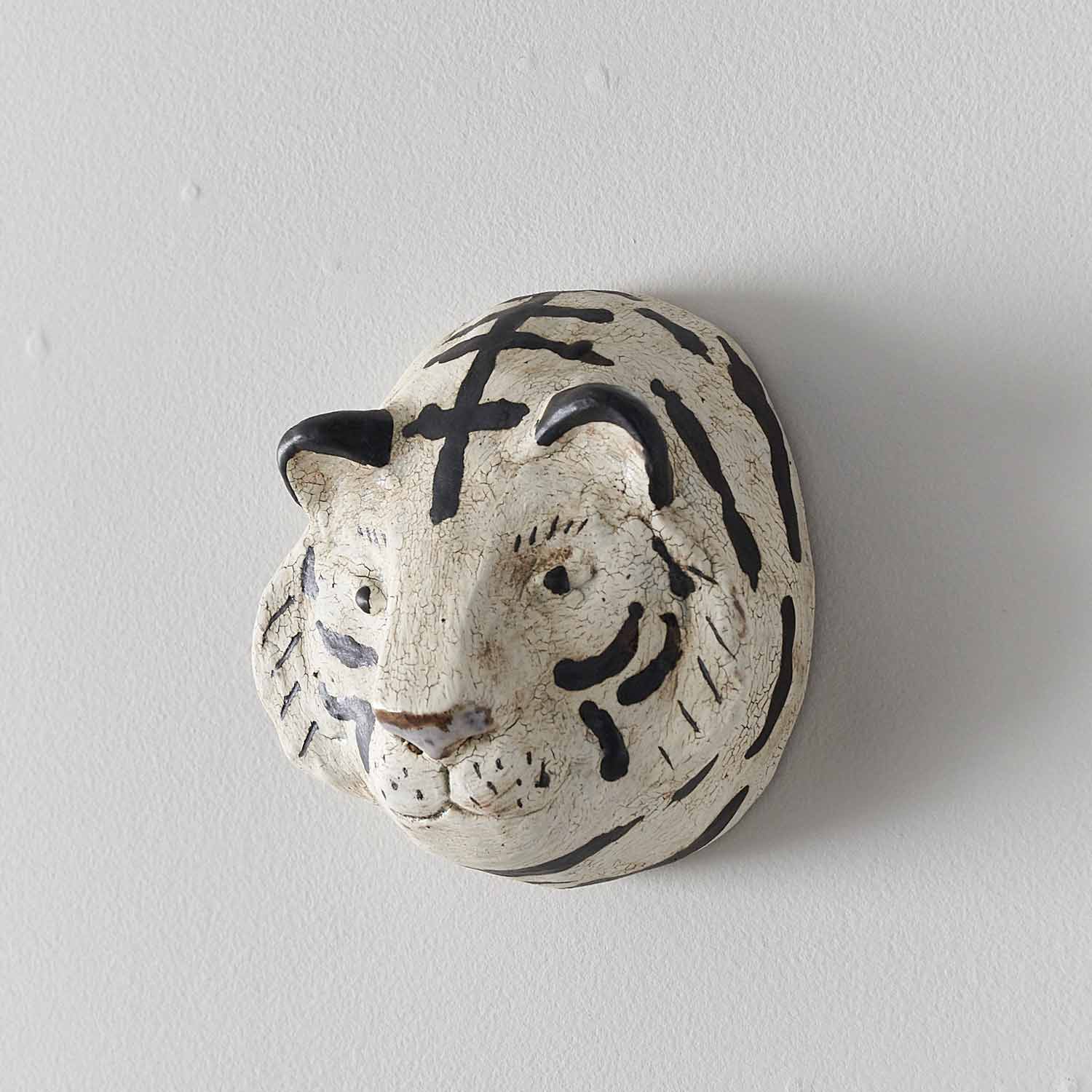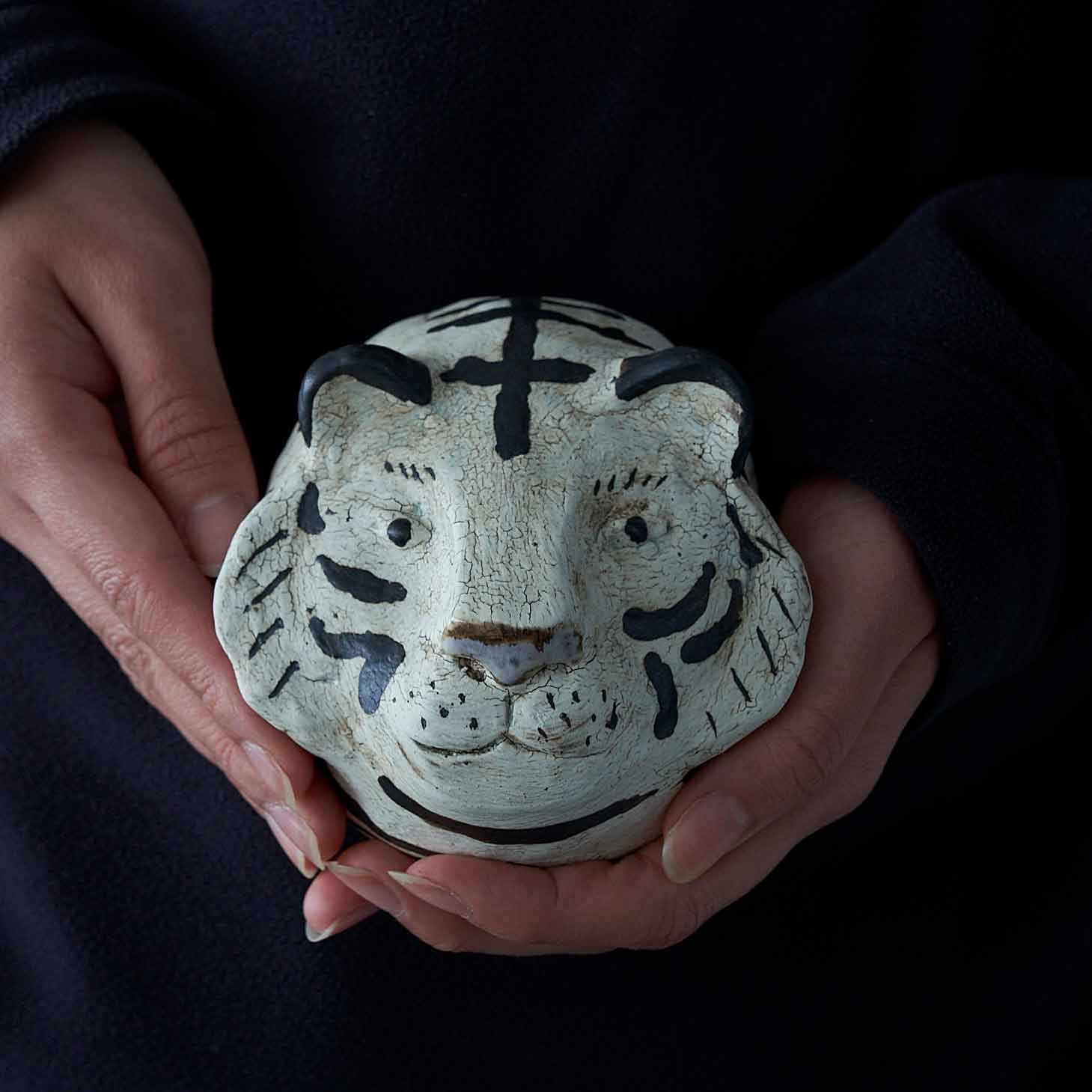 This is a wall hanging of a tiger, the Chinese zodiac sign for the year 2022. It is a fun piece with a bright expression. It is palm-sized, and the muddy glaze cracks all over are a key feature.
