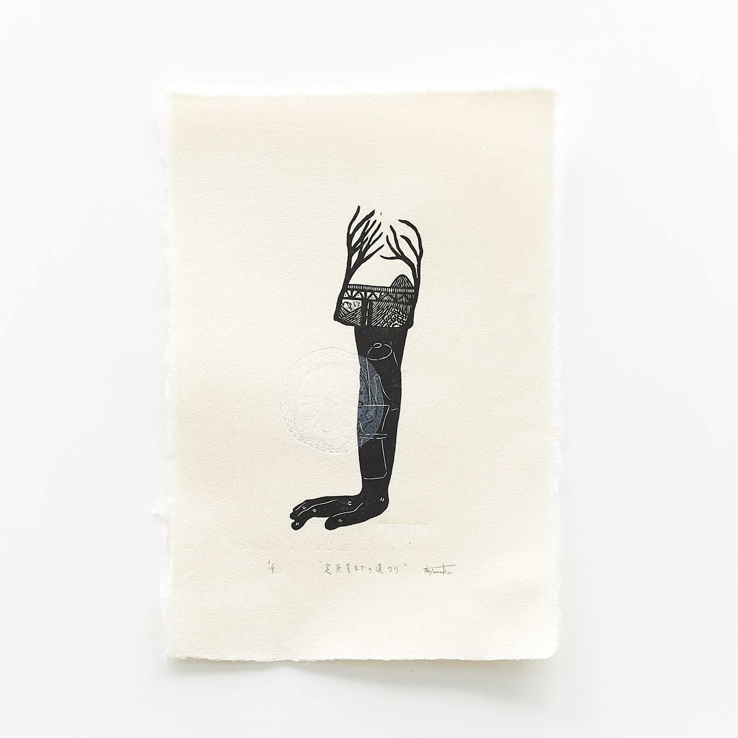 [キムホノコラボ作品] 田中さんがキムさんのアトリエをフィールドワークし制作した木版画作品です。この作品のタイトルは「定光寺までの道のり」。キムさんのアトリエに向かう途中、バーストしてしまった車のタイヤとその場所の景色とコーヒーを入れる手がモチーフです。限定部数7枚。