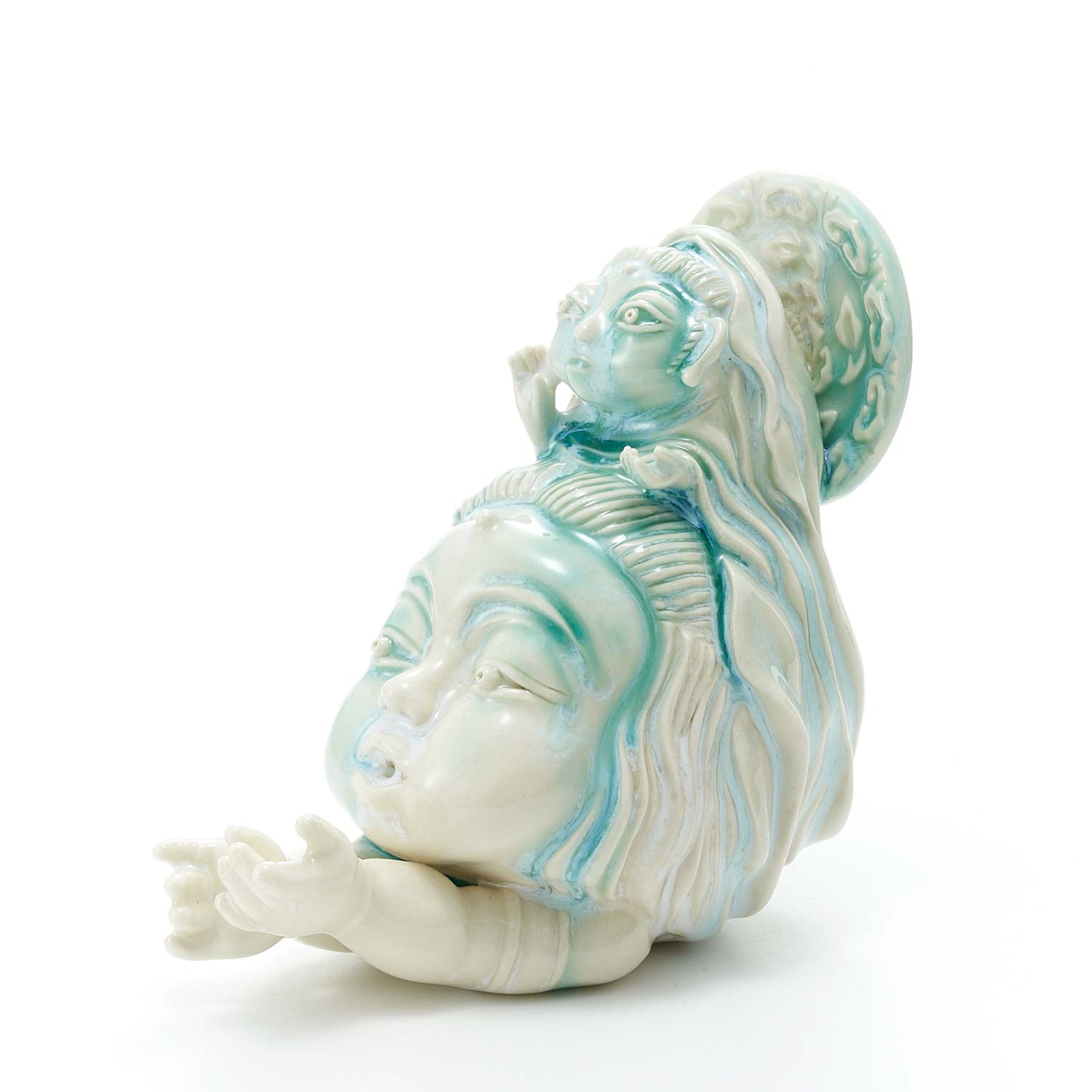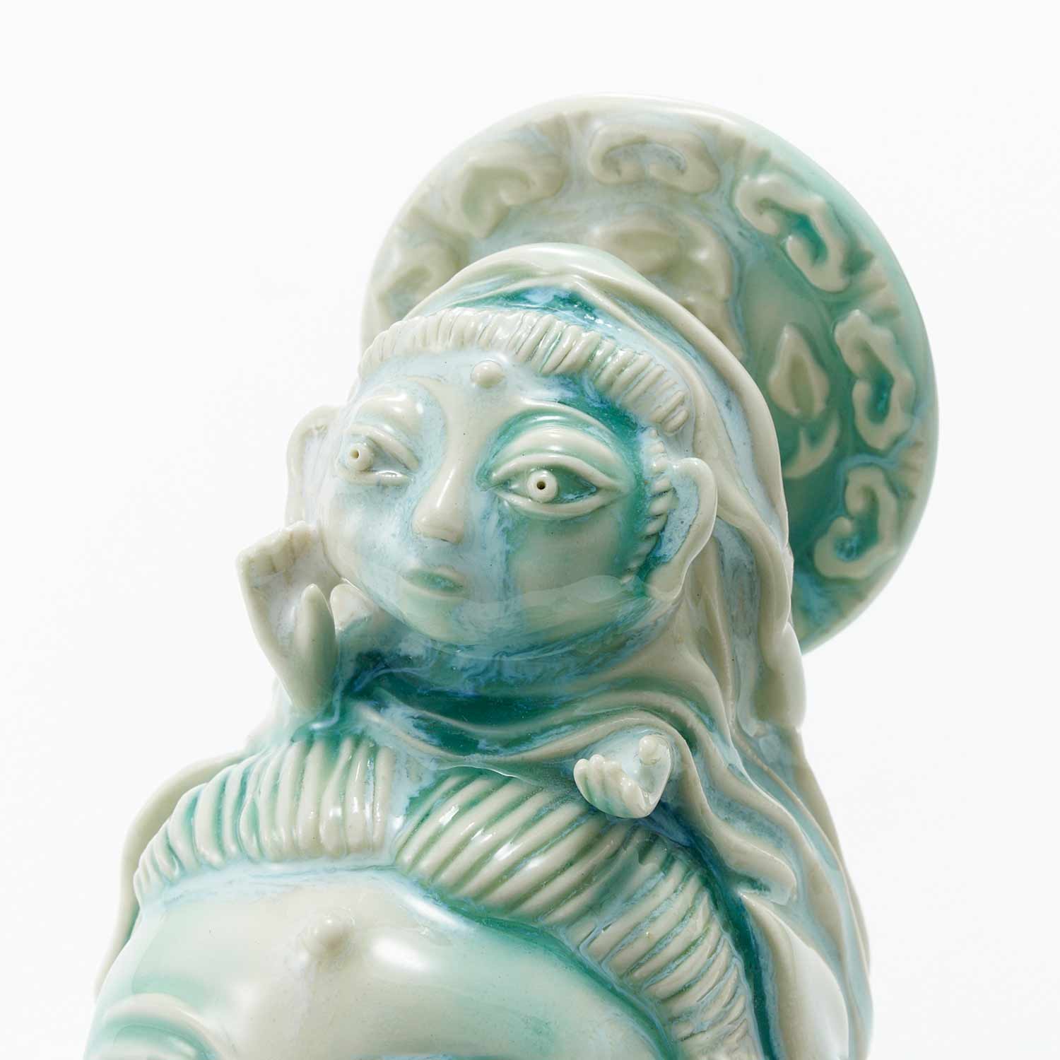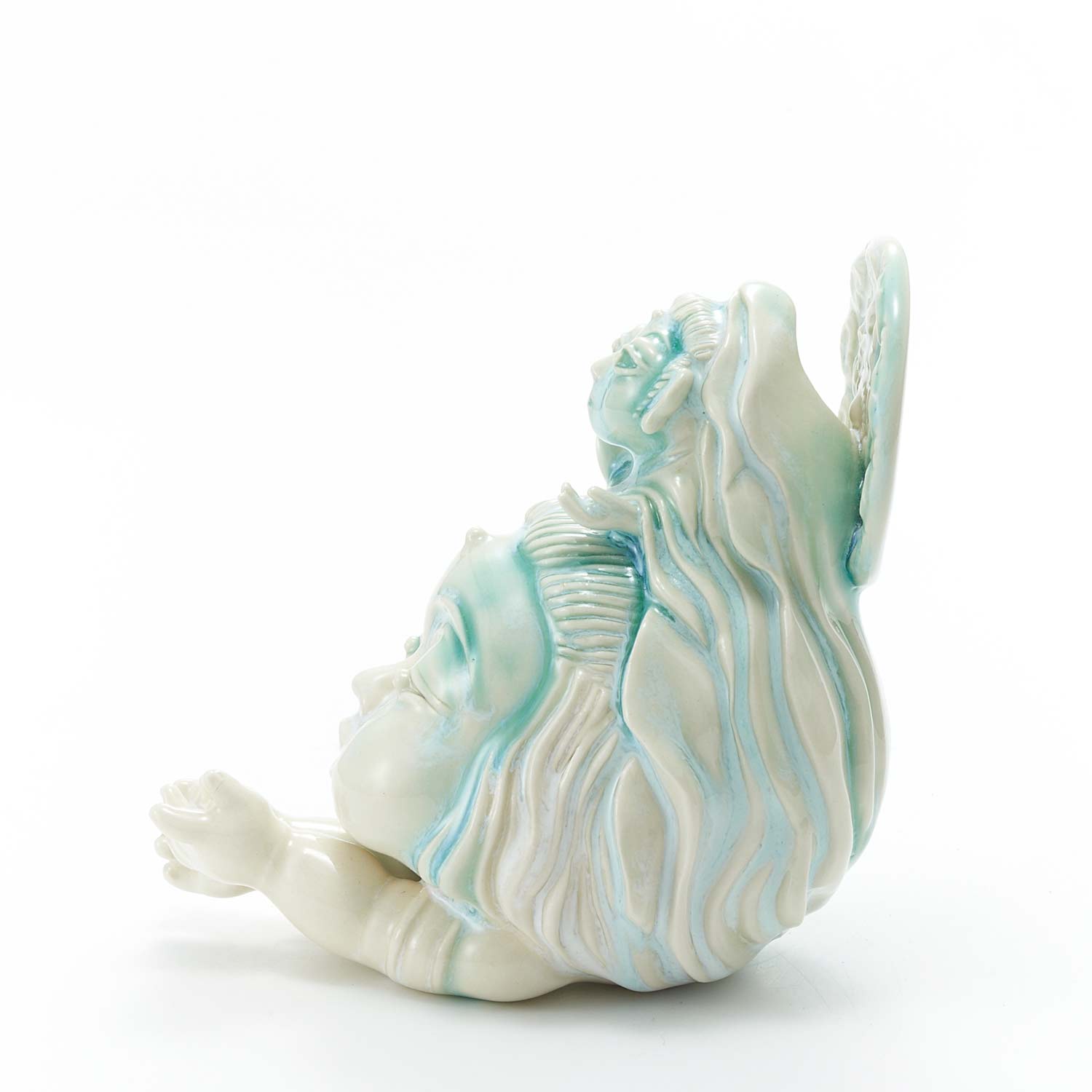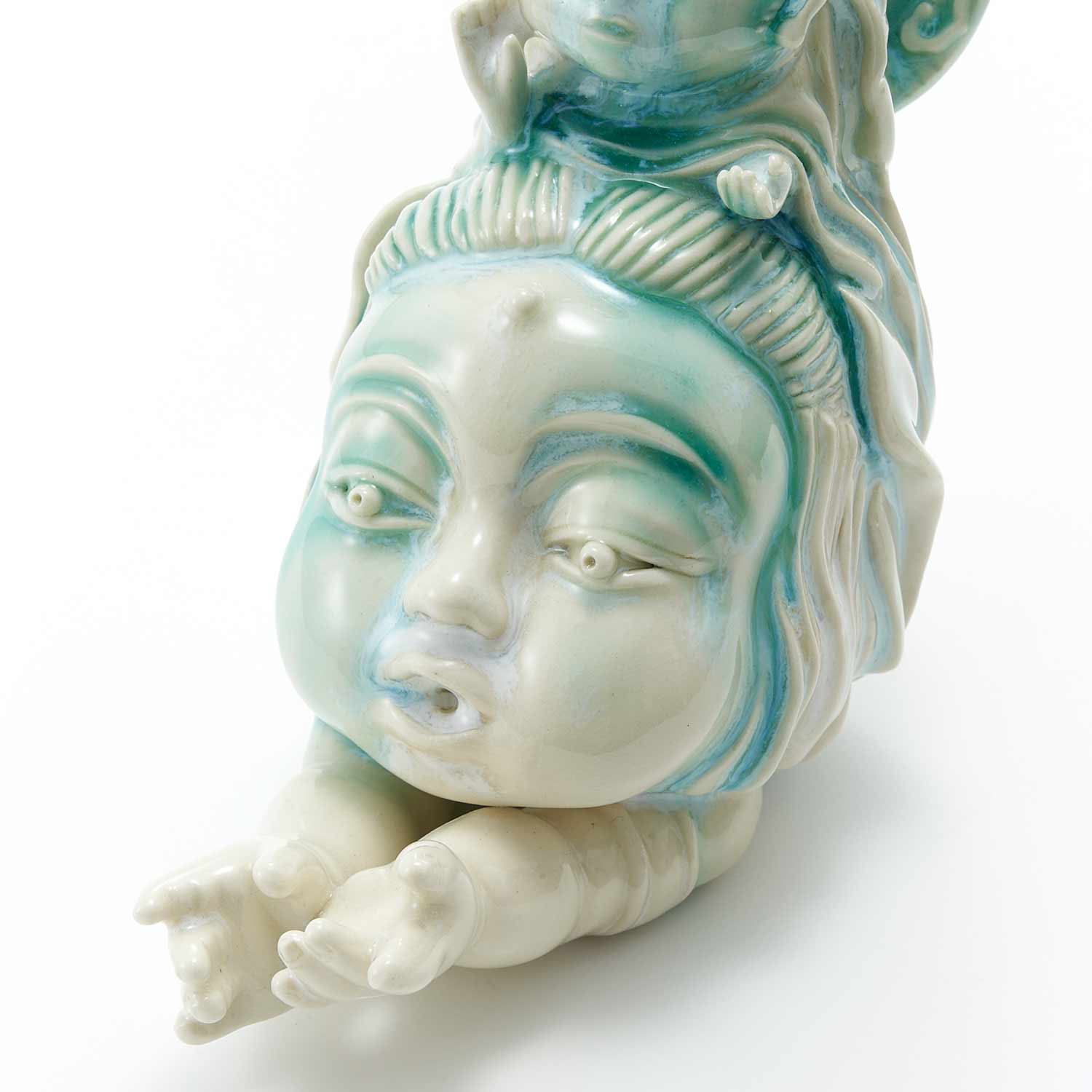 観音さまのようなやさしい微笑みの作品です。差し伸べた手がなんとも言えない雰囲気を漂わせています。花器としてもお使いいただけます。淡いブルーの流れる釉薬が美しいです。