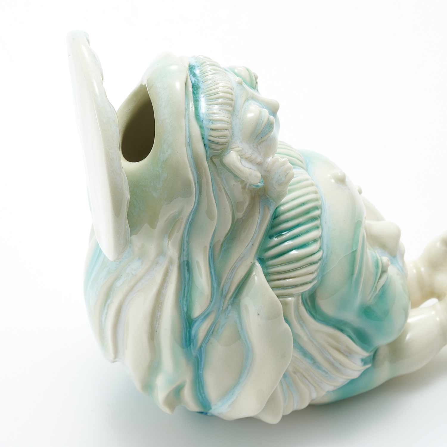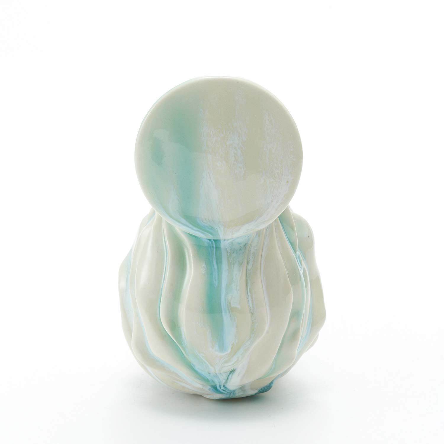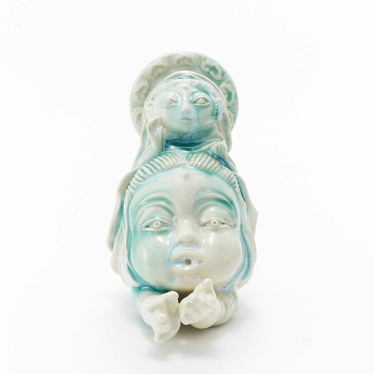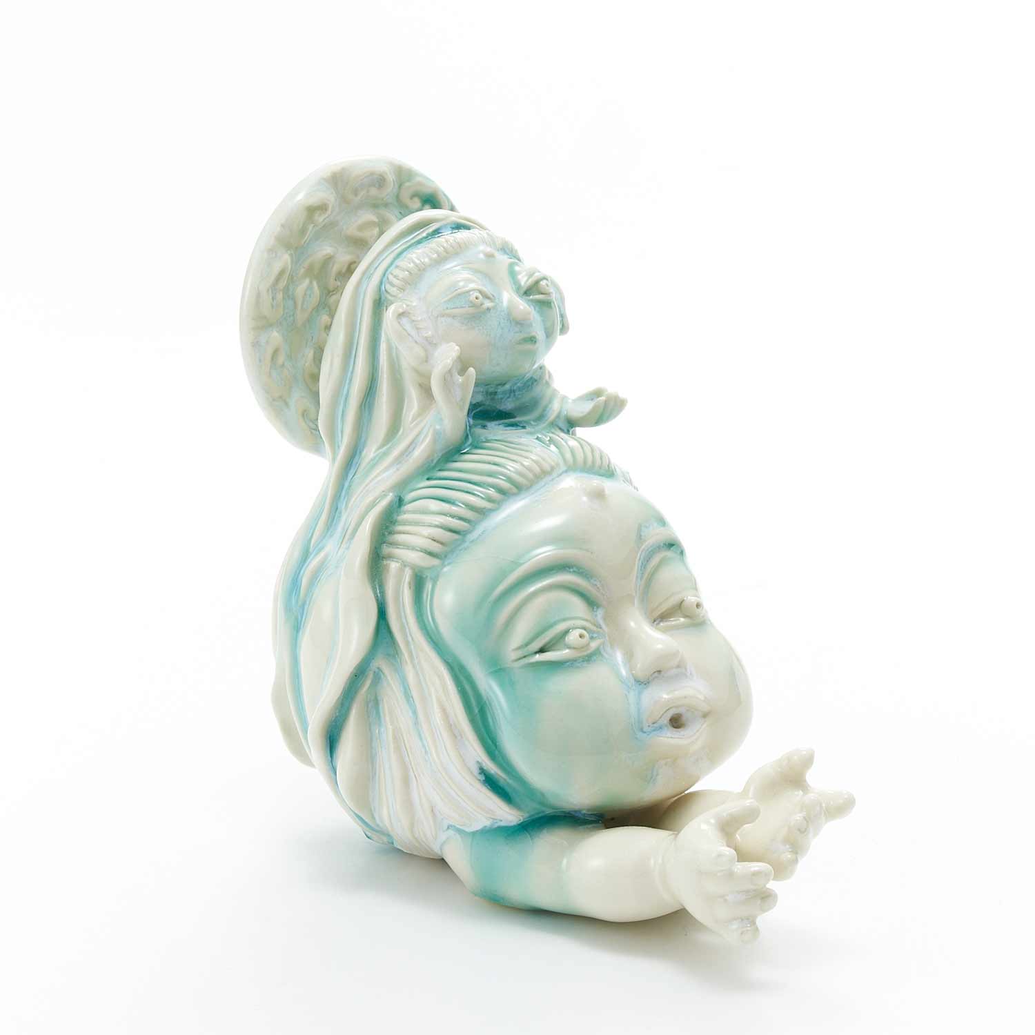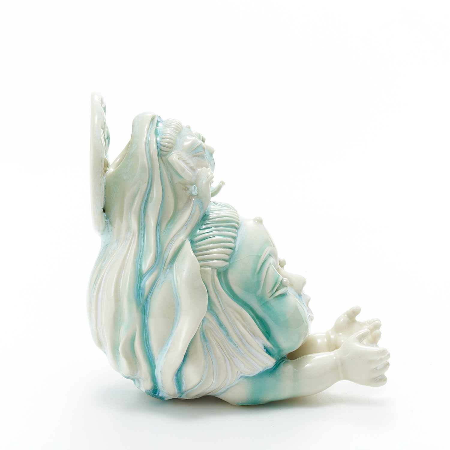 観音さまのようなやさしい微笑みの作品です。差し伸べた手がなんとも言えない雰囲気を漂わせています。花器としてもお使いいただけます。淡いブルーの流れる釉薬が美しいです。