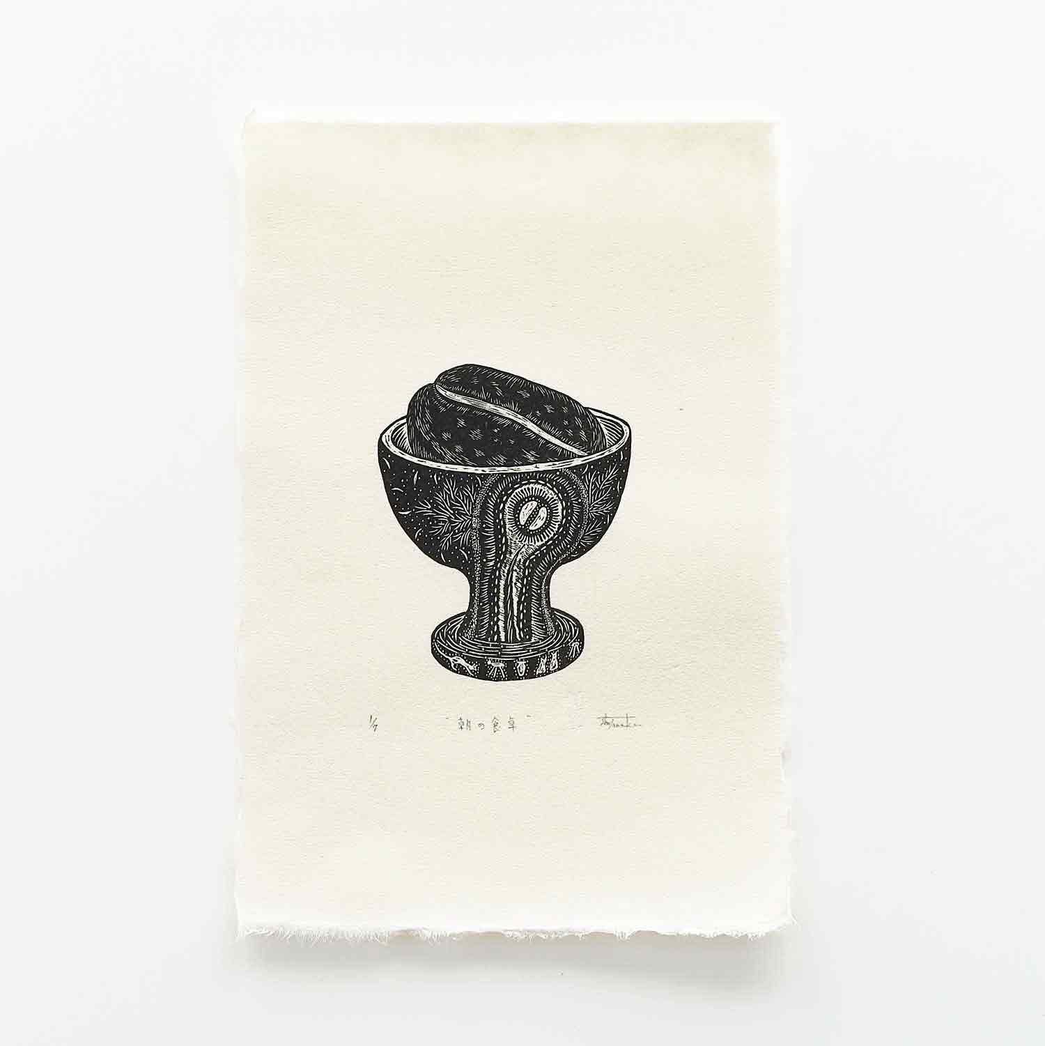 [KIM Hono collaboration work] This is a woodblock print that TANAKA created after fieldwork in Mr. KIM's studio.The title of this piece is "Morning Table. The motif of this piece is the egg stand and coffee served at the breakfast prepared by KIM. Limited edition of 7 copies.