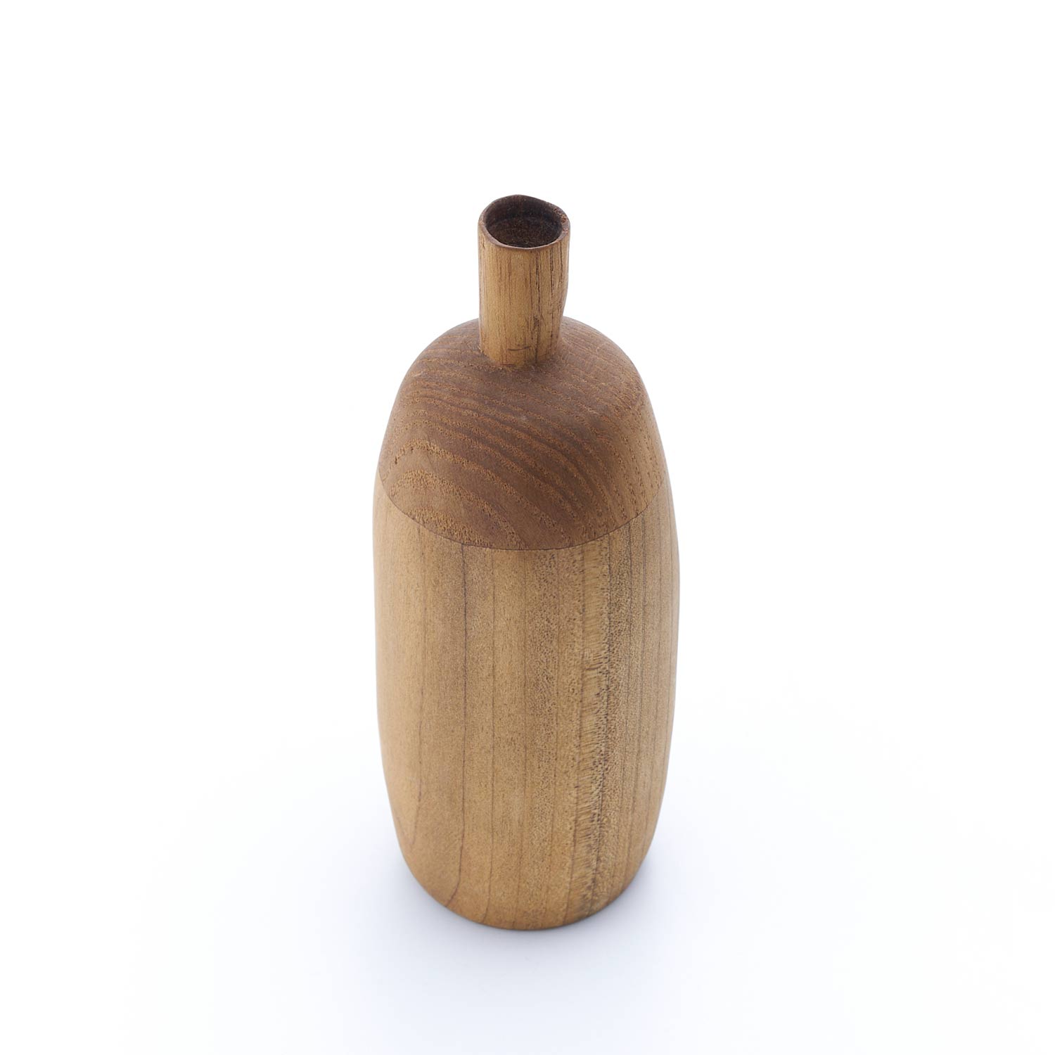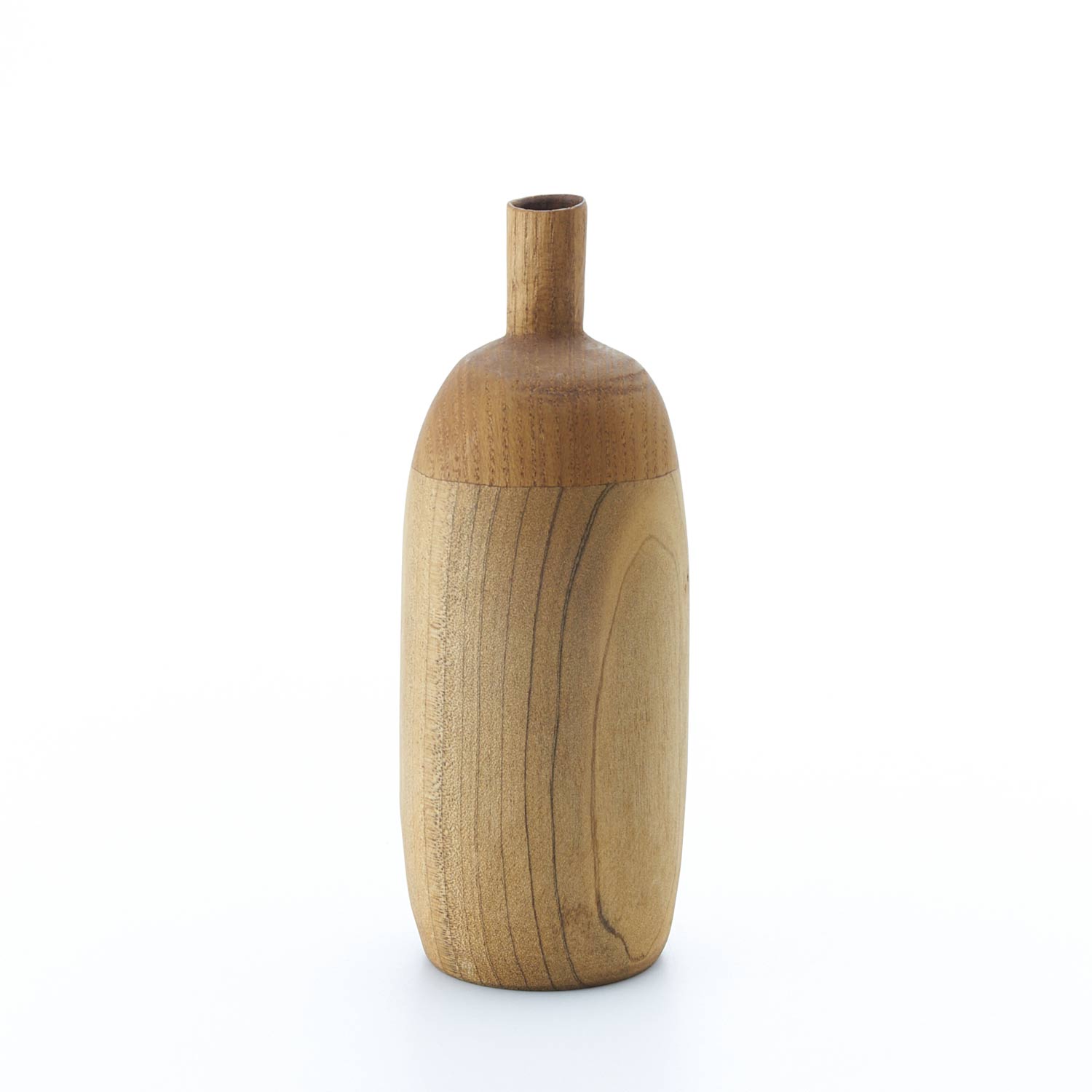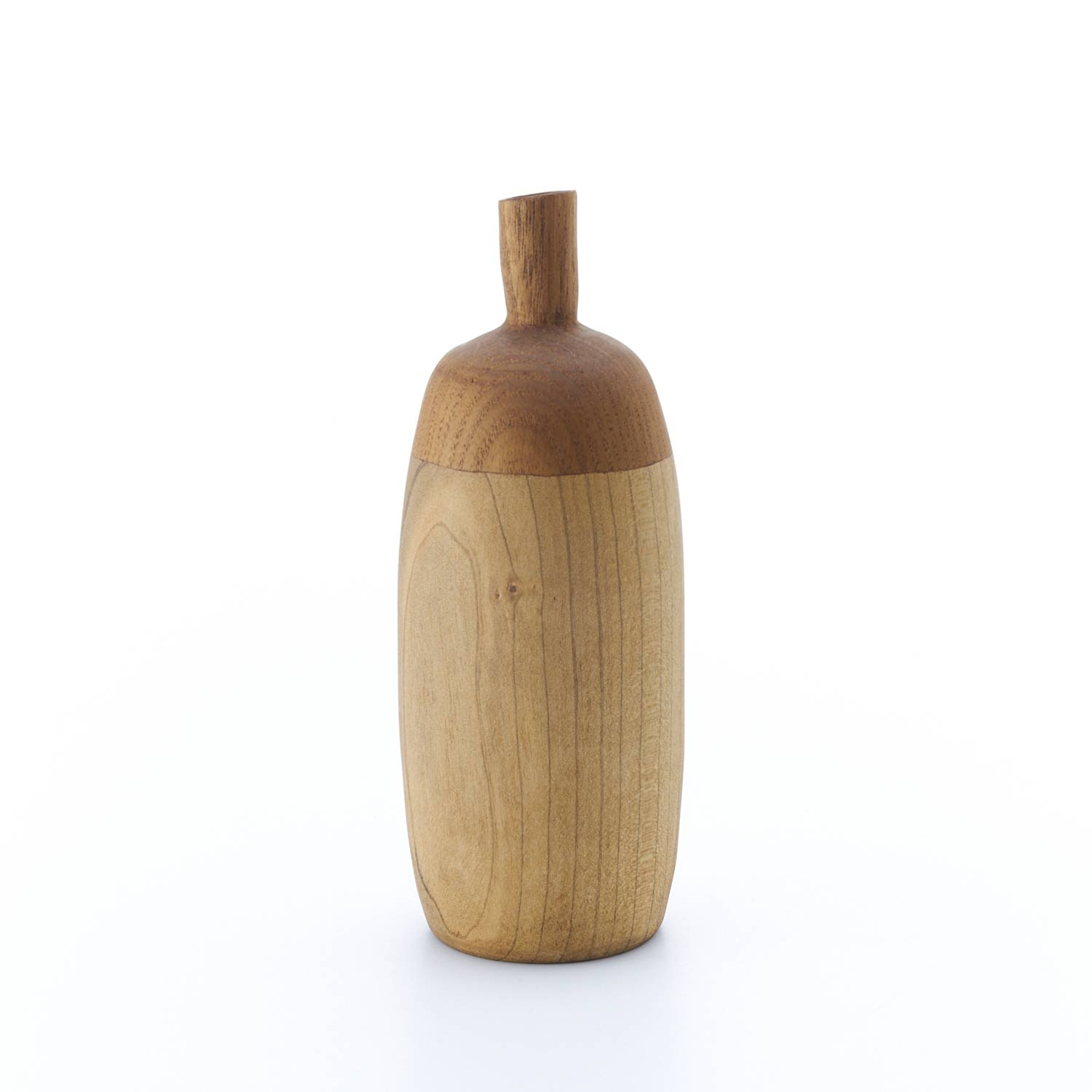 様々な種類の木を接ぎ合せ、木工旋盤、ノミ、カンナで成形し、蜜蝋、荏胡麻油を塗布して仕上げています。水は入れられませんので、ドライフラワーなどでお楽しみください。オブジェとしても素敵な佇まいです。