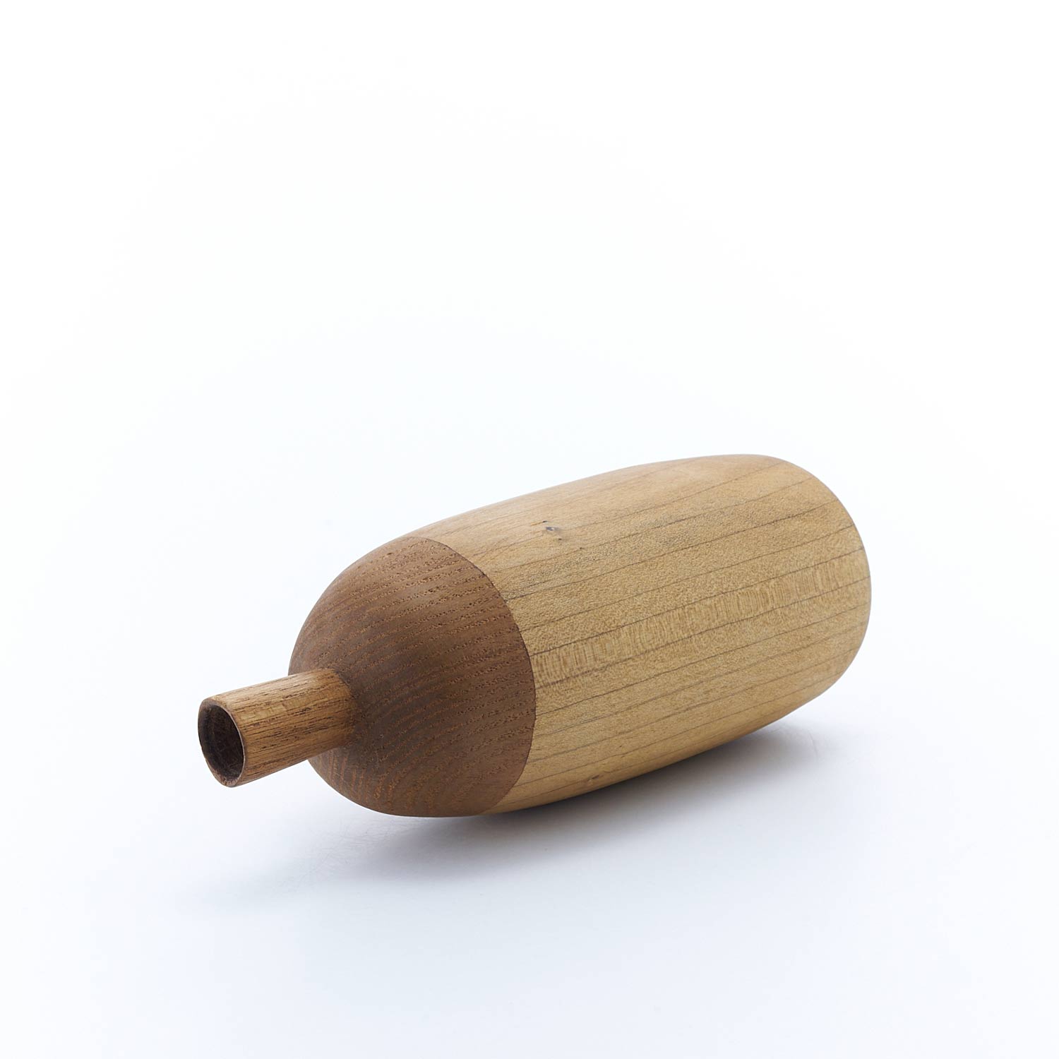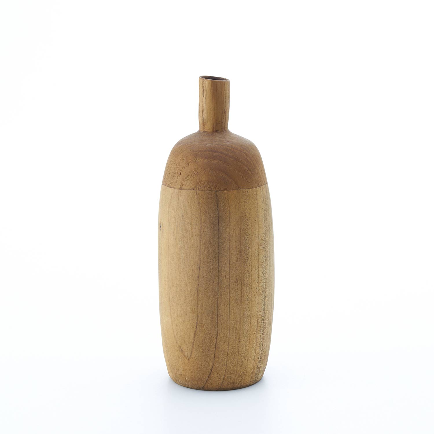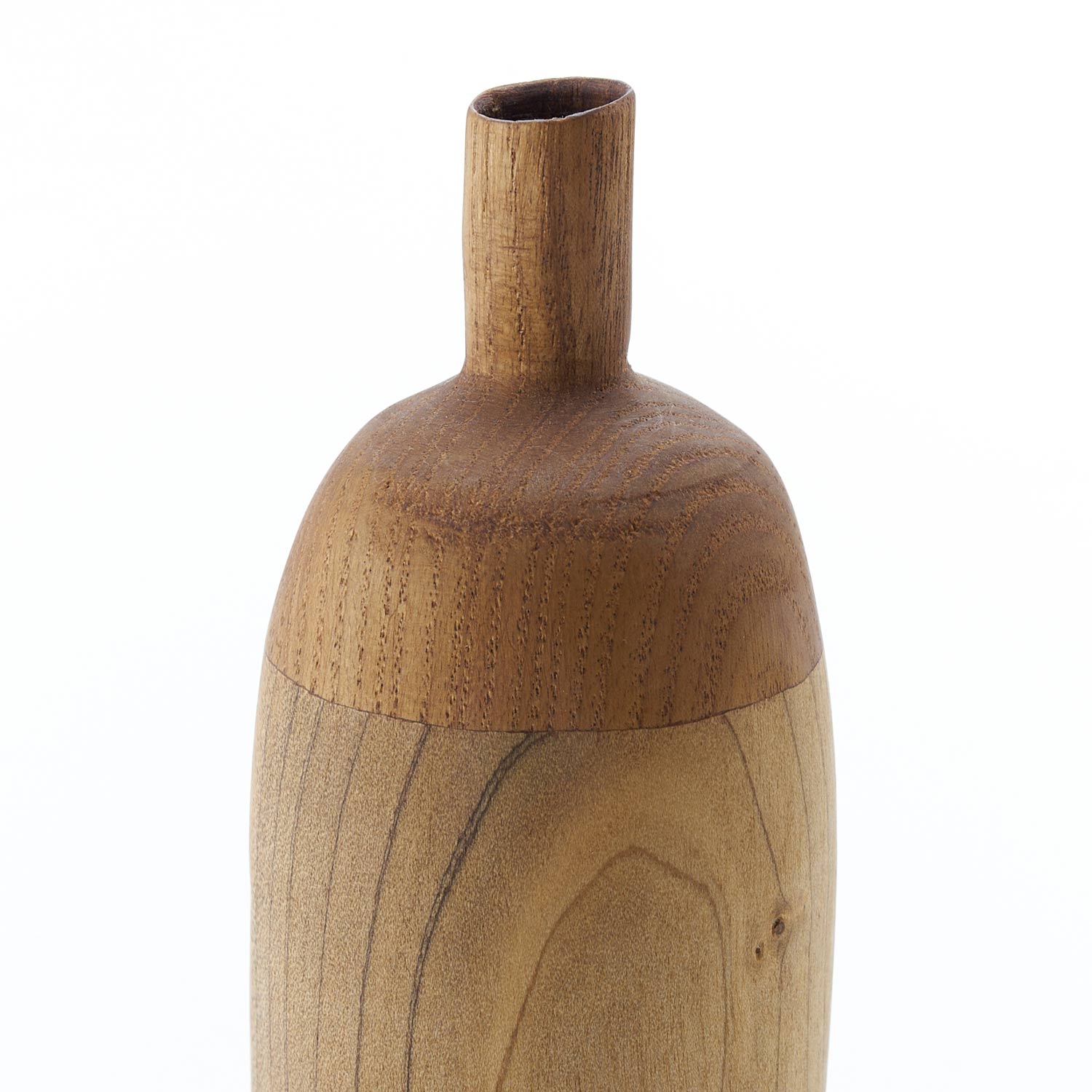 様々な種類の木を接ぎ合せ、木工旋盤、ノミ、カンナで成形し、蜜蝋、荏胡麻油を塗布して仕上げています。水は入れられませんので、ドライフラワーなどでお楽しみください。オブジェとしても素敵な佇まいです。