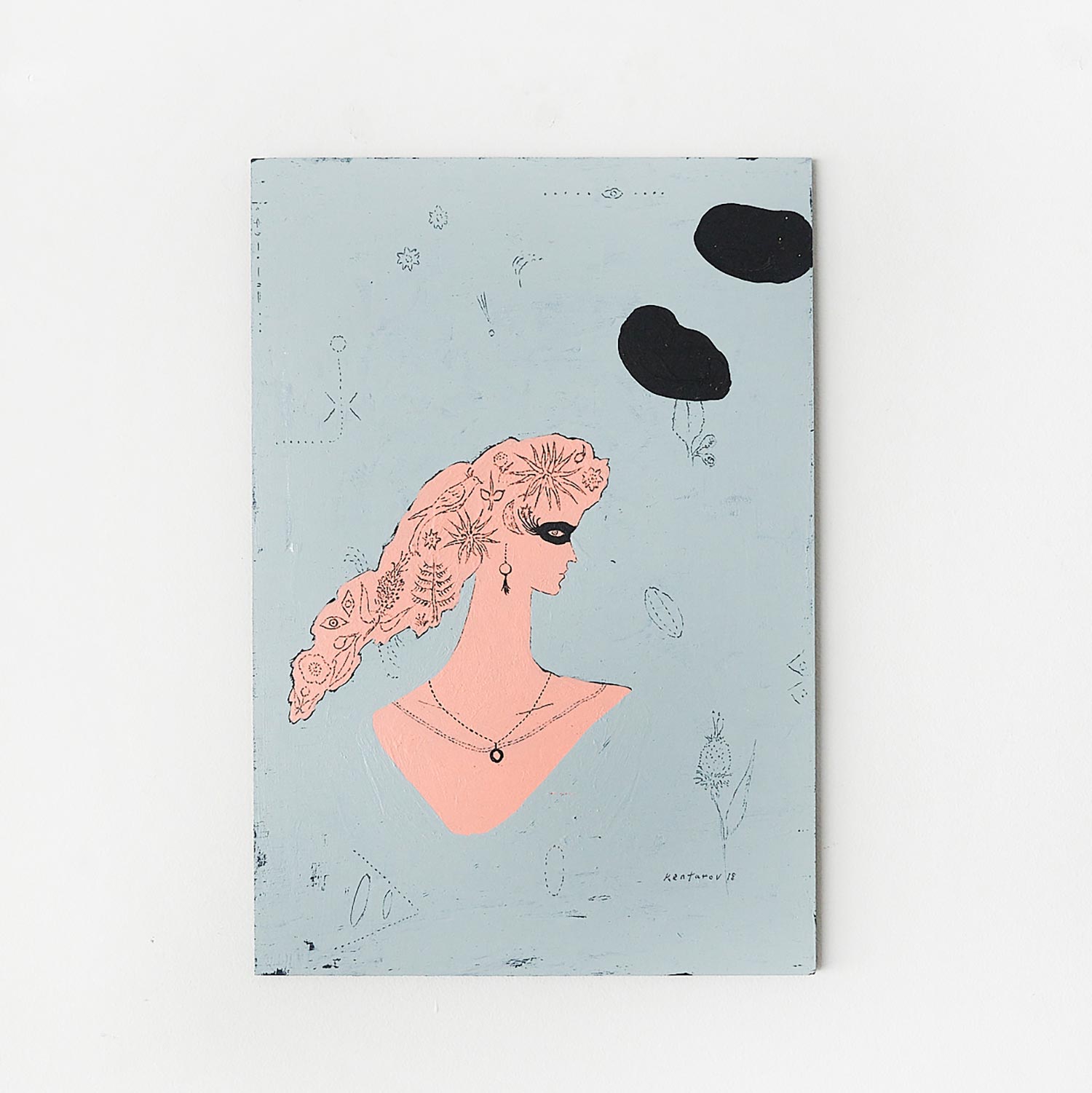 薄い板に描かれた作品。立て掛けても、軽いので画鋲やピンで壁にかけても。植物や鳥、アクセサリーを身に付けた女性、田中健太郎さんの世界が広がります。