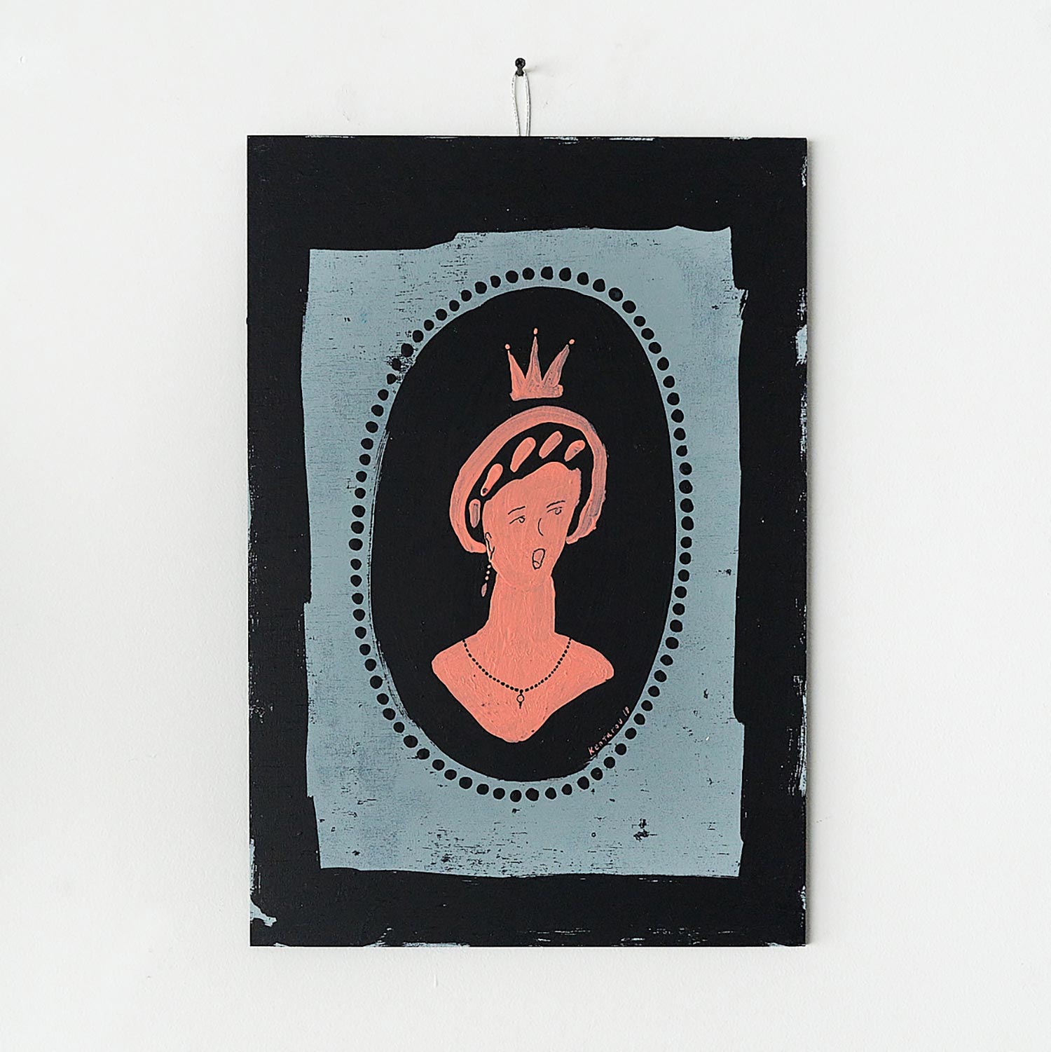 薄い板に描かれた作品。立て掛けても、軽いので画鋲やピンで壁にかけても。歌を歌っているのでしょうか。想像力が掻き立てられる1枚です。