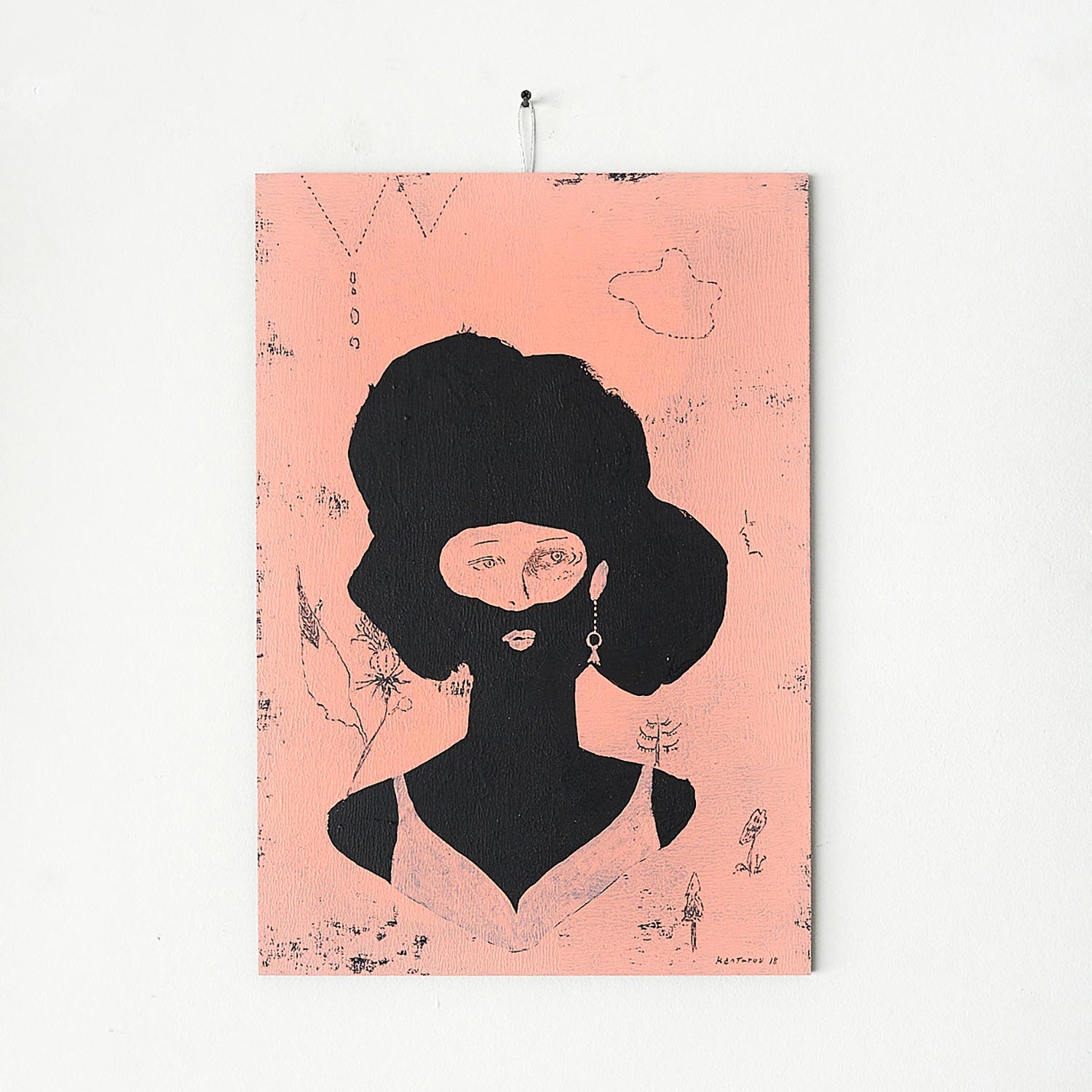 薄い板に描かれた作品。立て掛けても、軽いので画鋲やピンで壁にかけても。大胆な黒の使い方と細い線の植物と女性の表情が印象的です。