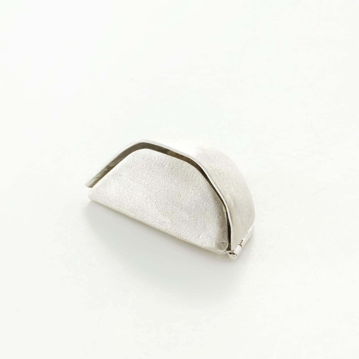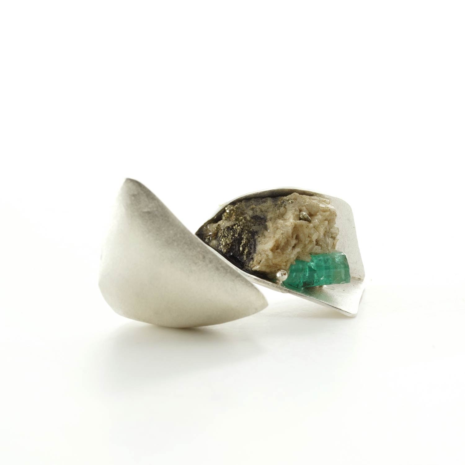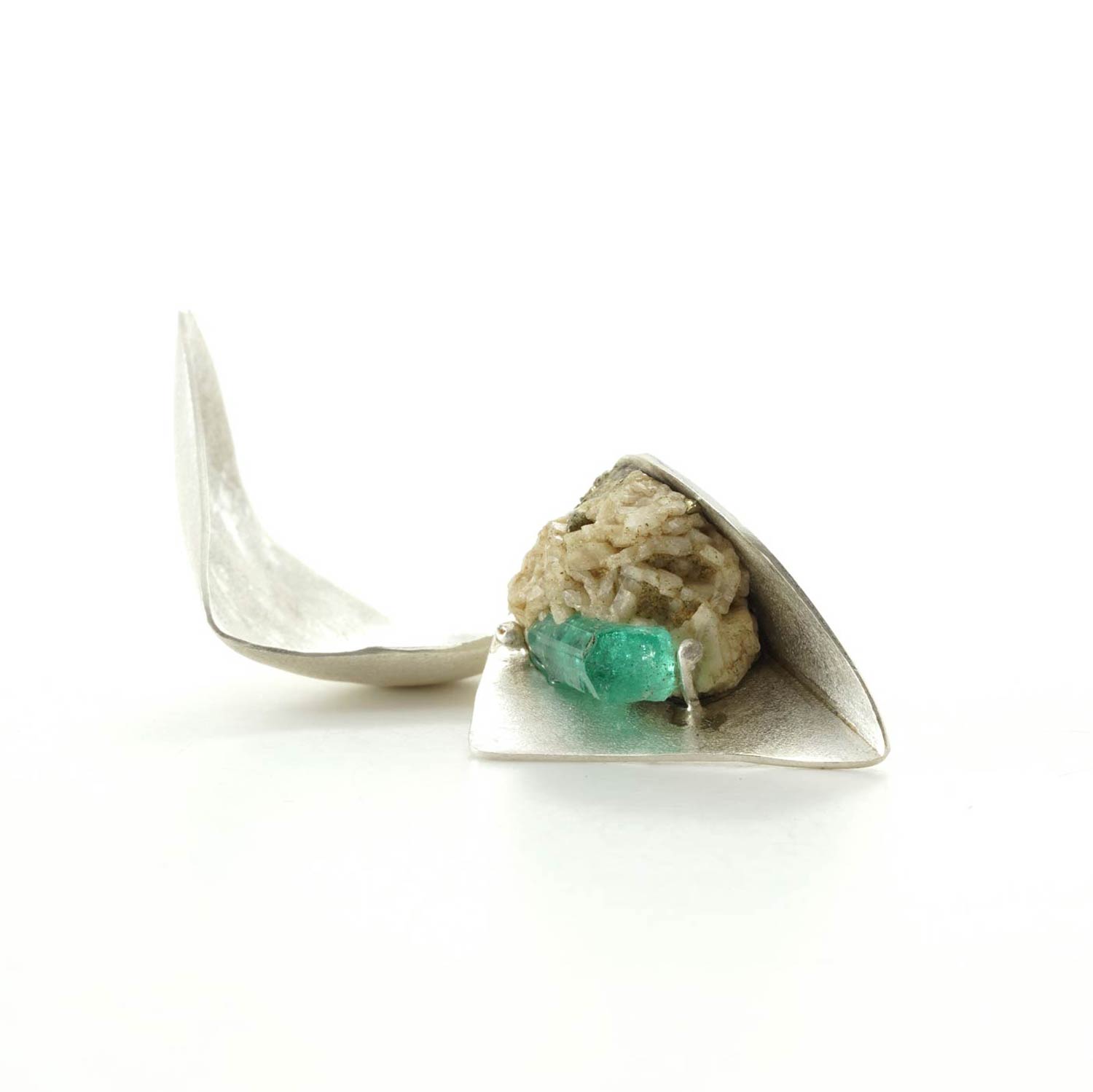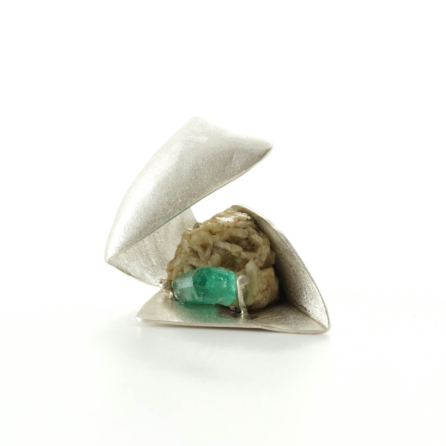 シルバーのシェルターに覆われたエメラルドの原石。蓋を開けると美しいエメラルドが登場します。
