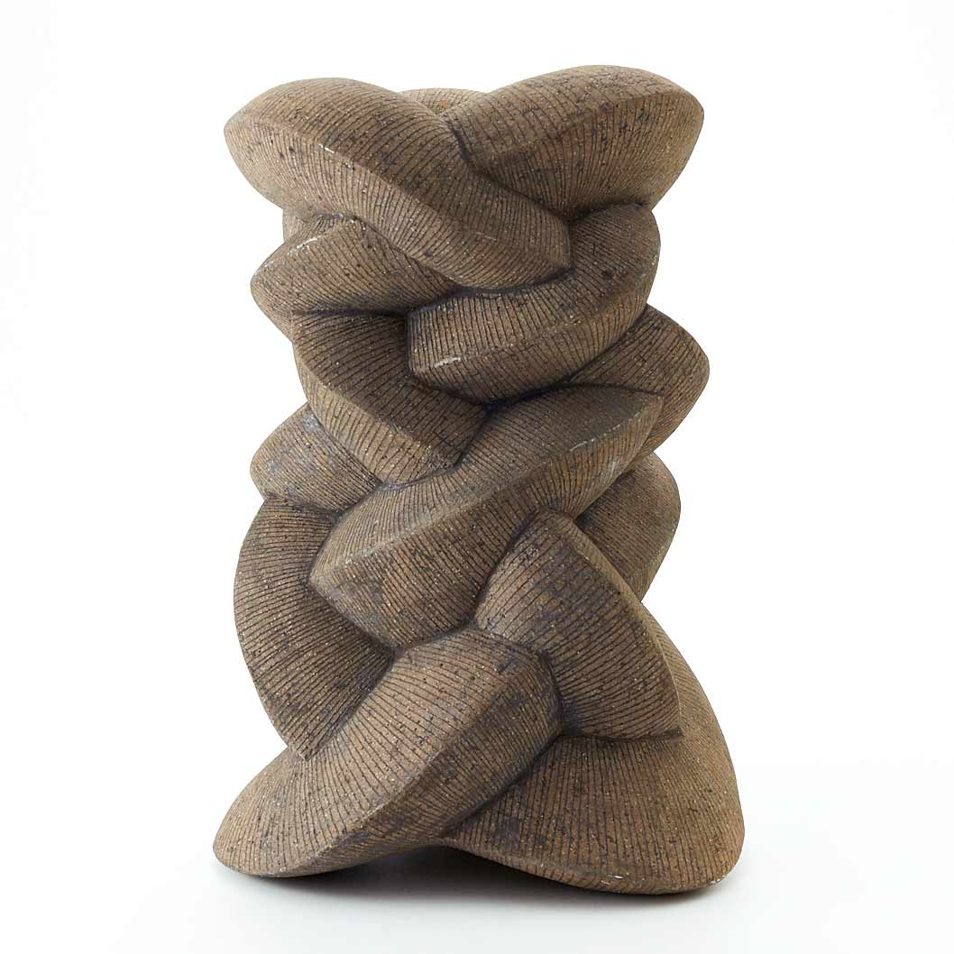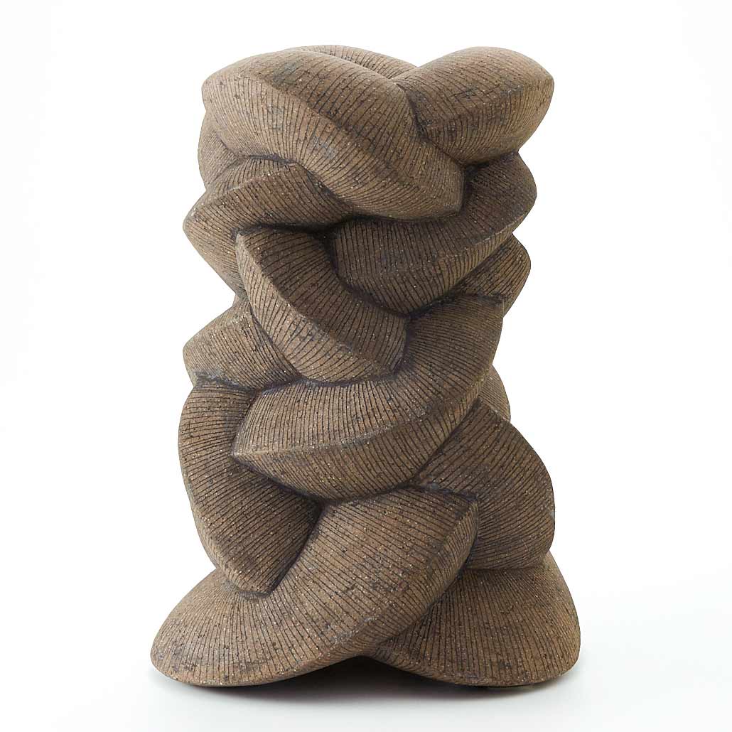 紐作りで成形し炭化で焼き締めた作品。造形美と焼き締めた風合いが魅力。存在感がありながらも落ち着いた佇まいです。