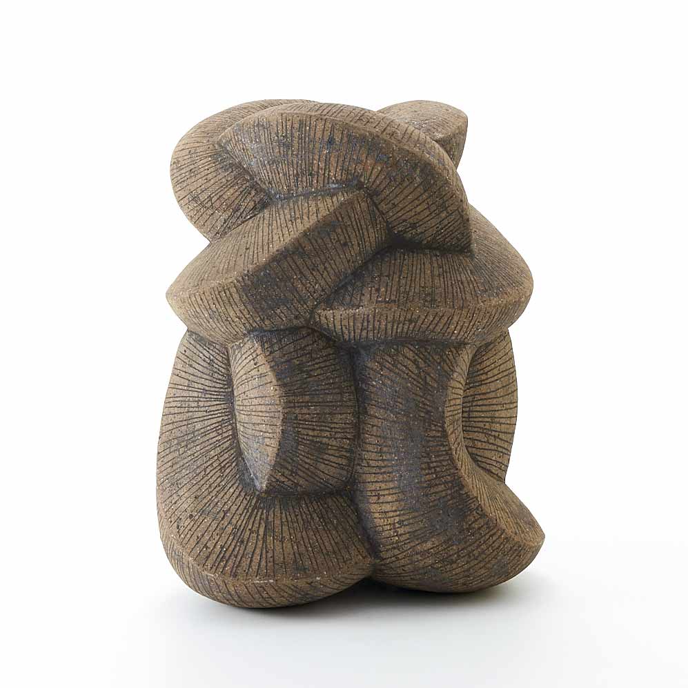 紐作りで成形し炭化で焼き締めた作品。造形美と焼き締めた風合いが魅力。存在感がありながらも落ち着いた佇まいです。