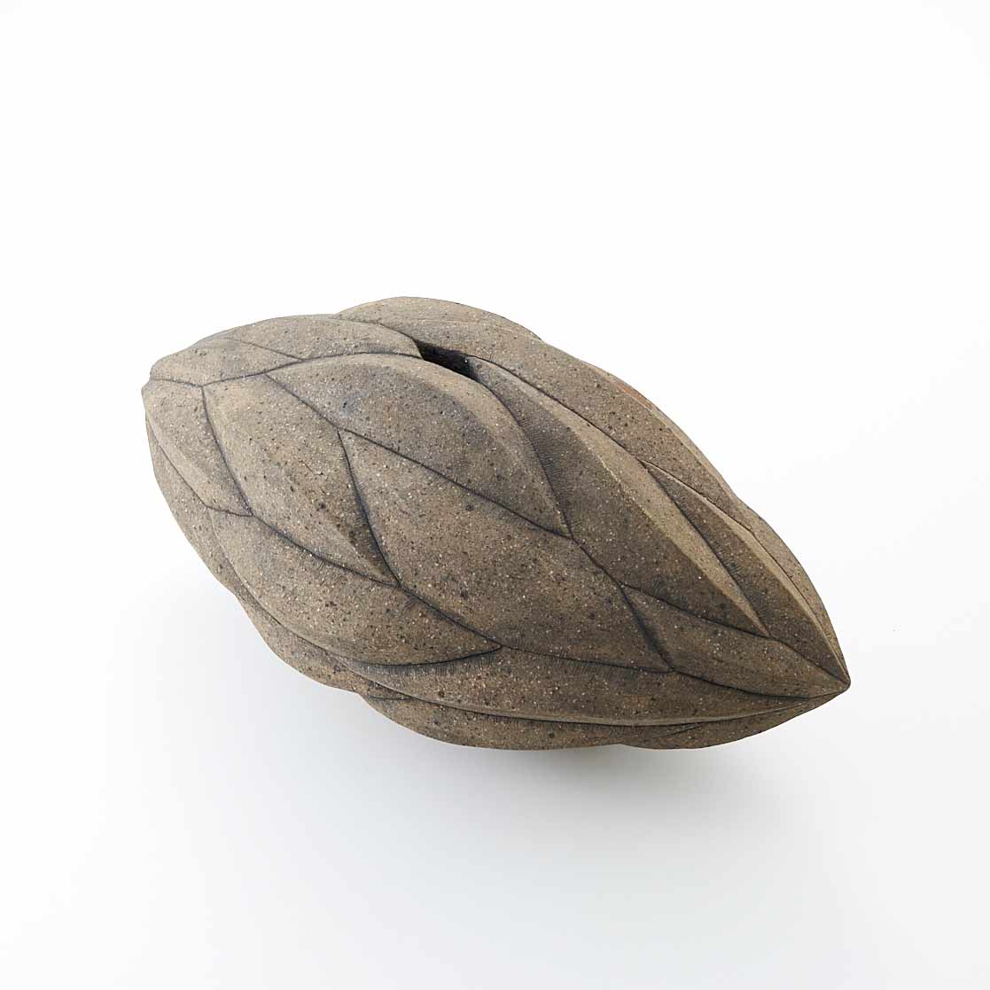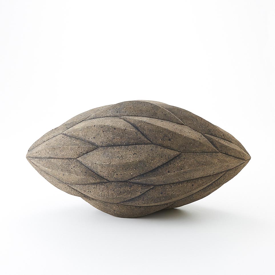 紐作りで成形し炭化で焼き締めた作品。造形美と焼き締めた風合いが魅力。存在感がありながらも落ち着いた佇まいです。