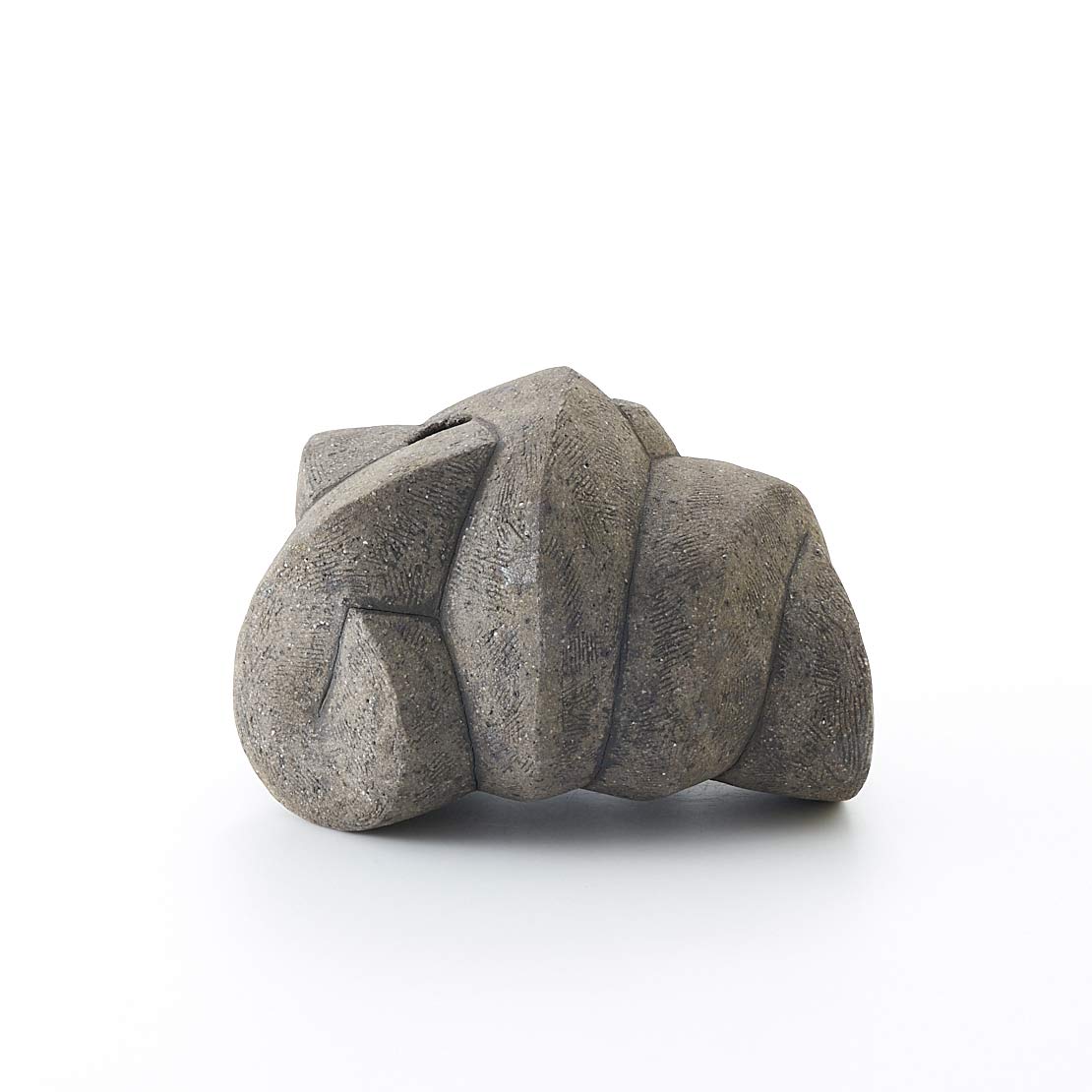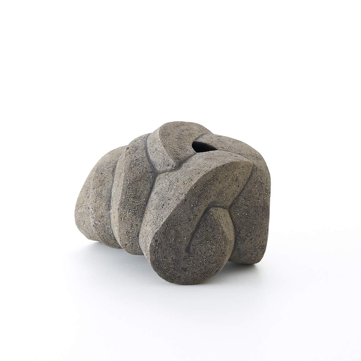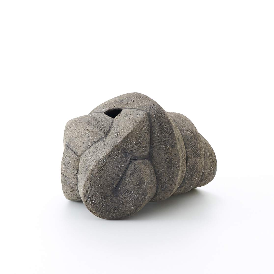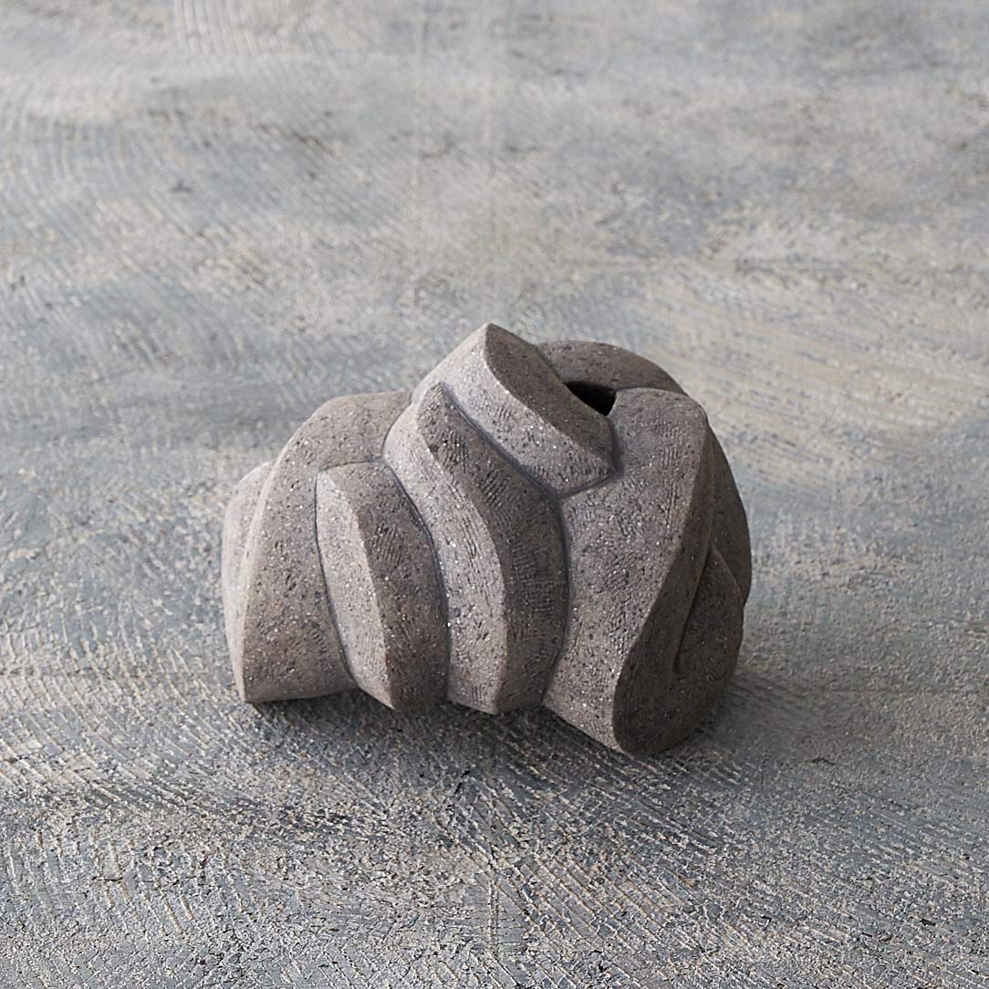 紐作りで成形し炭化で焼き締めた作品。造形美と焼き締めた風合いが魅力。存在感がありながらも落ち着いた佇まいです。