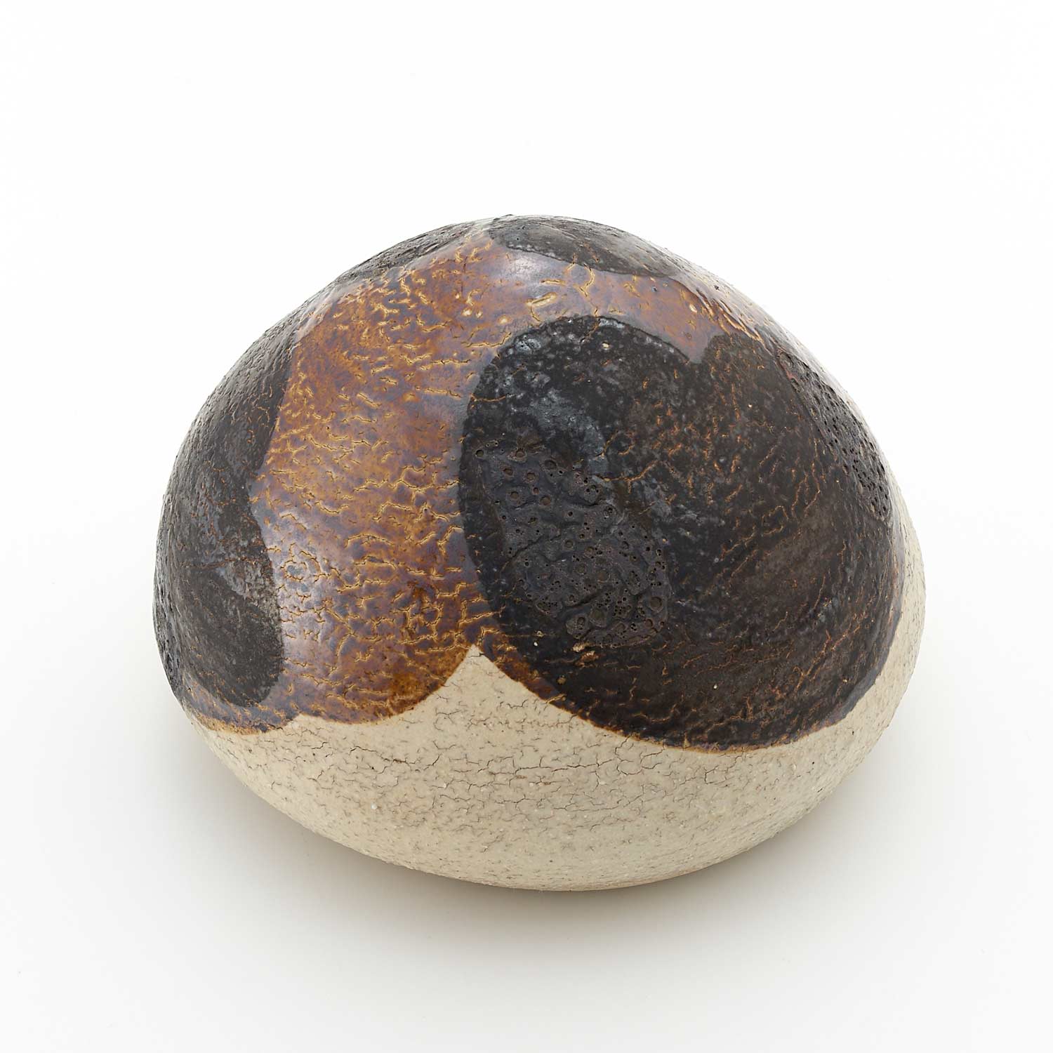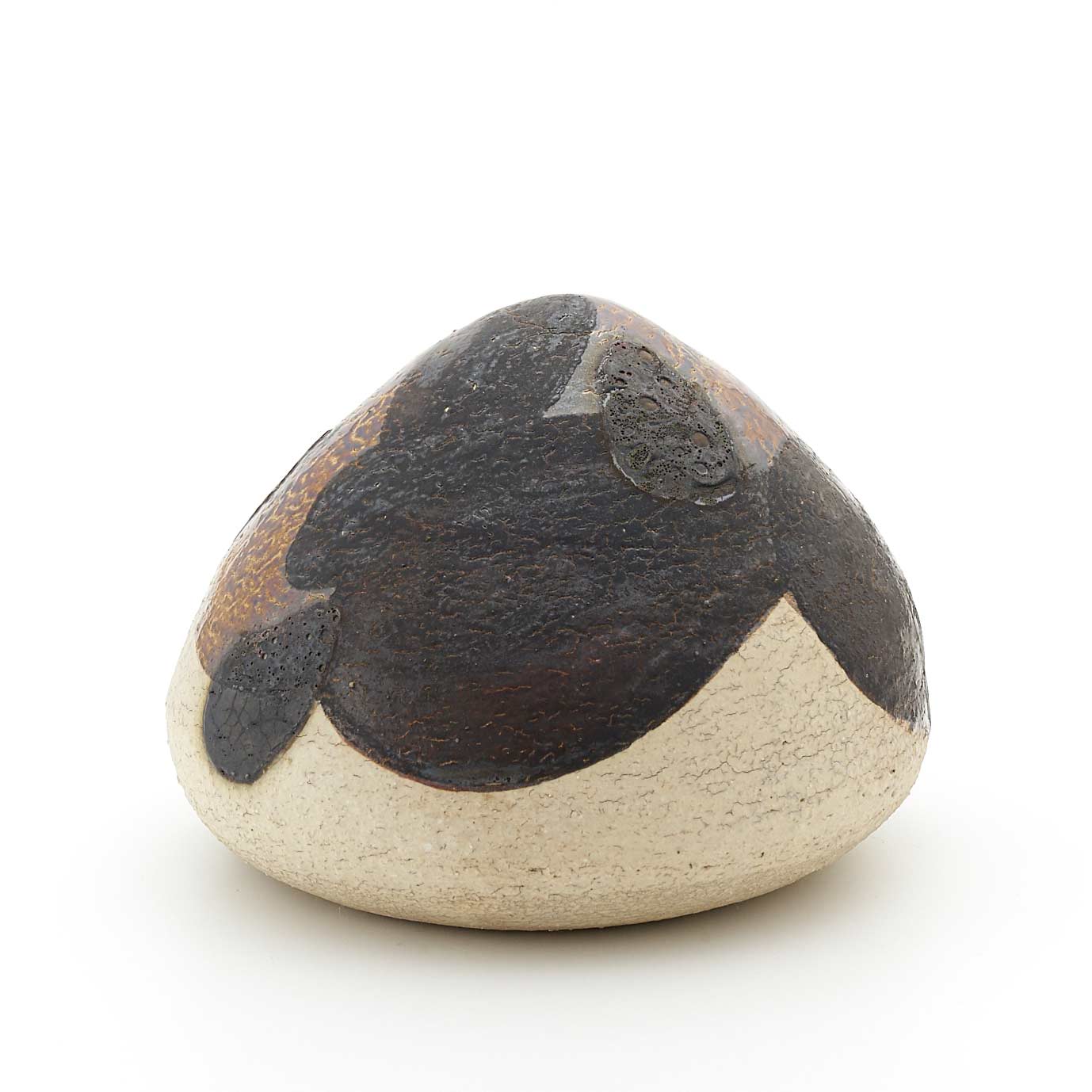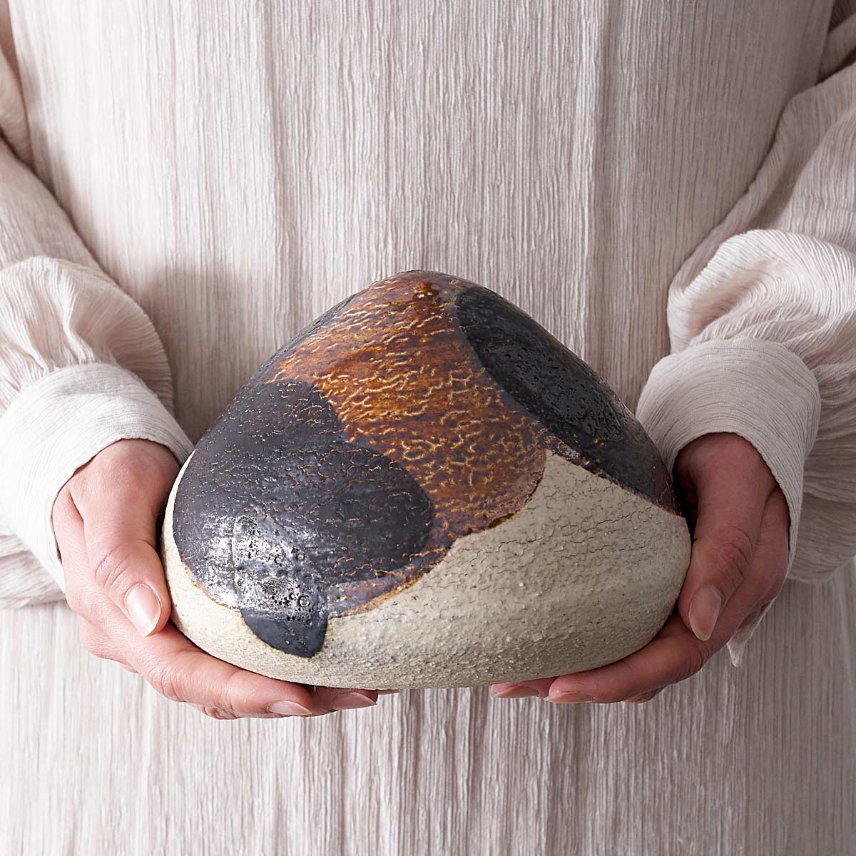 角の無いやさしい円柱に黒と茶で模様が描かれています。形と色がマッチした撫でたくなる愛らしい作品です。
