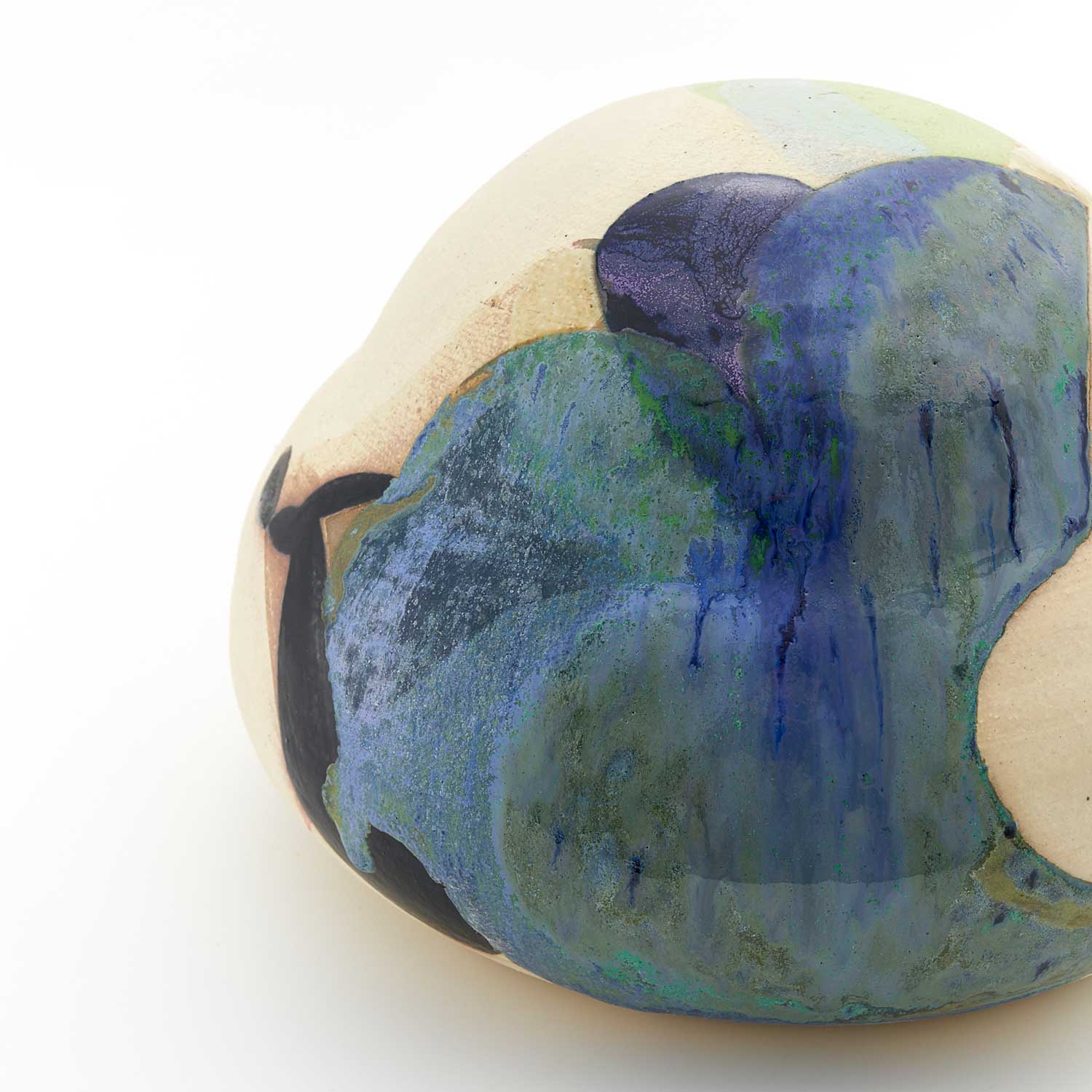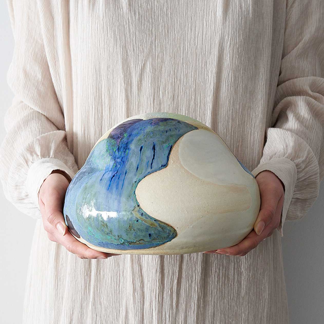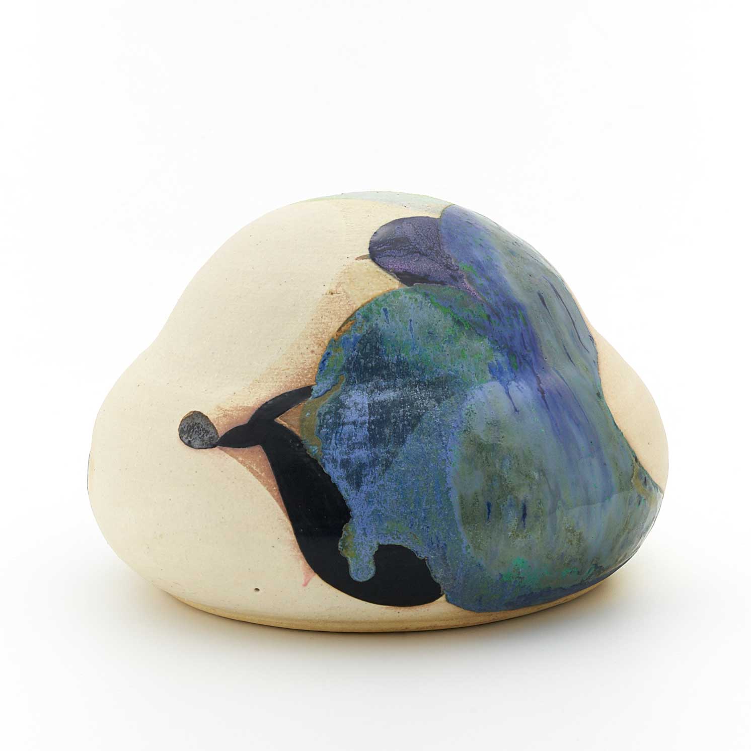 2段になった柔らかな形に、塩谷さんらしい模様が釉薬で構成されています。釉薬の重なりや流れがとても美しい作品です。