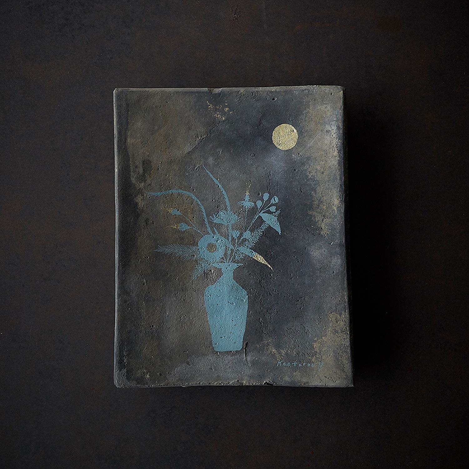 山梨の老舗瓦屋の五代目から提供された50年から100年前の瓦に描かれた作品。瓦の色味が闇の様で金色で描かれた月が輝いています。