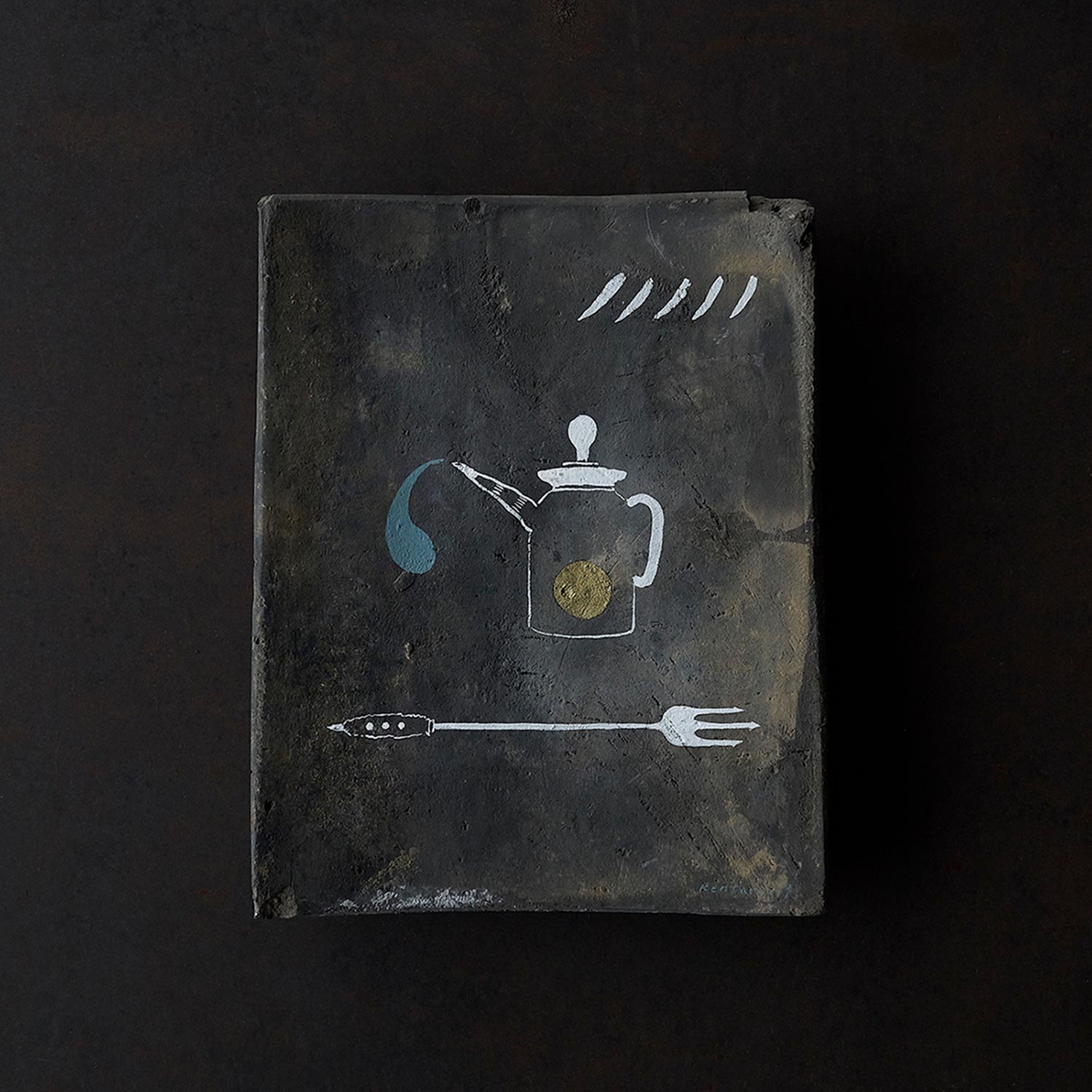 山梨の老舗瓦屋の五代目から提供された50年から100年前の瓦に描かれた作品。愛らしいポットとフォークを眺めていると、美味しいお菓子でも作りたくなります。