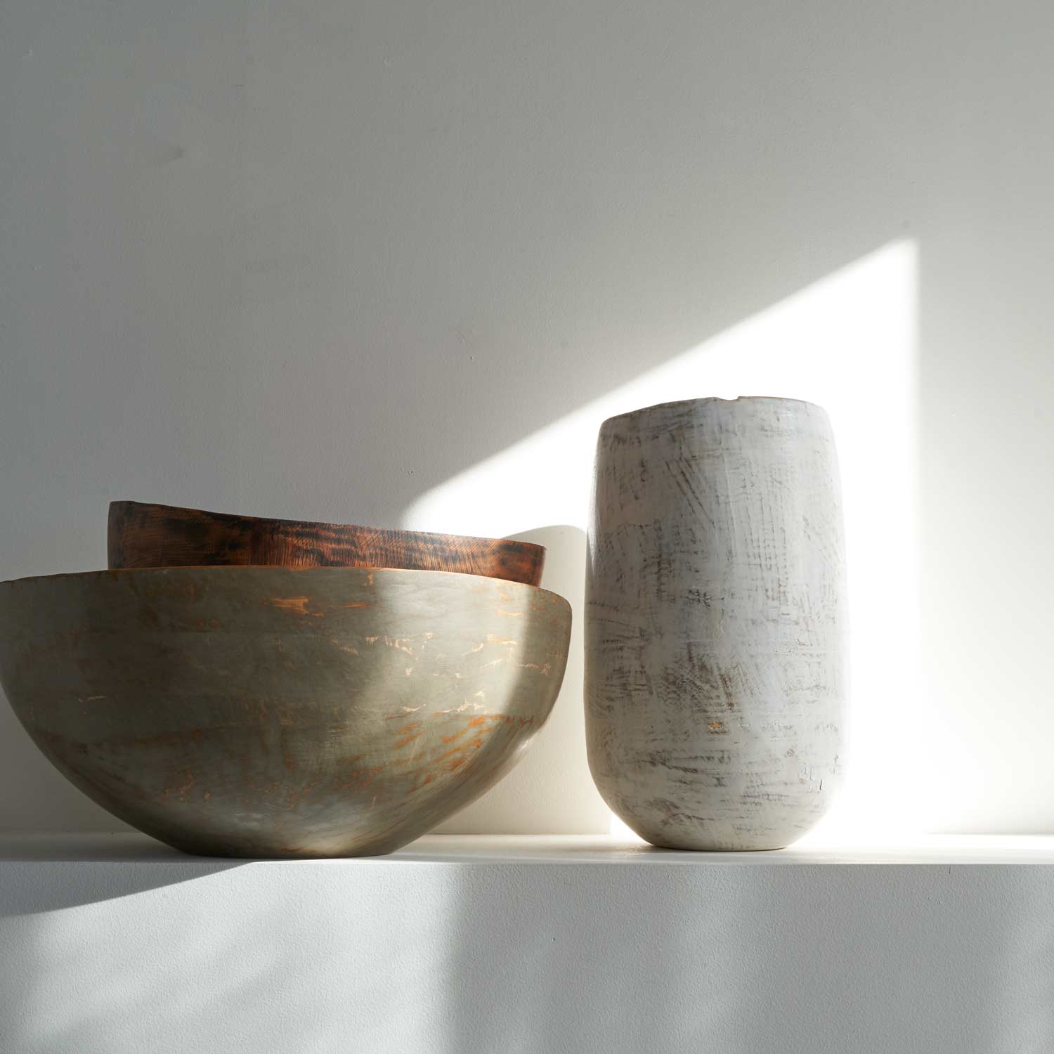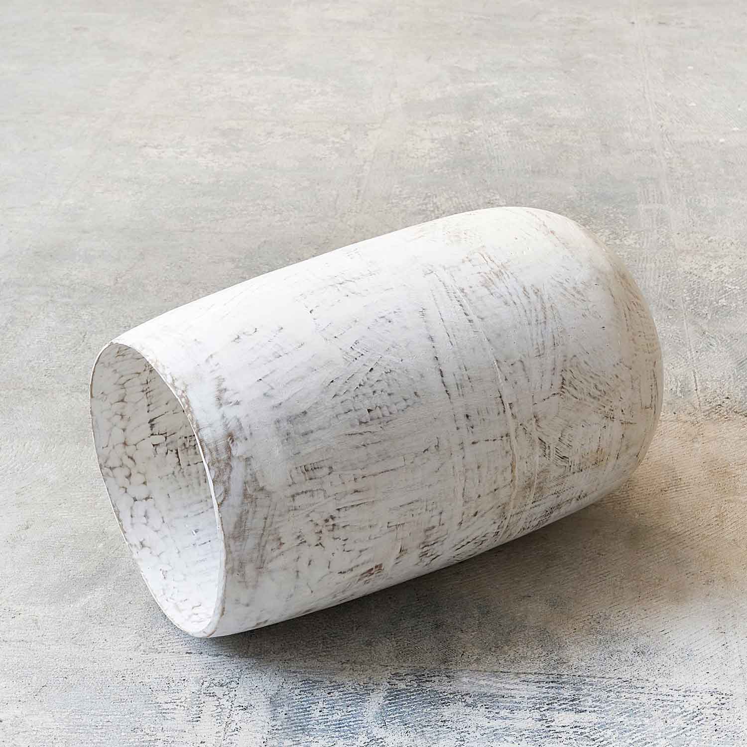 白化粧を施したような木の器です。 木を接ぎ合せて、木工旋盤、ノミ、カンナで成形し、胡粉+ウッドコート(水ガラス)を塗布しています。耐水性はありますが、水は入れられません。植物を活ける際は落としなどをお使いください。