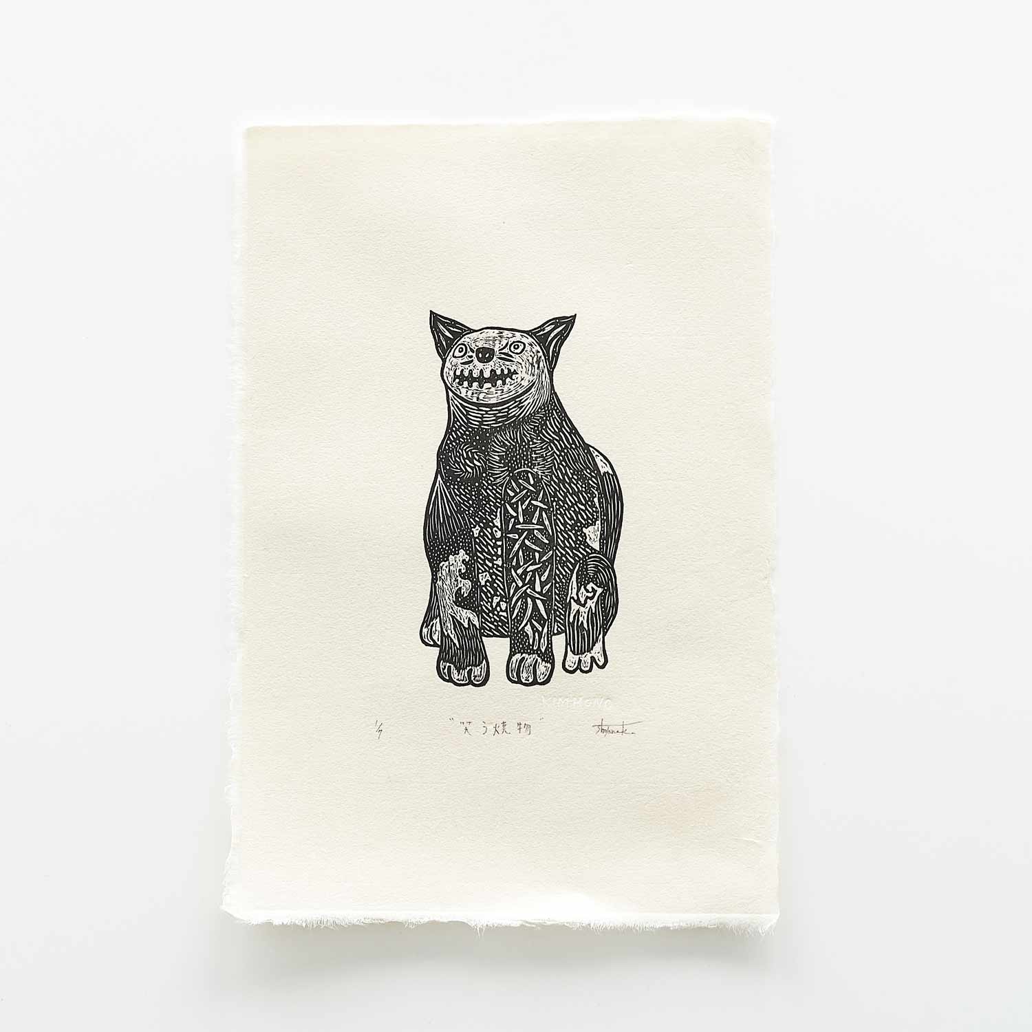 [KIM Hono collaboration work] This is a woodblock print that TANAKA created after fieldwork in Mr. KIM's studio.The title of this piece is "Laughing Pottery. The motif is the animal pottery in Kim's studio. It is a charming work.Limited edition of 7 copies.