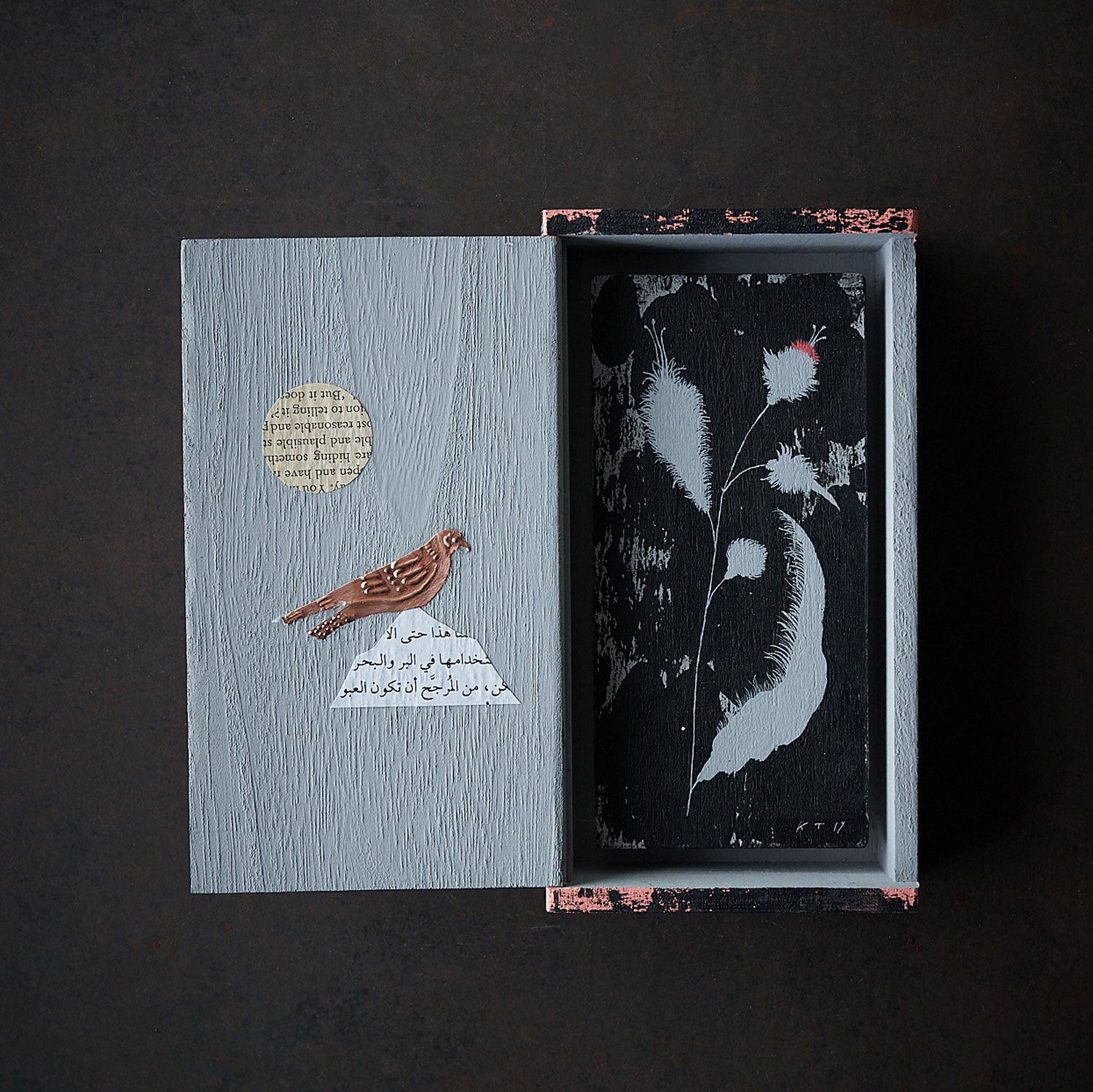 The work was painted on a wooden box. The pink and black box is a striking piece.