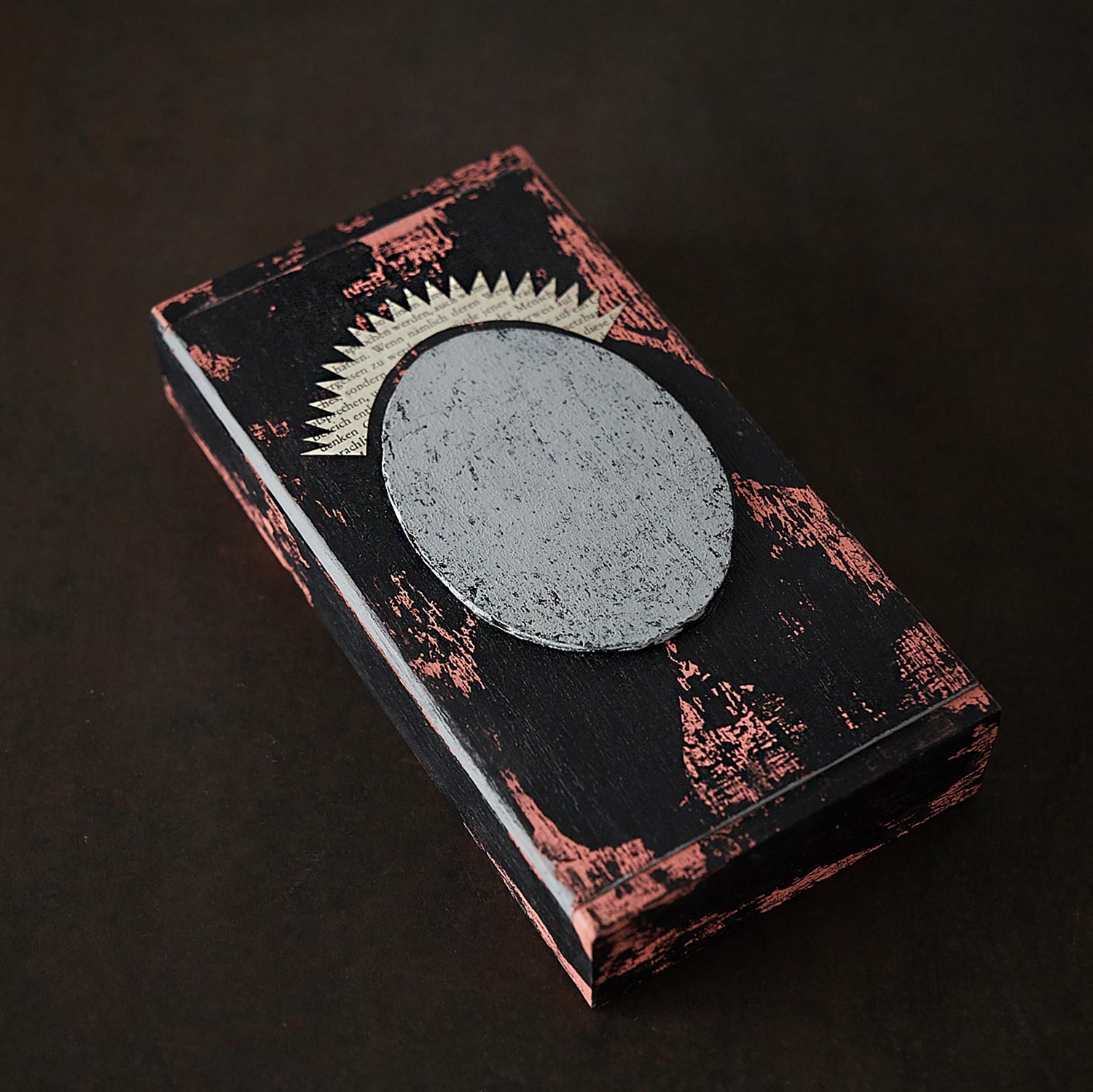 木の箱に描かれた作品。ピンクと黒の箱が印象的な作品。。