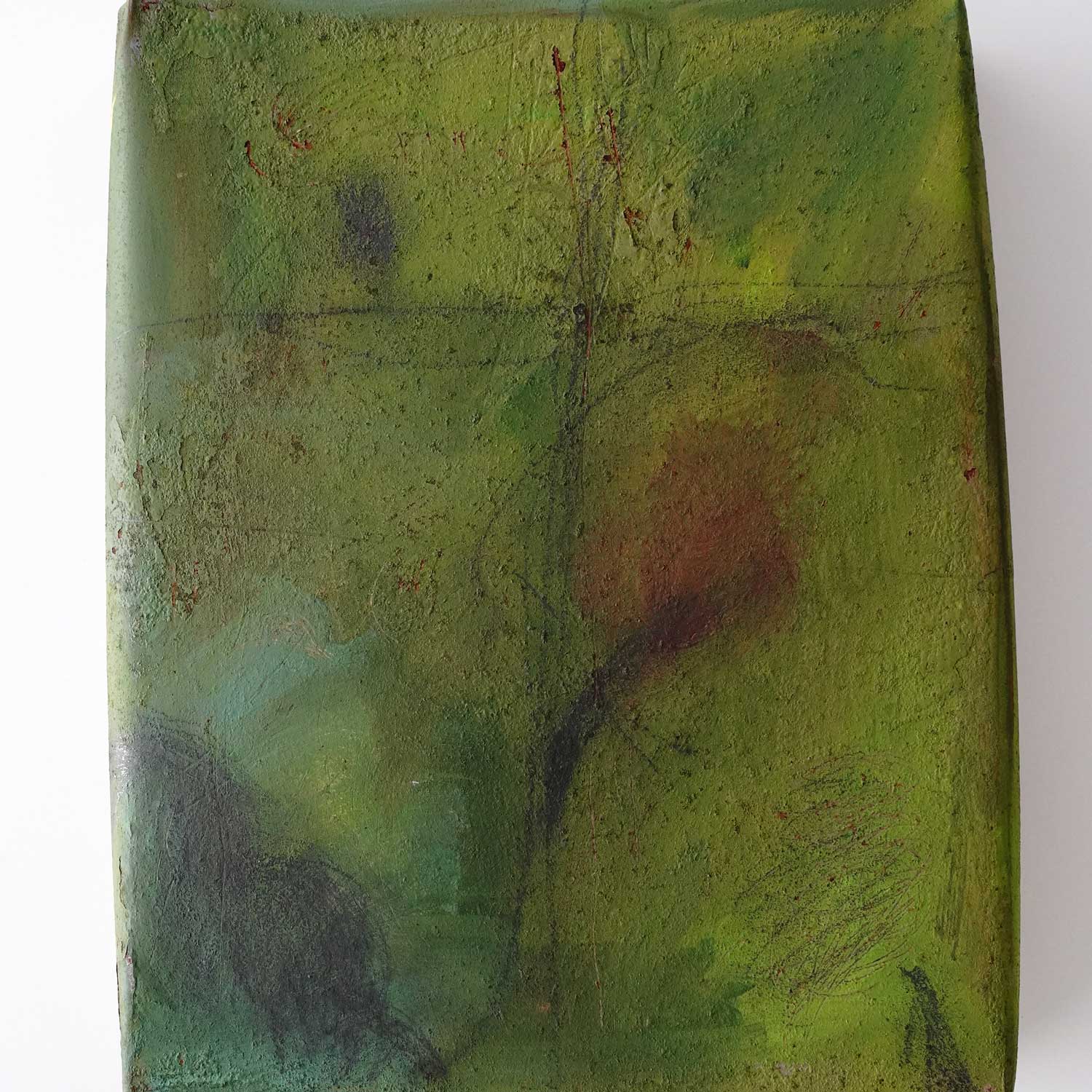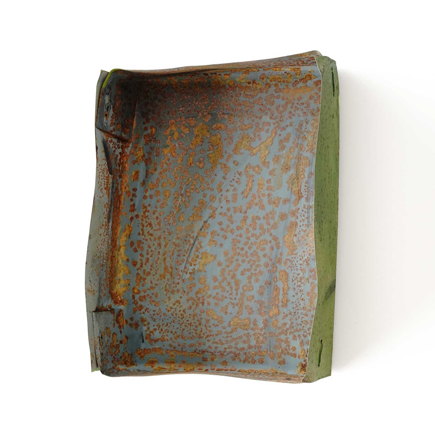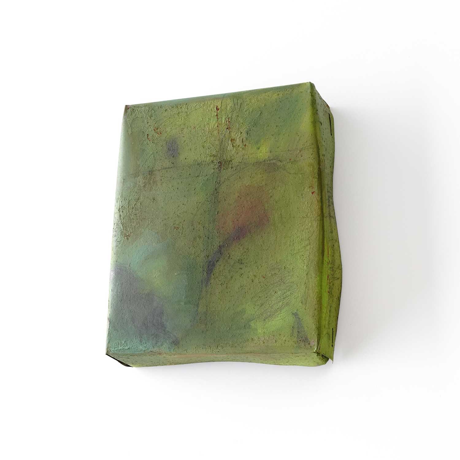 A box-shaped piece made of thin, painted iron sheets. A faint cross appears on the surface. It can be placed on a table or hung on a wall.
