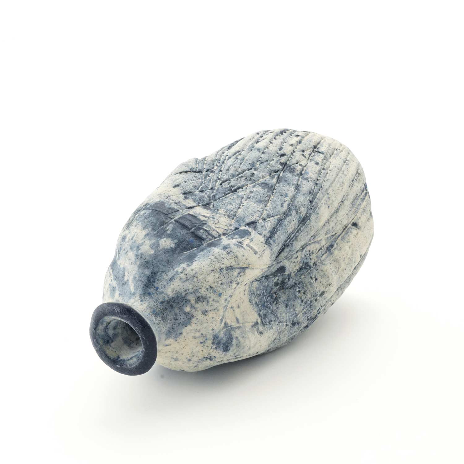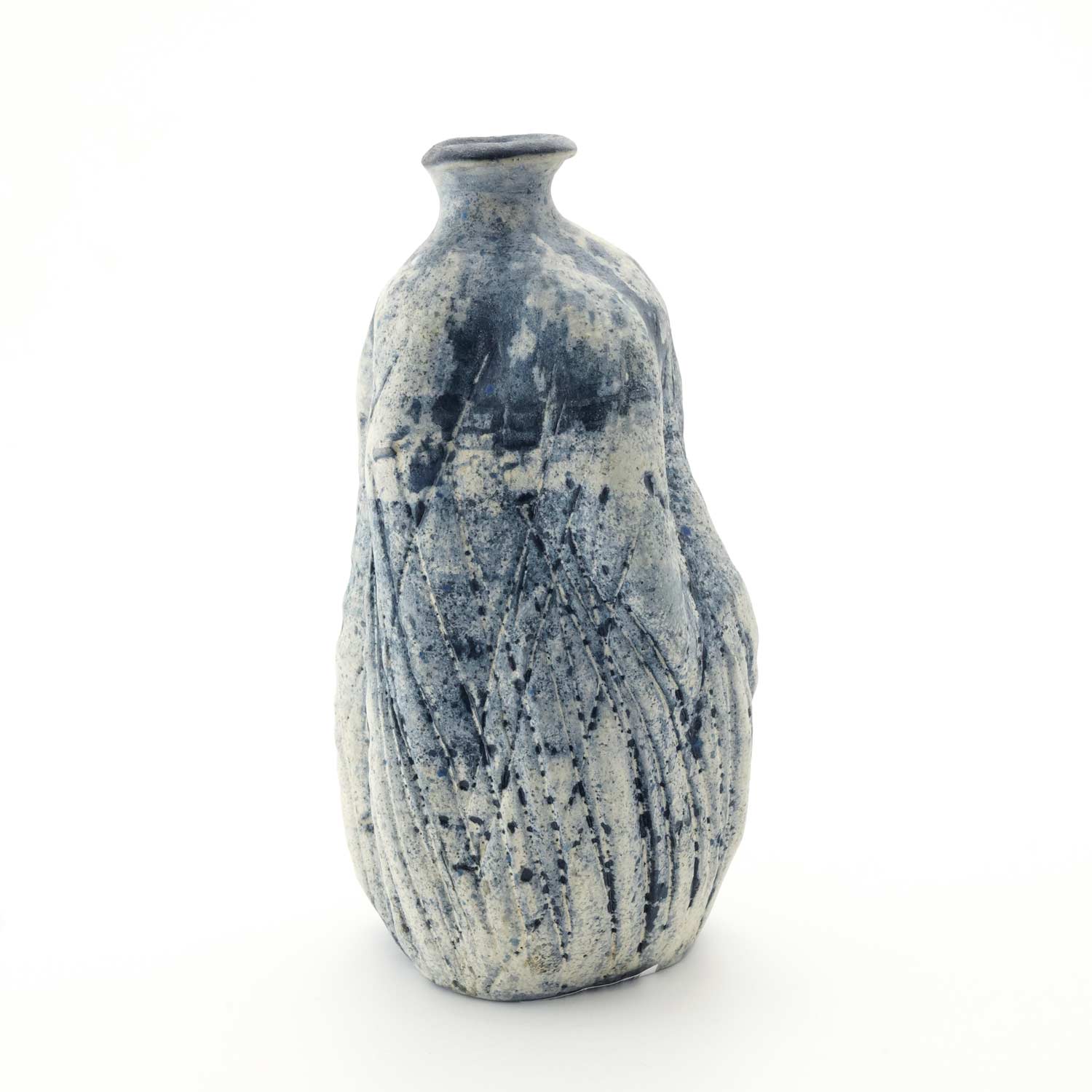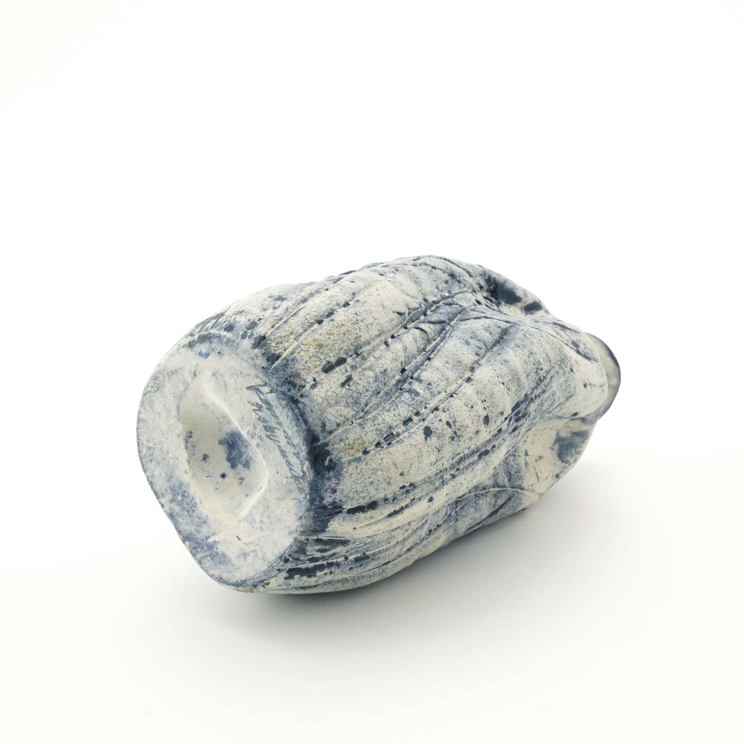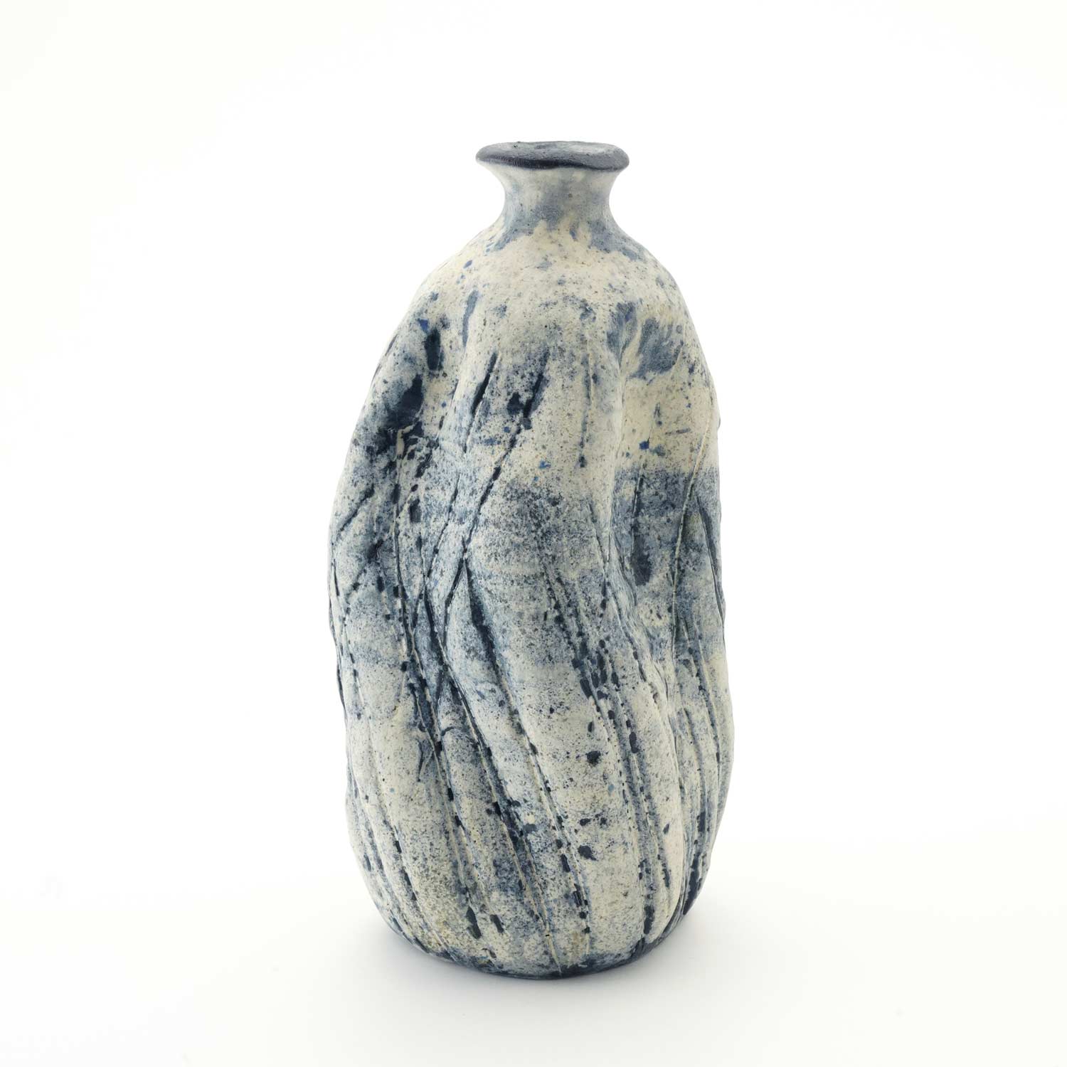 沖縄の素材にこだわり器作りをする紺野さん。白土をベースに紺と白化粧で加飾した花器です。瓶のような形に捻りを加えたフォルムです。線状に入った模様もきれいです。