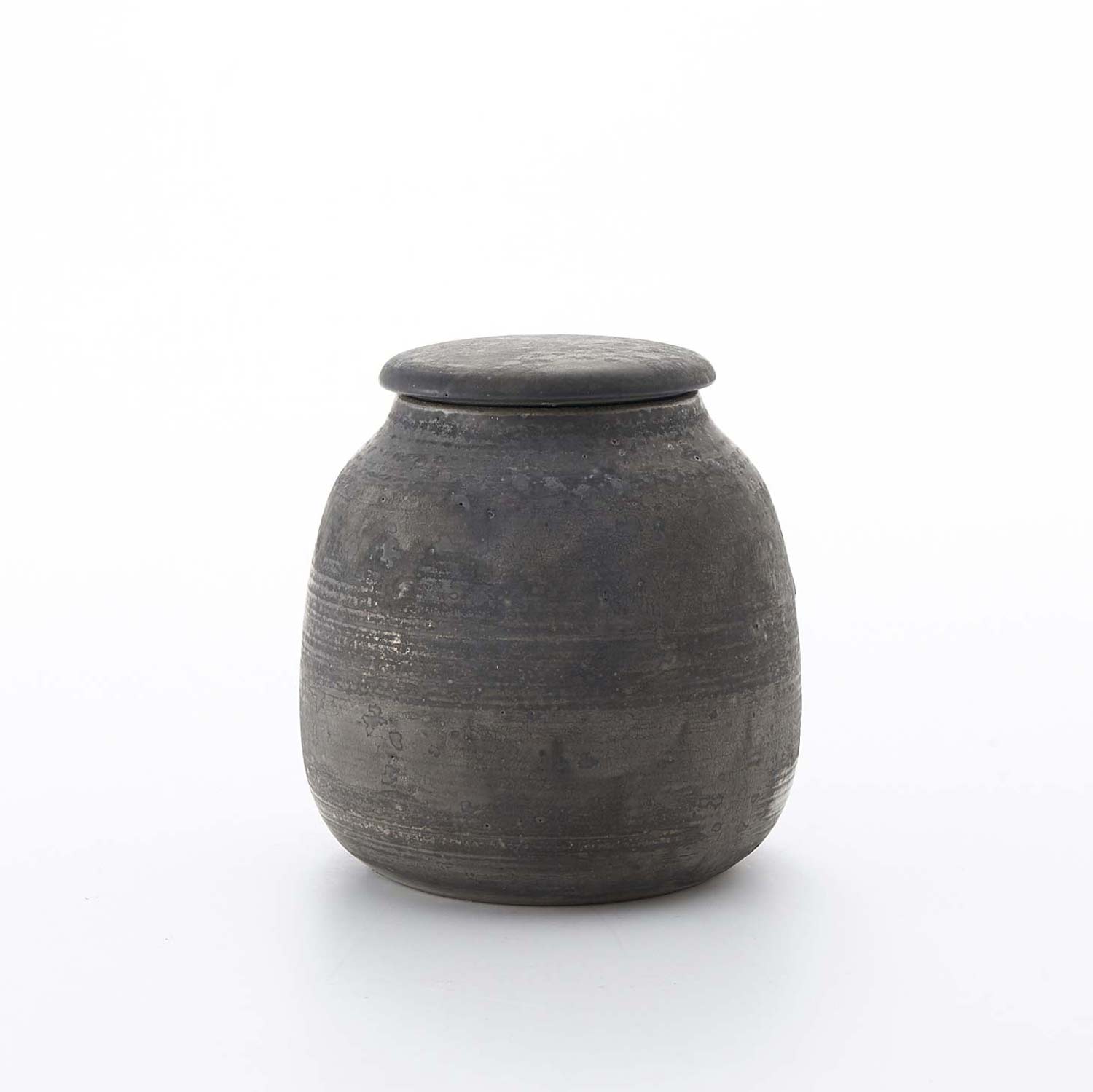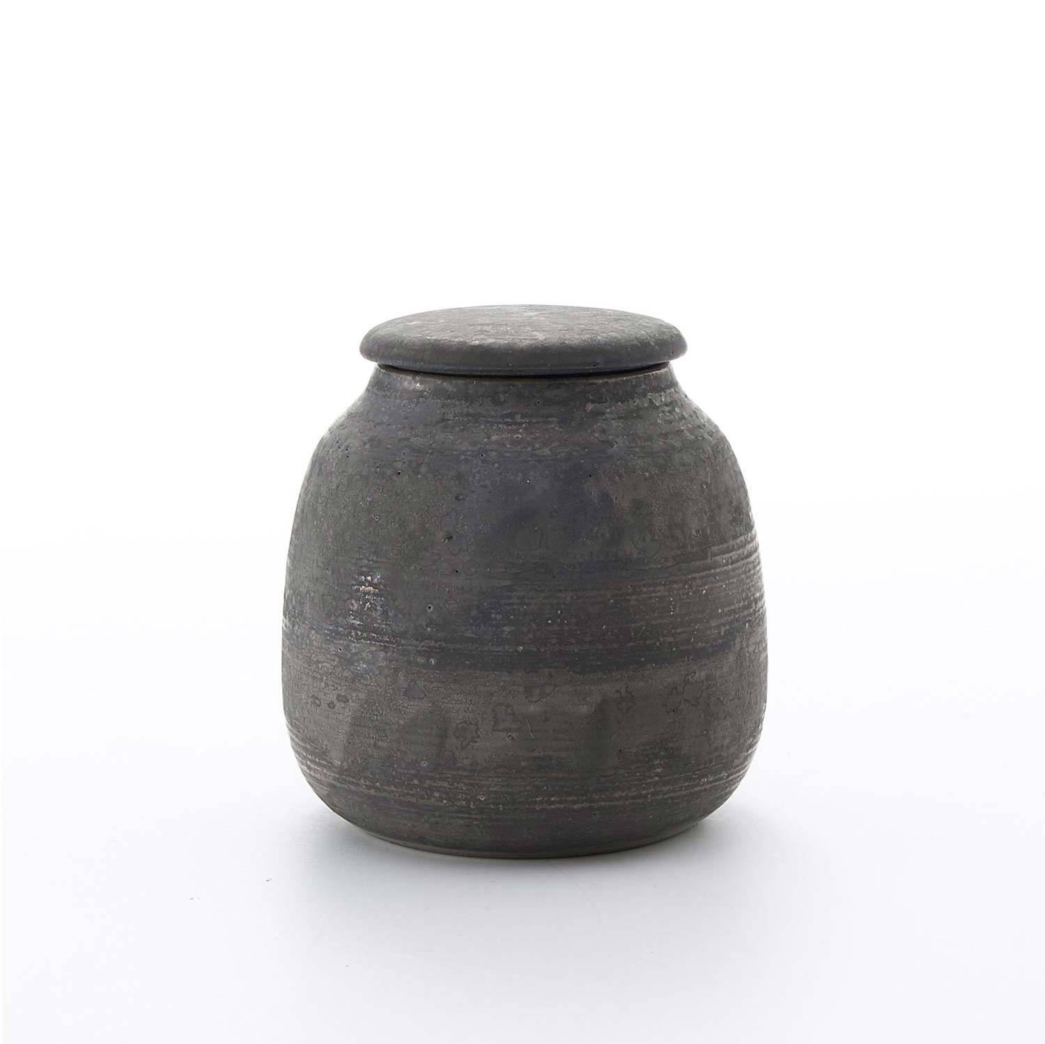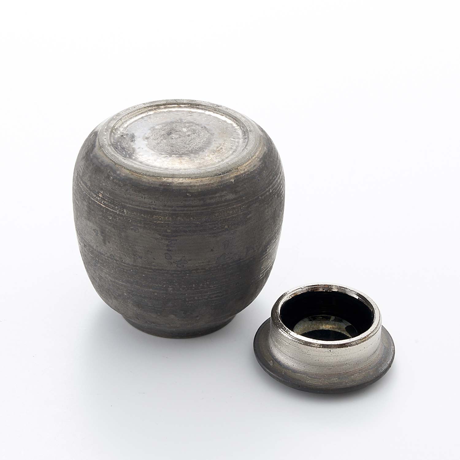 プラチナ彩を施した棗サイズの蓋物。表面の渋い雰囲気とは対照的に、蓋を開けると中は黒い釉薬が艶やかさを放っています。何かを自由に入れる容器ではありますが、蓋を閉じている姿はオブジェでもあります。
