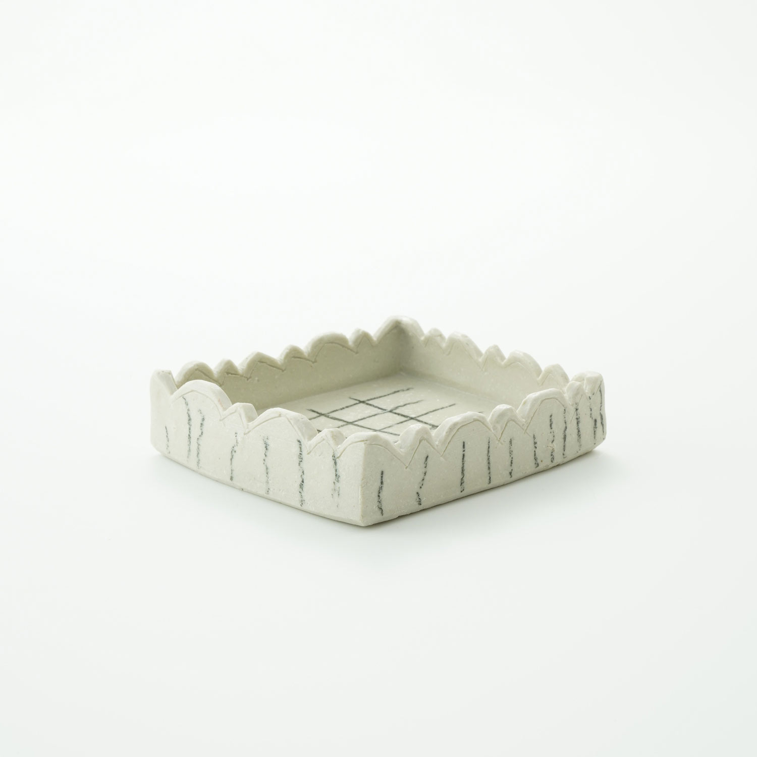 タタラ成型とロクロ成型の組合せで形を作り、パステルで線を描いています。ナッツの盛合せやオリーブにどうぞ。パステルのラインと縁の形が絶妙なセンスです。