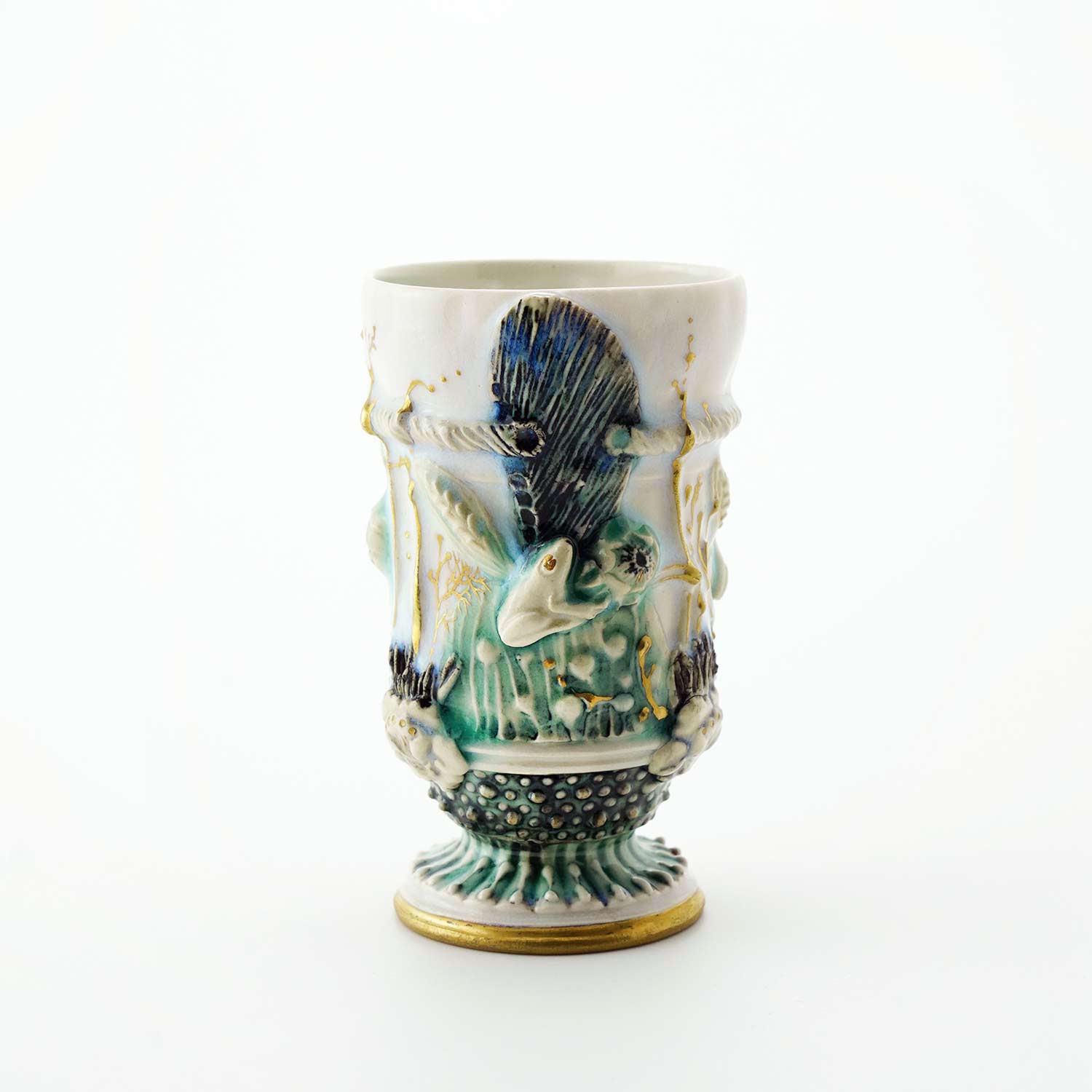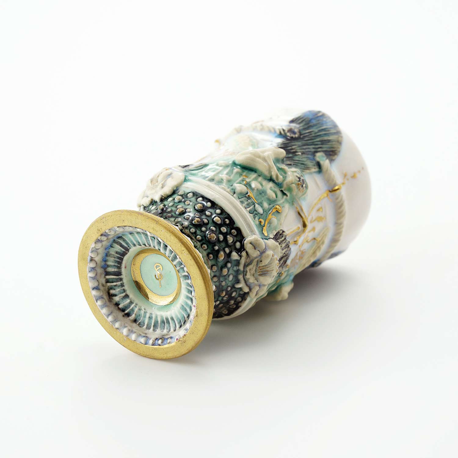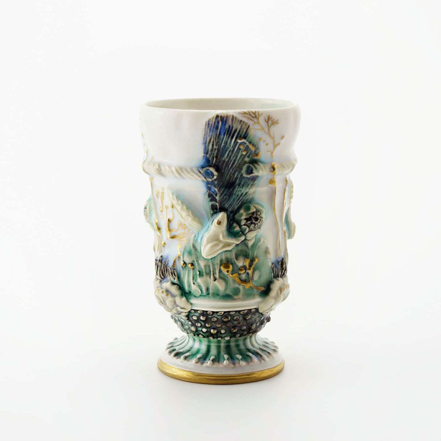 側面の装飾は即興的に施されているので、同じものは一つとしてありません。その儚い美しさから「モノノアワレ」というタイトルがついています。酒杯にもなります。